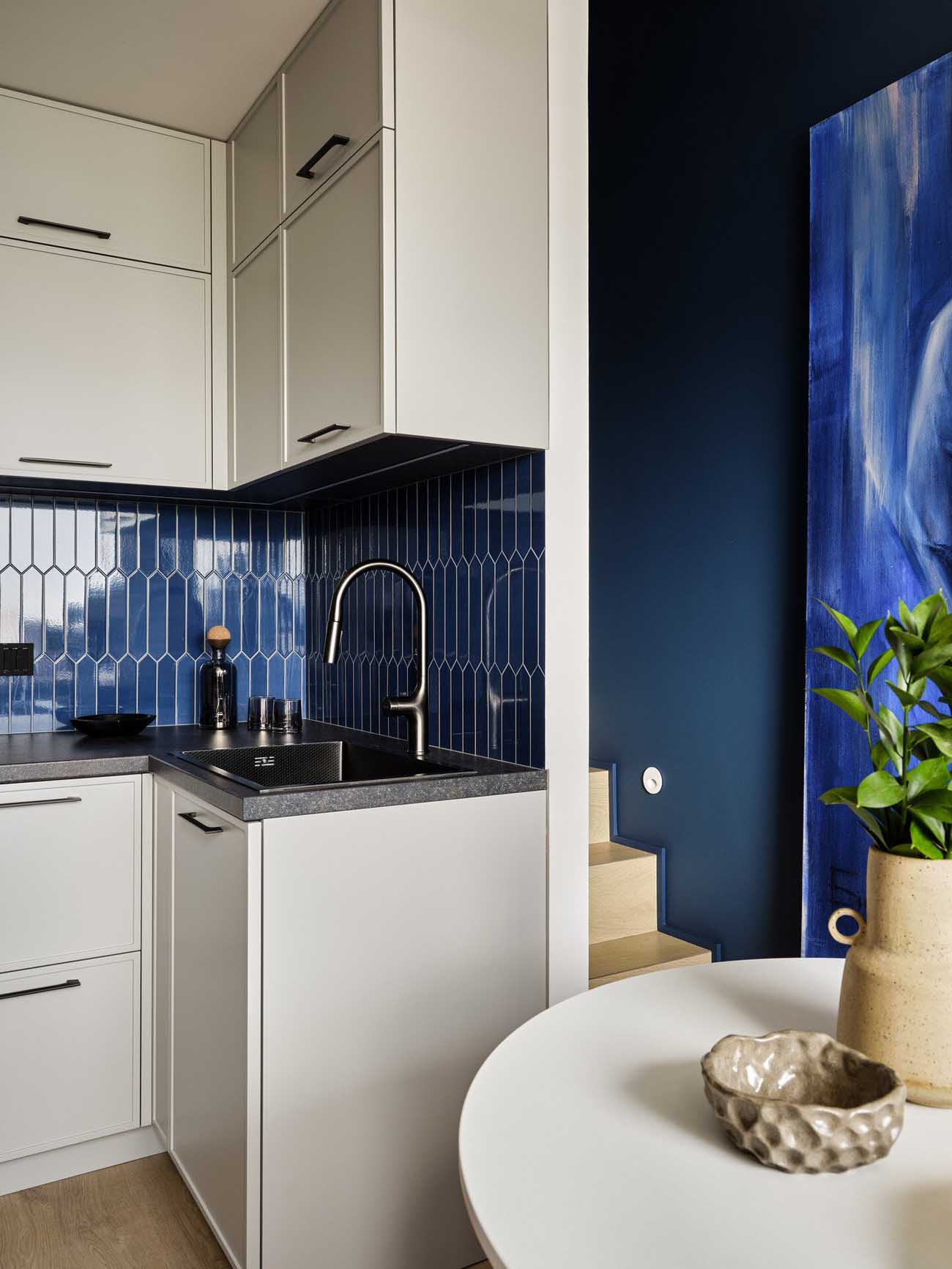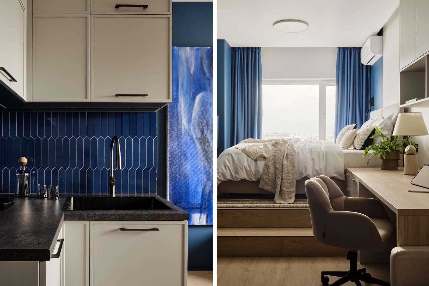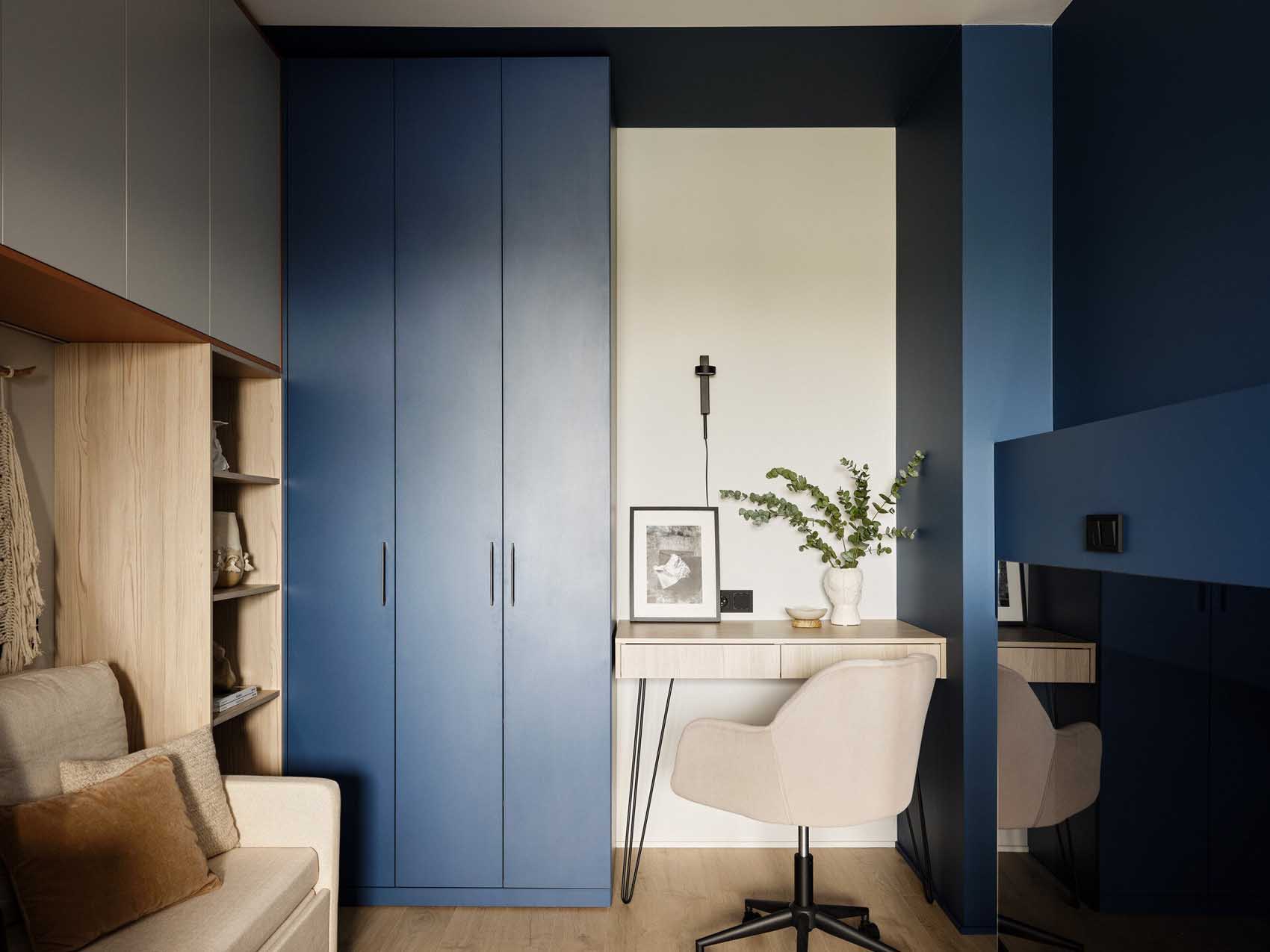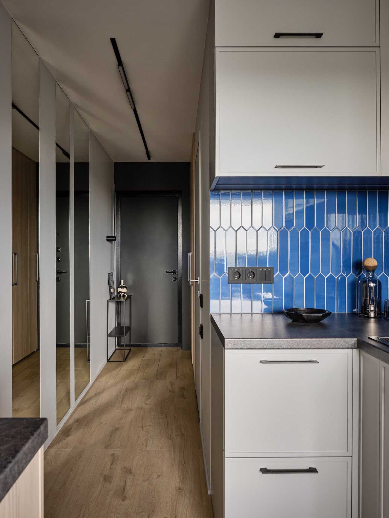 A tervezők különös figyelmet fordítottak azokra a megoldásokra, amelyek vizuálisan növelik a lakás alapterületét és mélységet adnak a térnek. Erre a célra tökéletesen megfelelt a falak és bútorok komplex, hűvös kék árnyalata. Ezt a domináns színt világos, semleges tónusok és a fa meleg árnyalatai egészítik ki.