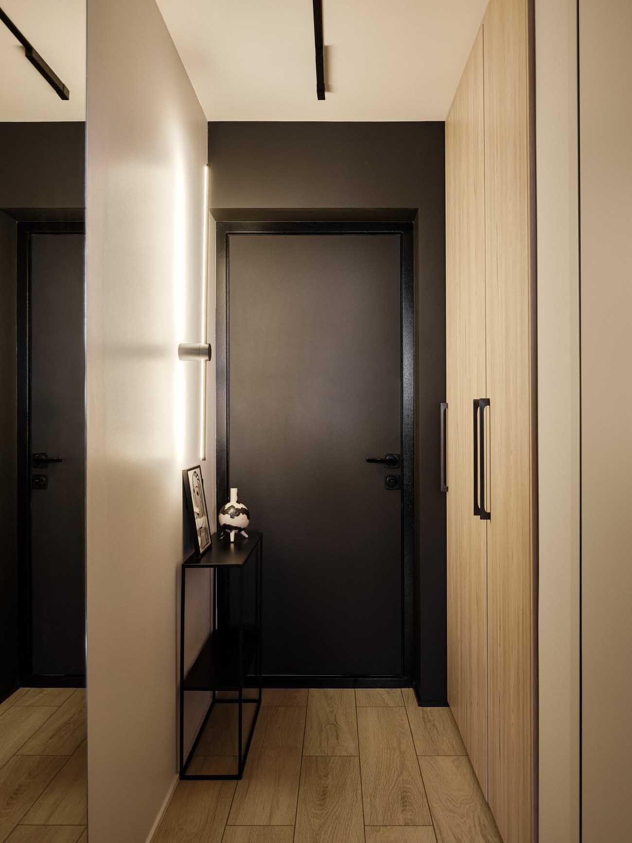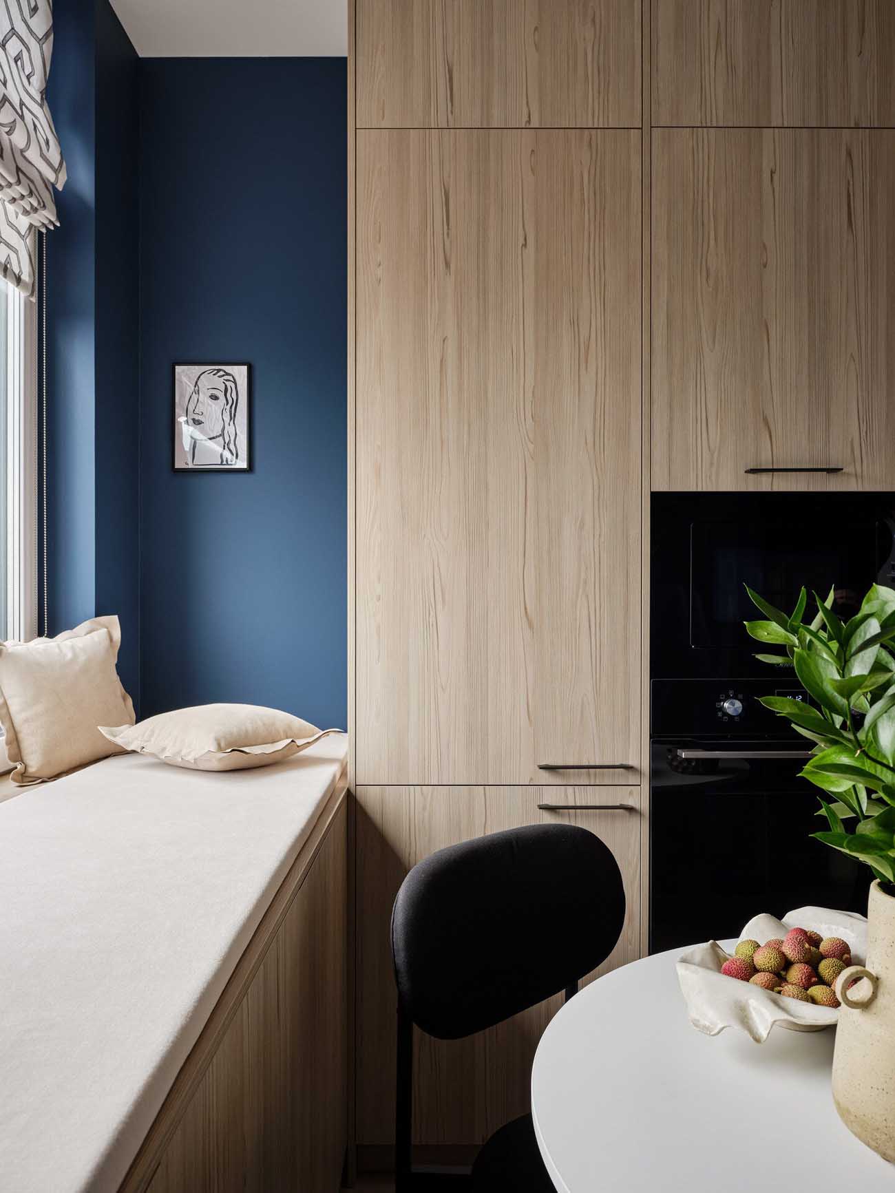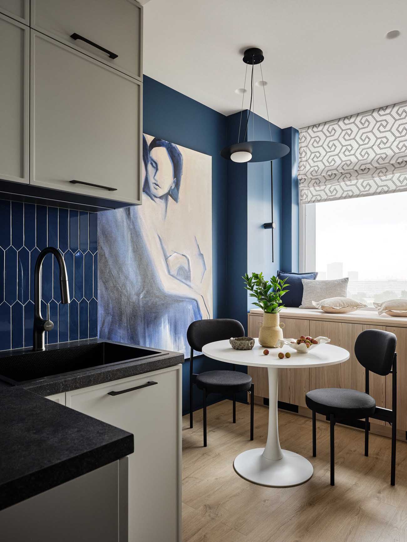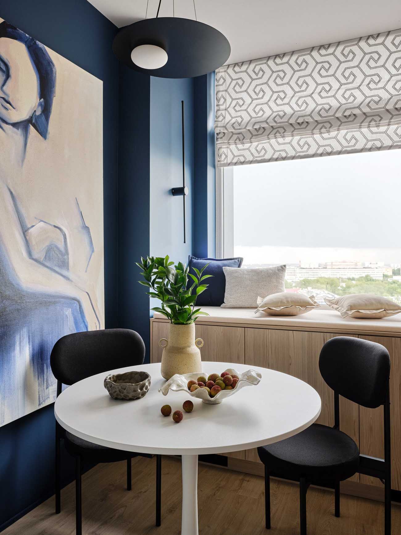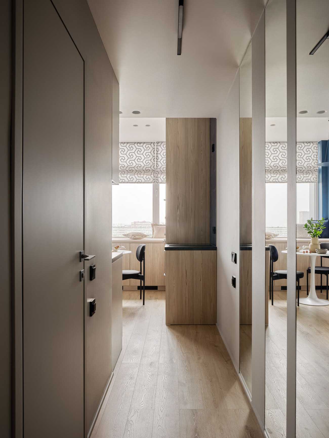 A tervezők különös figyelmet fordítottak azokra a megoldásokra, amelyek vizuálisan növelik a lakás alapterületét és mélységet adnak a térnek. Erre a célra tökéletesen megfelelt a falak és bútorok komplex, hűvös kék árnyalata. Ezt a domináns színt világos, semleges tónusok és a fa meleg árnyalatai egészítik ki.
