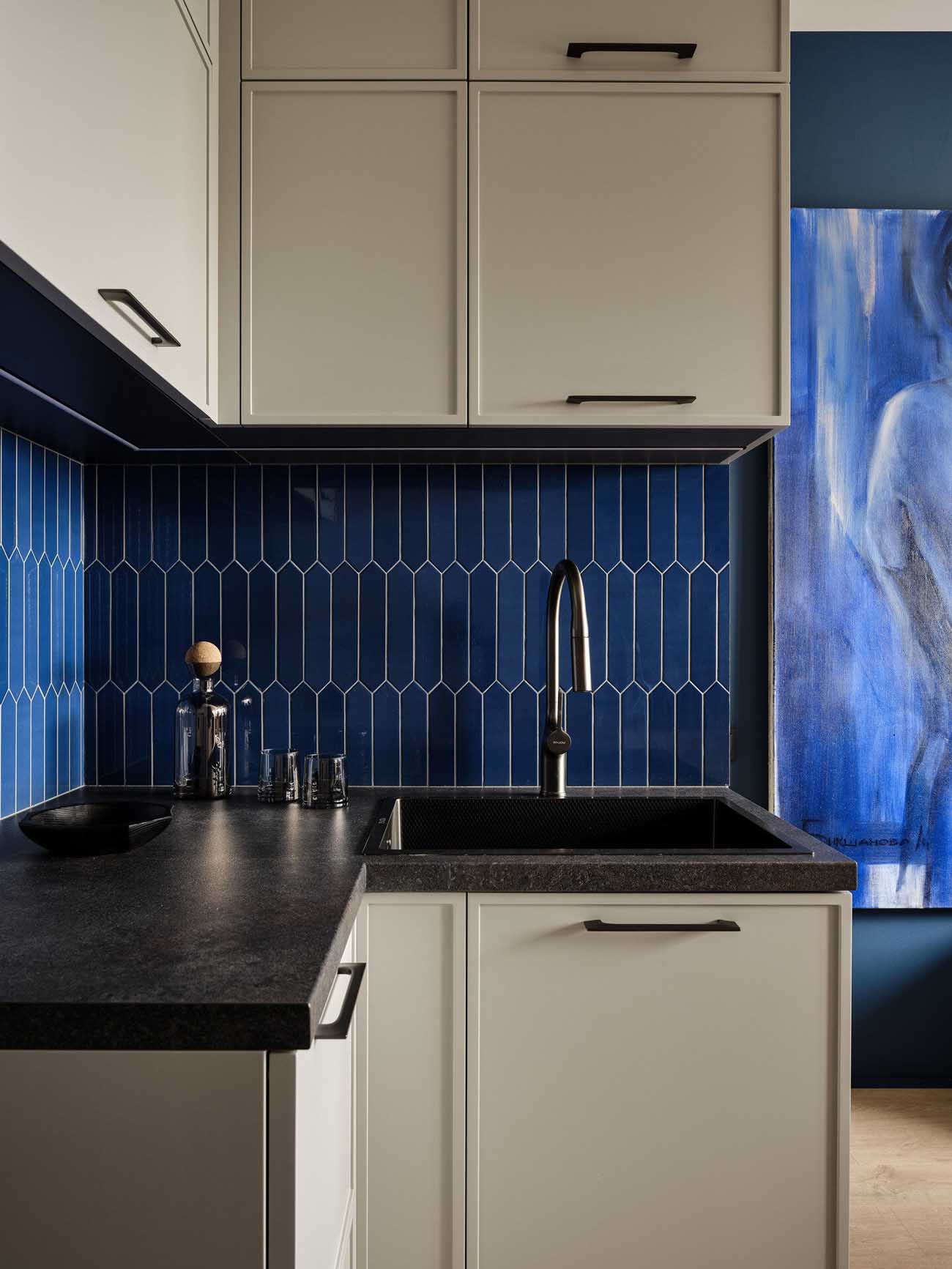 A fő hangsúlyt a fürdőszobában és a konyhai hátfalon megjelenő mélykék csempe kapta. A mennyezetre festhető gipsz lámpatesteket választottak, amelyek letisztult, sallangmentes összhatást eredményeznek.