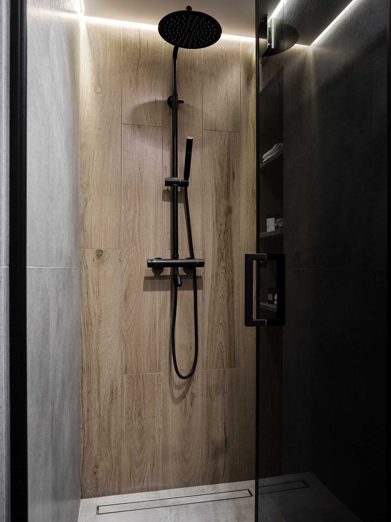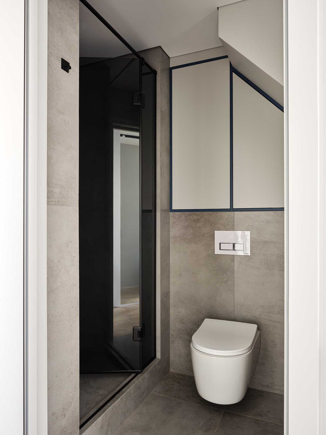 A fürdőszoba eredeti elrendezése egy kényelmes és tágas zuhanyzót tartalmazott, ezért a tervezők megtartották annak elhelyezkedését, és egy falfülkében funkcionális polcokkal egészítették ki. A pult alá egy teljes méretű mosógép is bekerült, ami milliméter-pontos tervezést és egyedi méretű ajtó alkalmazását tette szükségessé. A mosdó mellett nagyméretű tükör és egy nyitott polccal is ellátott tárolószekrény kapott helyet.