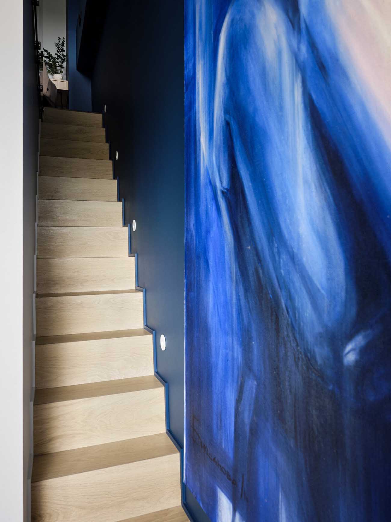 A lakás tulajdonosait ábrázoló, egyedi festmény egy művésznőtől lett megrendelve. A kép a tér zónázásának elemeként is szolgál. Ez az erőteljes hatású belsőépítészeti „vászon” valódi fókuszponttá vált: az asztalnál ülve lehetetlen levenni róla a tekintetet. Impozáns méretének köszönhetően a festmény paradox módon vizuálisan tágítja a kis teret és érdekes perspektívákat nyit. A folyosói tükrökben visszatükröződve például szinte arra invitálja a szemlélőt, hogy bepillantson a sarkon túlra.