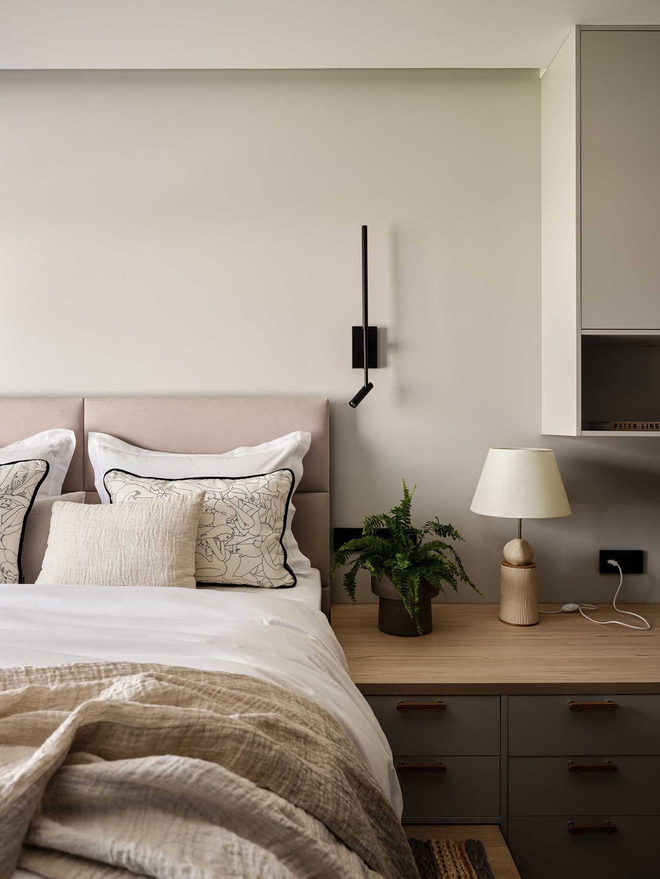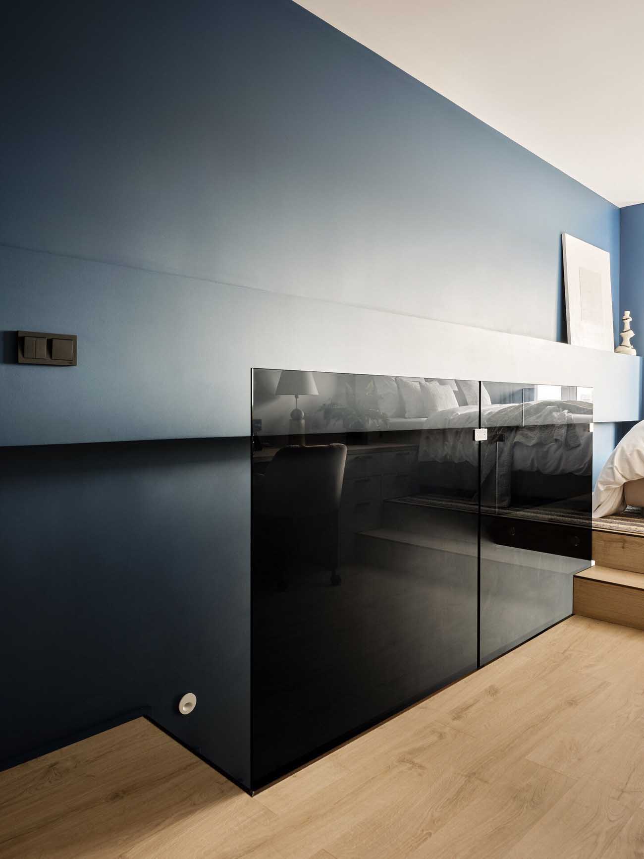 Az alvóhely a bejárattól a lehető legtávolabb, a lakás második emeletén található. Egy dobogón alakították ki, ami a különböző padlószintek révén hangsúlyozza a tér zónázását, valamint vizuálisan korrigálja az aránytalanul hosszú és keskeny szobát. Az ágy emelőszerkezettel van ellátva, amely kényelmes hozzáférést biztosít az alatta lévő hatalmas tárolóhelyhez. Ez ideális ágyneműk, textíliák és szezonális holmik tárolására.