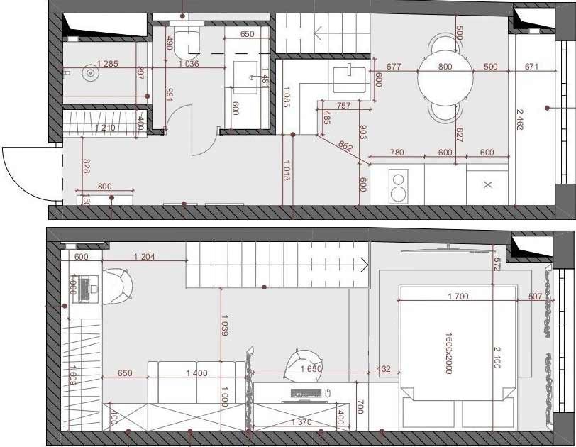 A meglévő félemeletet teljes értékű második szintté alakították, megnövelve a födém alapterületét és meghosszabbítva a lépcső melletti válaszfalat, amely így a konyha falaként funkcionál. A földszint a közösségi élettér lett, itt kapott helyet a fürdőszoba és a konyha-nappali, míg a második emelet a privát szférává vált, ahol a dolgozósarkokat és a hálószobát helyezték el.