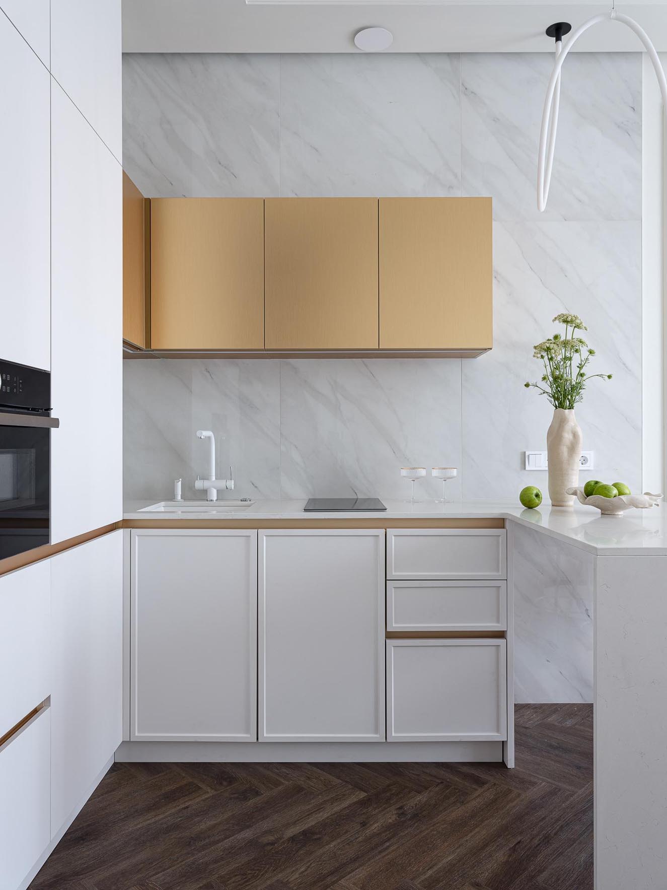 A tervező elvetette a hagyományos étkezőasztal ötletét, és helyette egy multifunkcionális szigetet tervezett, amely egyszerre szolgál előkészítő felületként és étkezőként is. A konyhatechnológia integrálása példaértékű: a magas szekrényoszlopba épített, kombinált sütő-mikrohullámú funkció helytakarékos és esztétikus megoldás. A sárgaréz hatású frontokkal szerelt felső szekrények látványos fókuszpontot teremtenek.