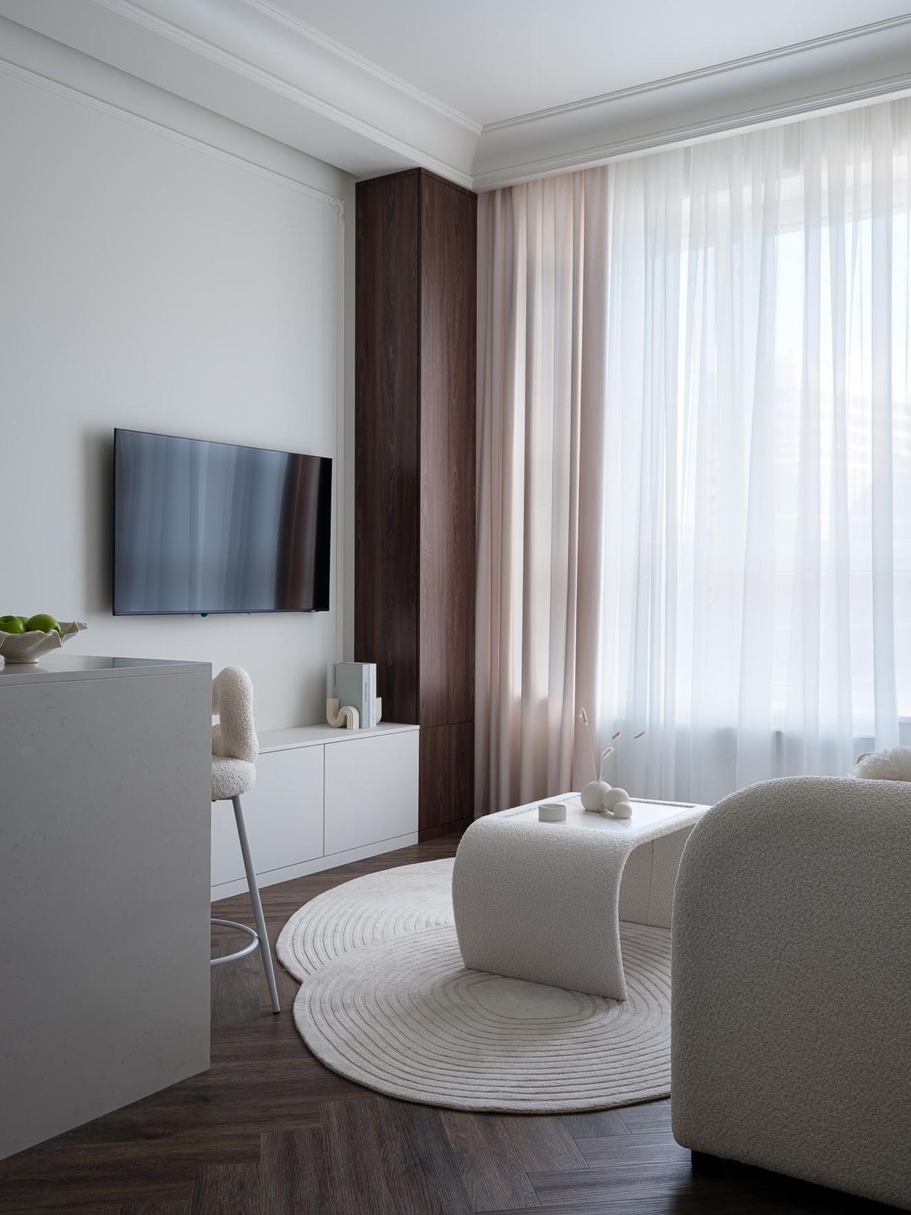 Az enteriőr alapkoncepciója a “könnyedség és tisztaság” köré épült. A tulajdonos kérésére a lakberendező egy meleg, monokróm színpalettát álmodott meg, amelyet a csokoládé árnyalatú fa textúrái és a sárgaréz finom csillogása tesz karakteressé. A stílusirányzat a könnyed, modern klasszikus megjelenés, amely kerüli a túlzásokat, mégis kifinomult keretet ad a mindennapoknak. A semleges tónusok használatával a tér tágasabbnak hat, miközben a különböző anyaghasználat megakadályozza az egyhangúságot.
