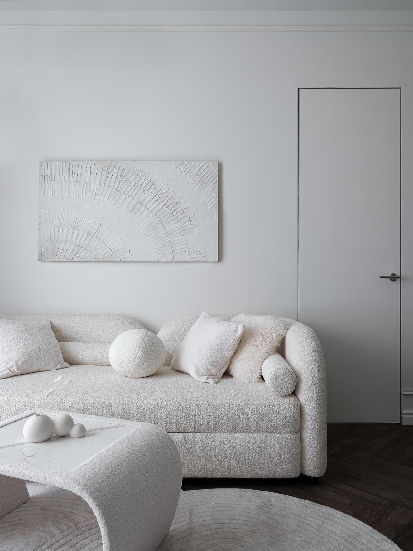 A nappali zónát egy bézs színű, ágyazható kanapé uralja, amelyet a jelenleg rendkívül divatos buklé kárpitozású dohányzóasztal egészít ki. A falakat és a mennyezetet díszítő lakonikus díszlécek és párkányok függőlegesen nyújtják a teret, optikailag növelve a belmagasságot.