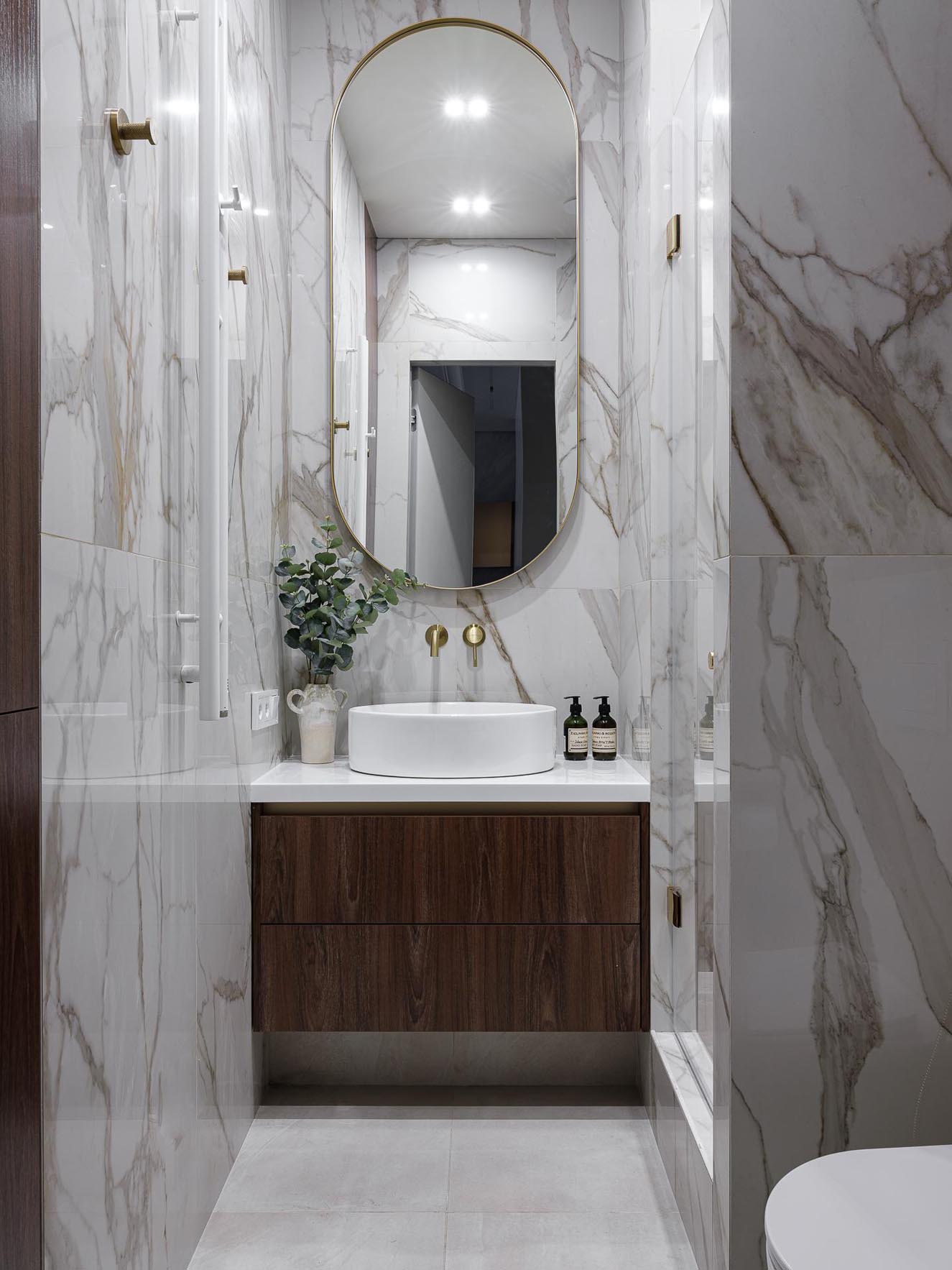 A kis alapterület ellenére a fürdőszobában egy kifejezetten tágas zuhanykabin kapott helyet. A falakba épített fülkék praktikus rakodófelületet biztosítanak anélkül, hogy értékes centimétereket vennének el a térből. A tárolást itt is logikusan szervezték meg, biztosítva, hogy minden piperecikknek meglegyen a saját, rejtett helye.