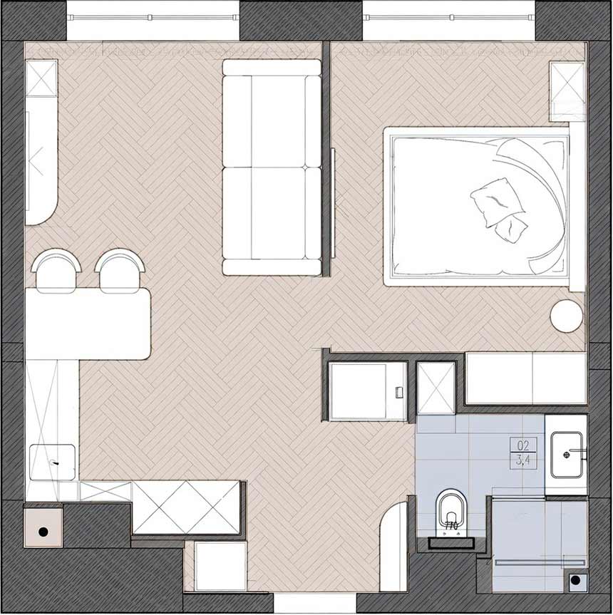 A lakás eredeti elosztását a funkcionalitás jegyében gondolták újra. A cél az volt, hogy megszűnjön a feleslegesen szabdalt érzet, ezért a tervező részlegesen egybenyitotta az előszobát a konyha-nappali zónával. Ezzel elkerülték a felesleges ajtónyílásokat, amelyek csak szűkítették volna a teret.