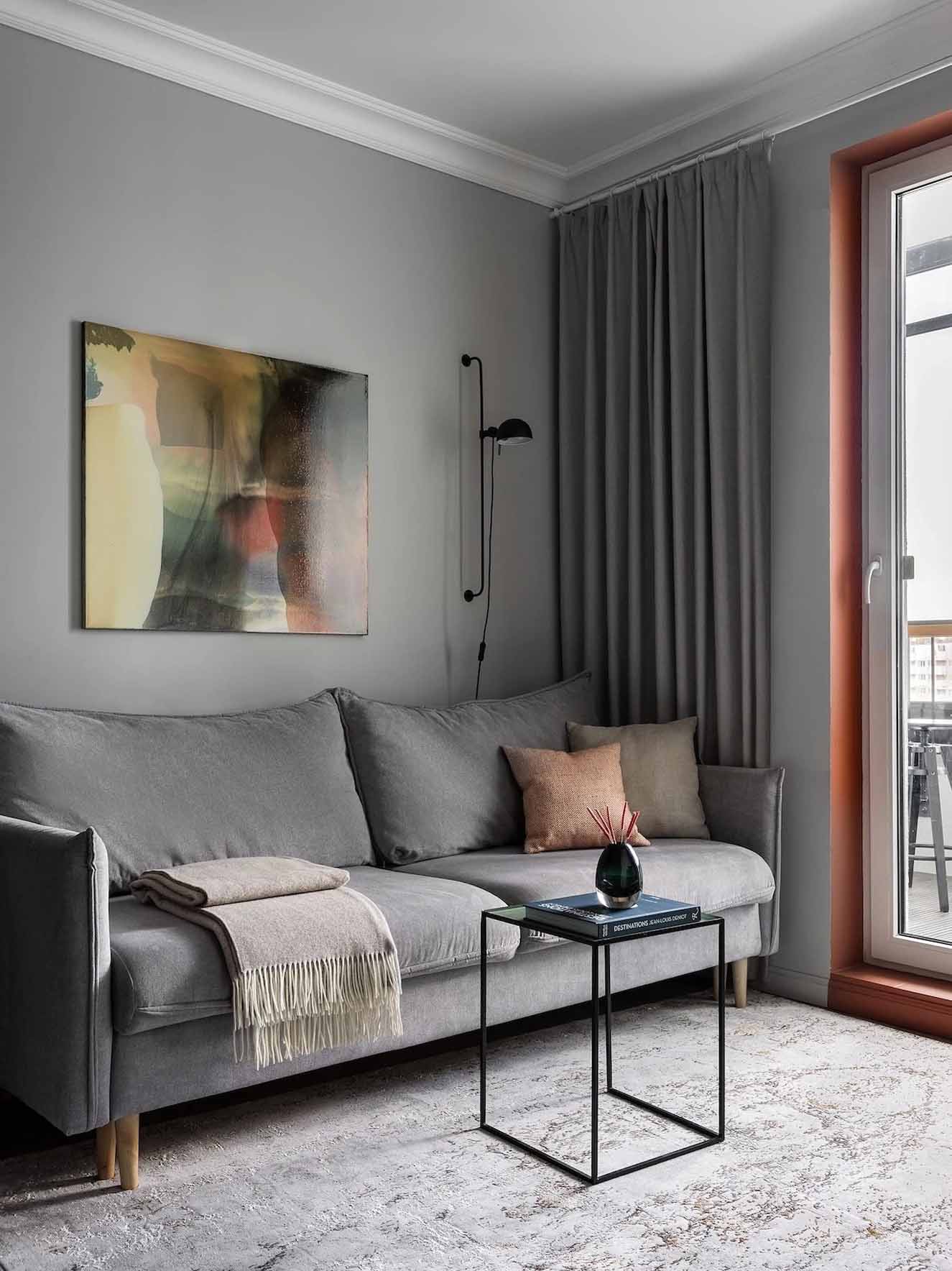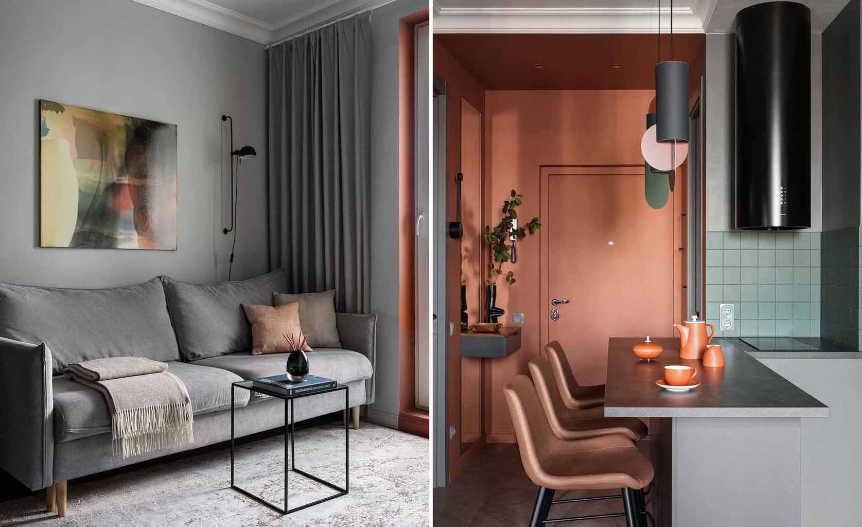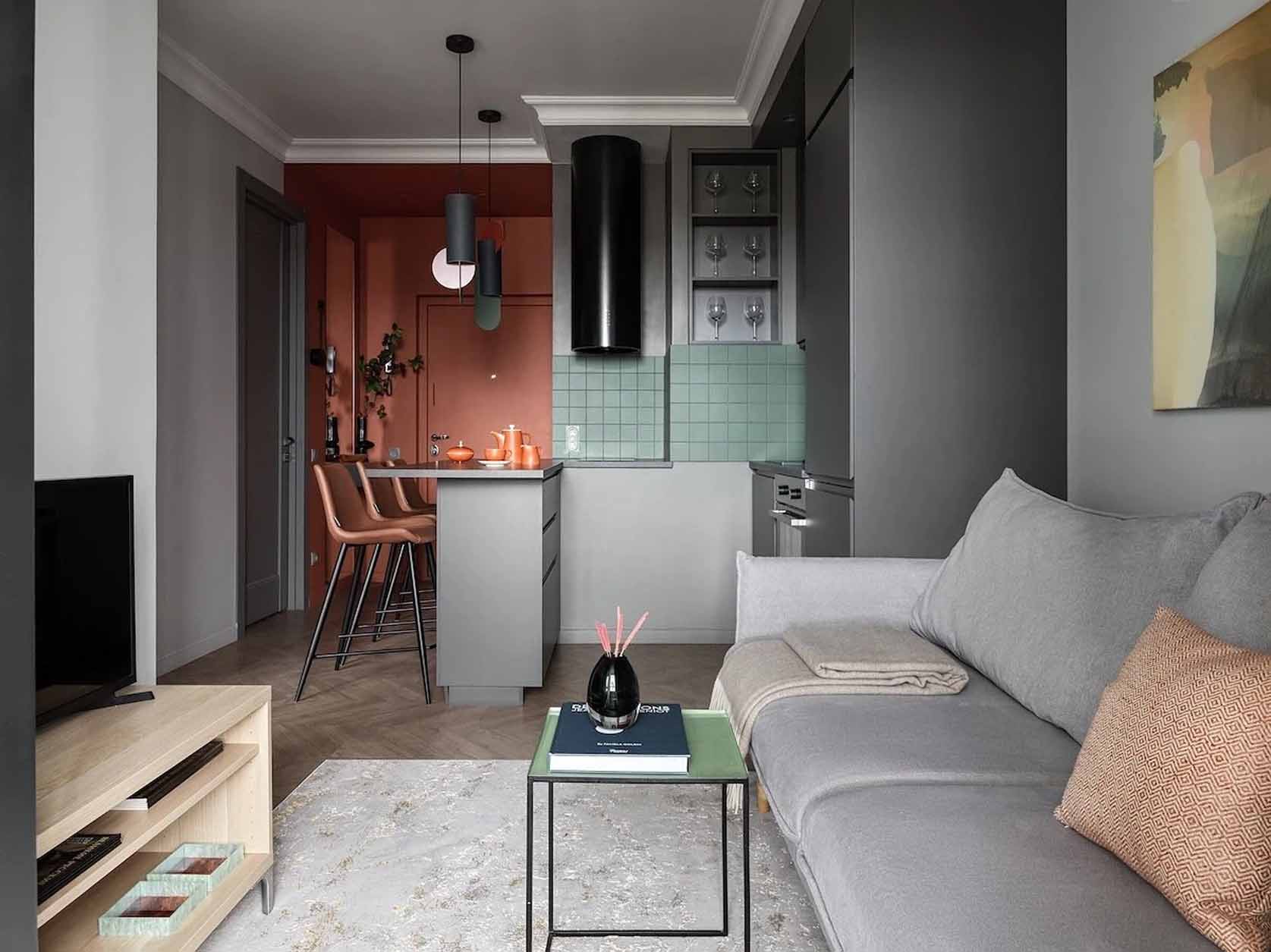 A mindössze 34 négyzetméteres kislakás átalakítása során a tervező és a megrendelő házaspár célja az volt, hogy a szűkös alapterületből a lehető legtöbbet hozzák ki. Az alapvető elvárások között szerepelt egy teljesen szeparált hálószoba, egy kinyitható kanapéval rendelkező nappali zóna, valamint bőséges tárolóhely kialakítása. A projekt egyik esztétikai kihívását a házaspár eltérő ízlésvilága jelentette: míg a feleség a nyugodt, visszafogott tónusokat kedvelte, a férj az élénkebb színekhez ragaszkodott. A végeredmény egy modern stílusú otthon lett, amelyet neoklasszikus elemekkel – például díszes lábazati szegélyekkel és mennyezeti stukkókkal – fűszereztek meg, miközben a bútorok formavilága megmaradt letisztultnak és funkcionálisnak. A színpaletta a modern stílusnak megfelelően kontrasztos, mégis harmonikus, ahol a nyugodt háttérszíneket karakteres árnyalatok egészítik ki.