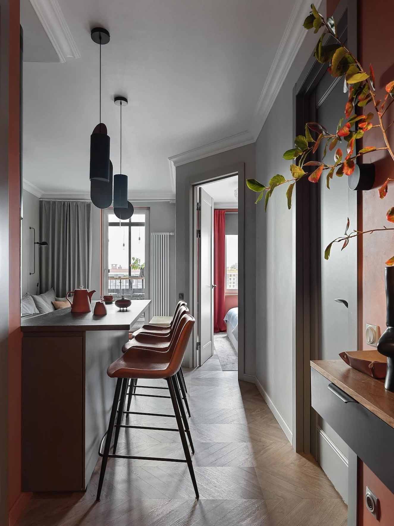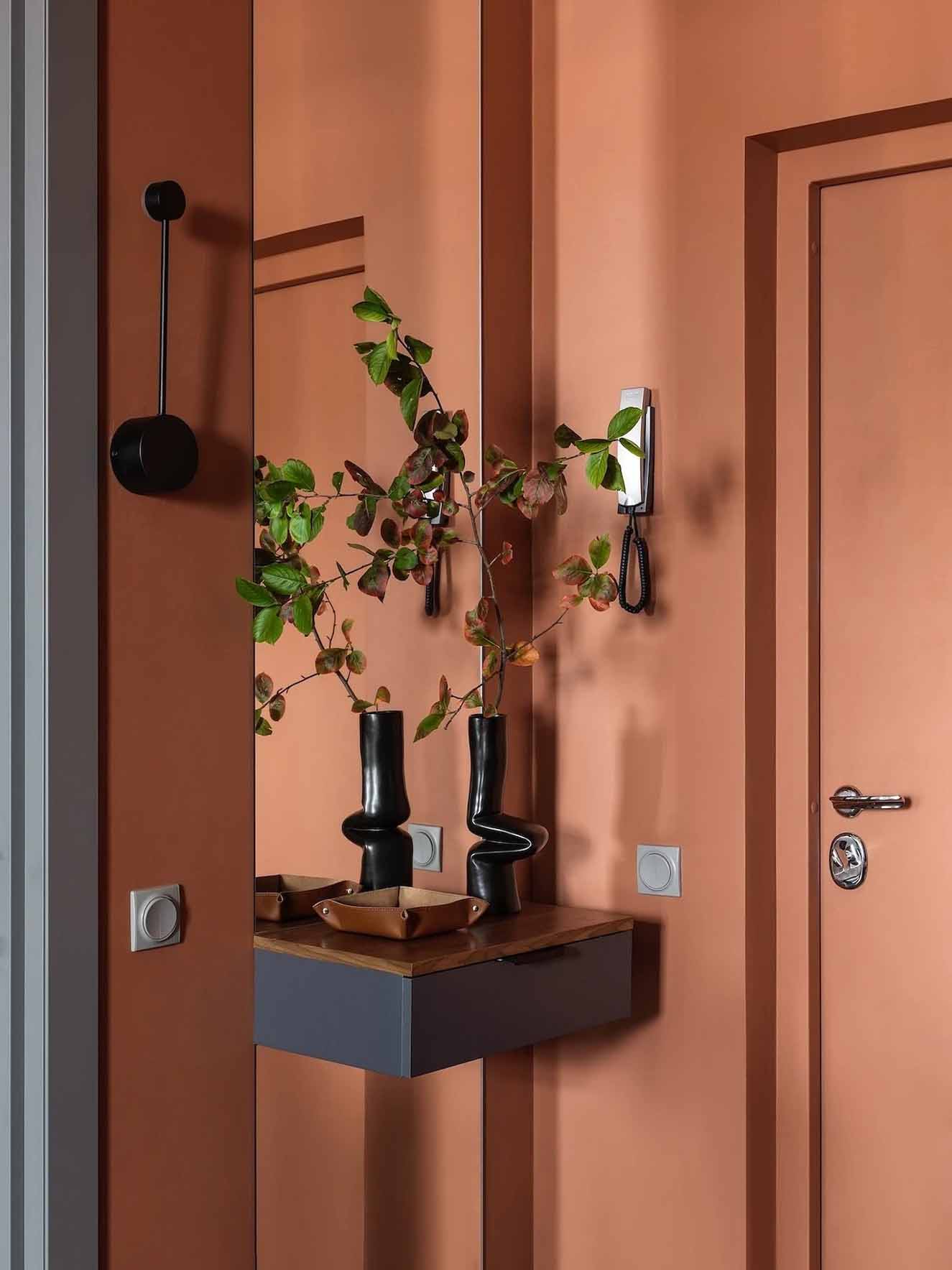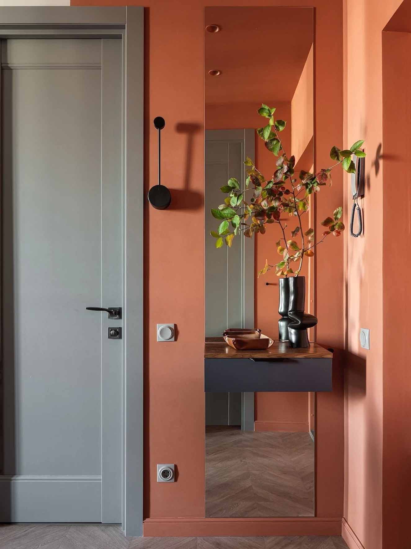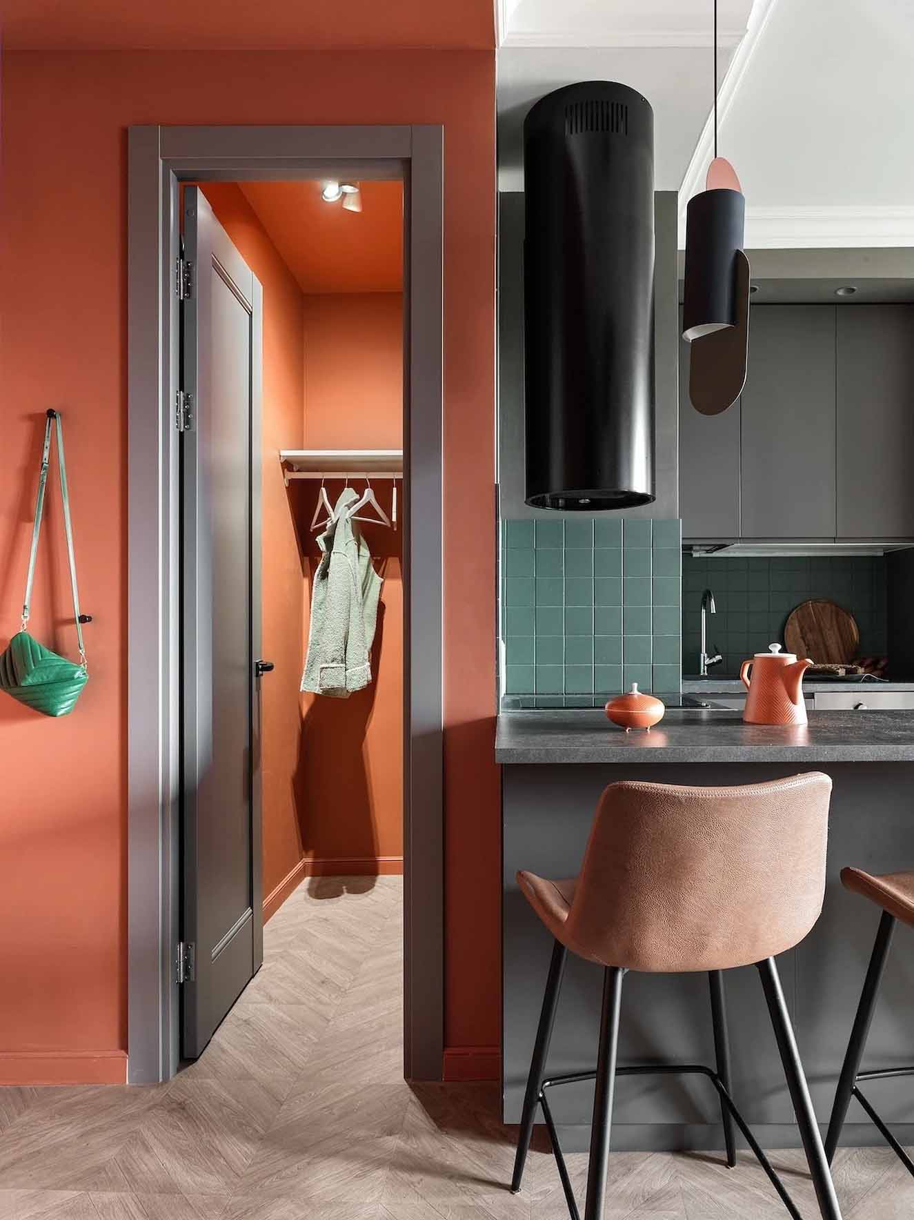 Míg az általános falfelületek semleges szürke árnyalatúak, a bejárati zónában és a gardróbban a falak és a mennyezet merész terrakotta színt kaptak – ez az élénk árnyalat a férj kérése volt, amely reflektál az épület homlokzatának egyik színére.