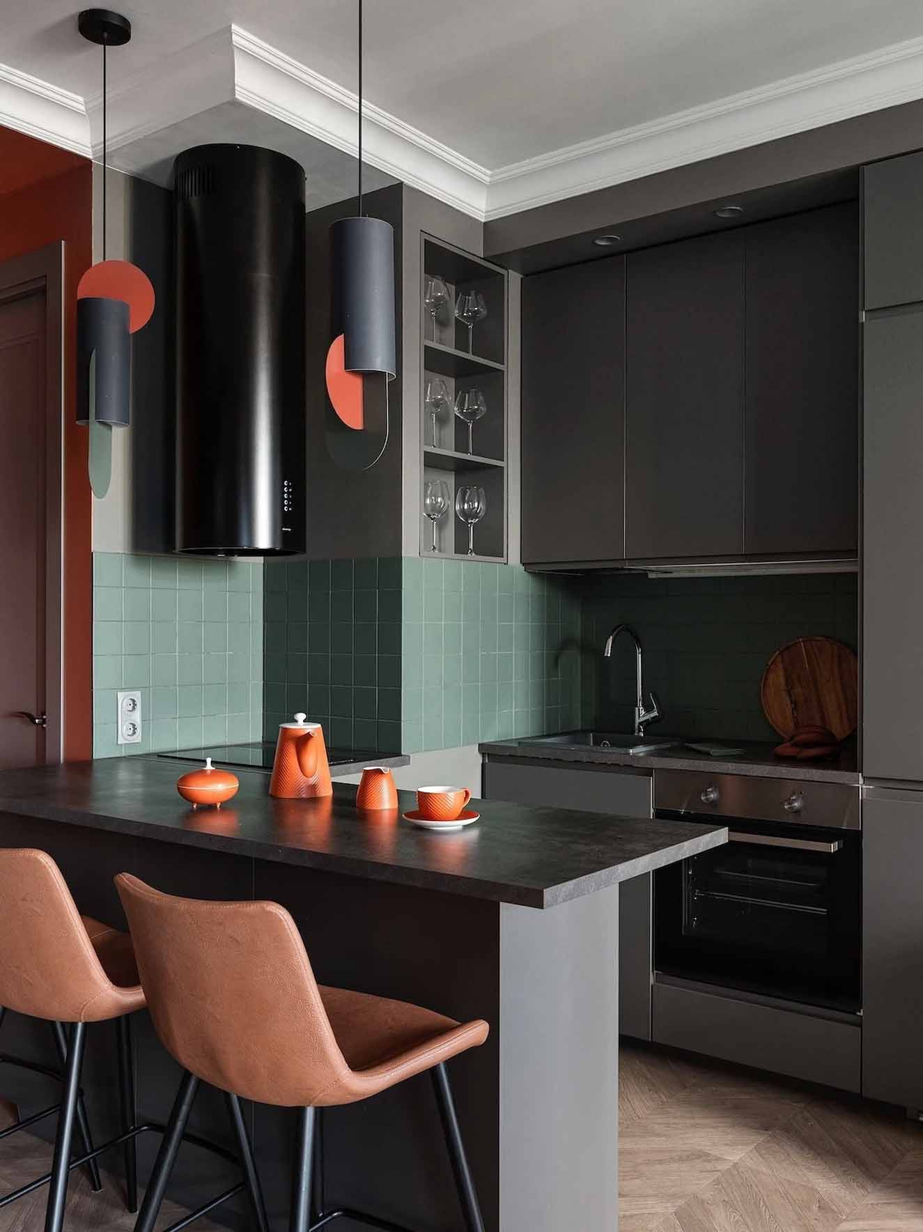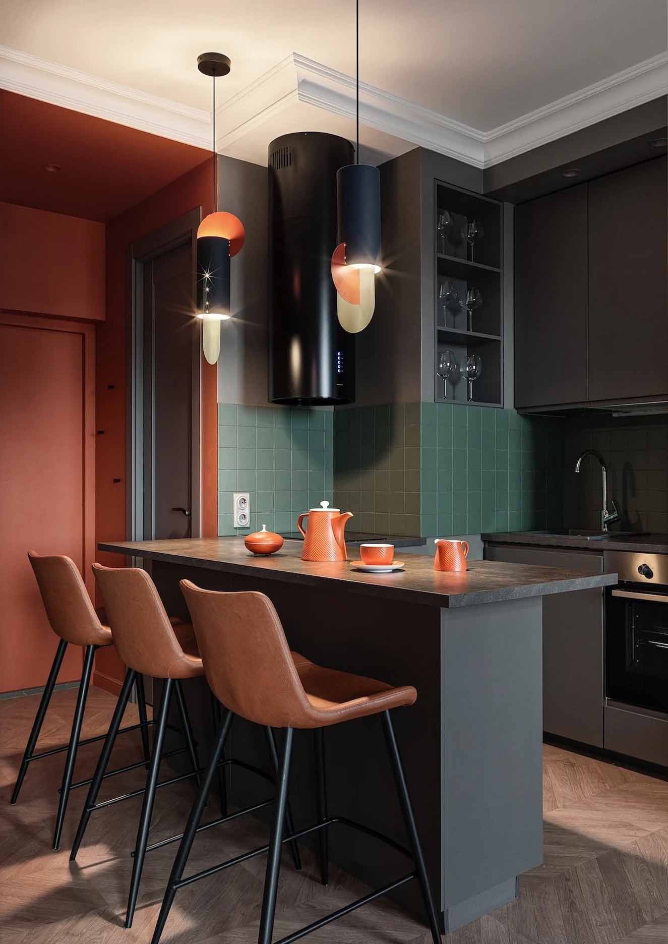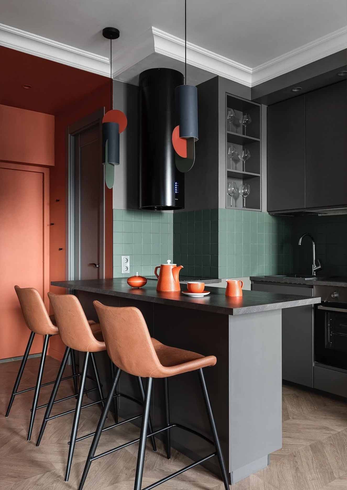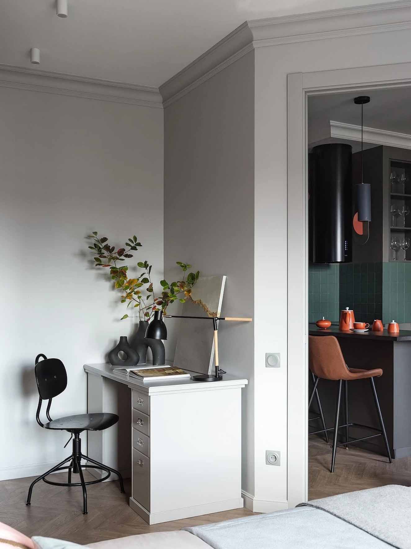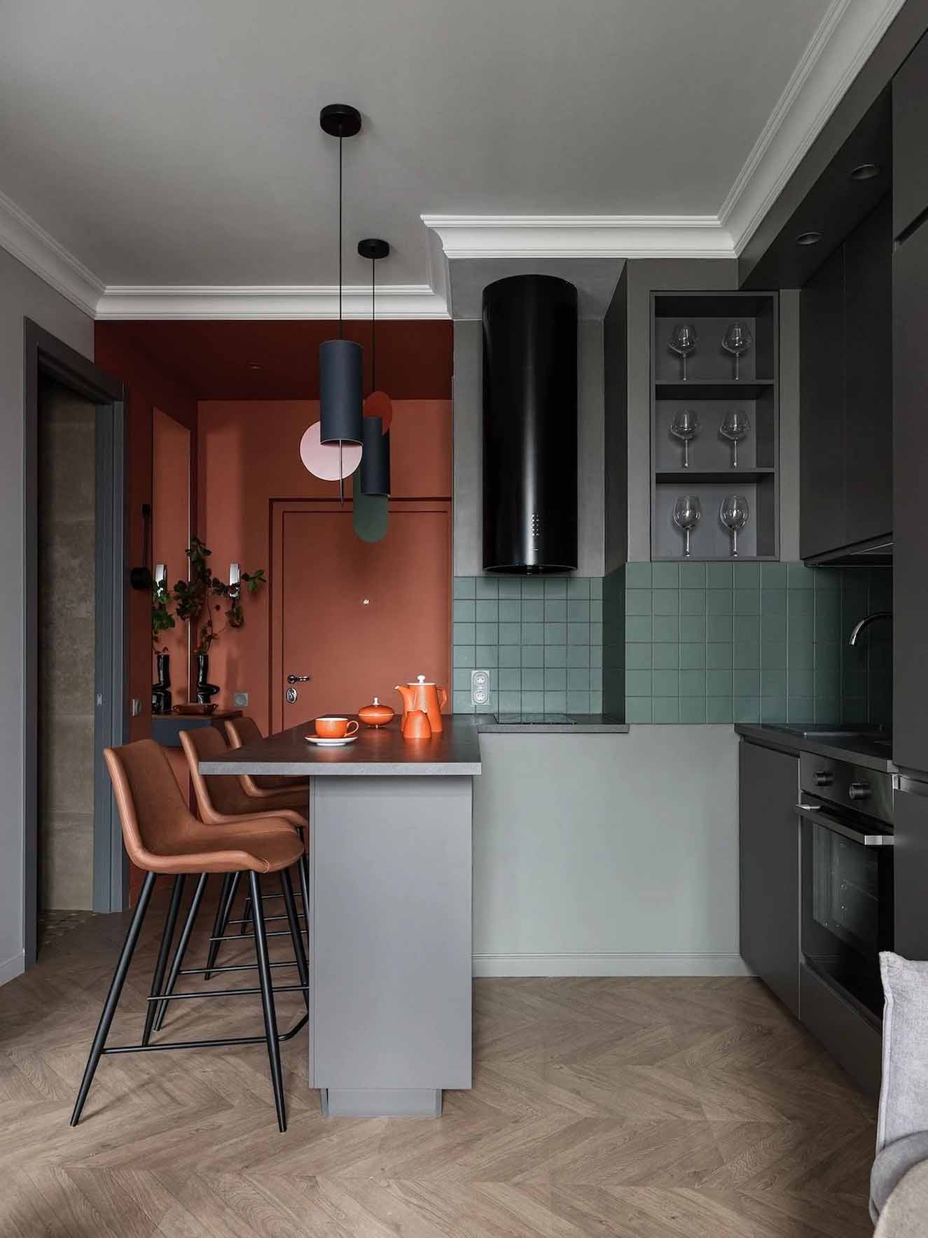 Míg az általános falfelületek semleges szürke árnyalatúak, a bejárati zónában és a gardróbban a falak és a mennyezet merész terrakotta színt kaptak – ez az élénk árnyalat a férj kérése volt, amely reflektál az épület homlokzatának egyik színére.
