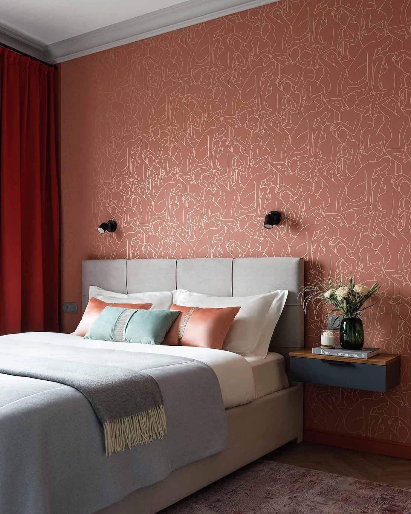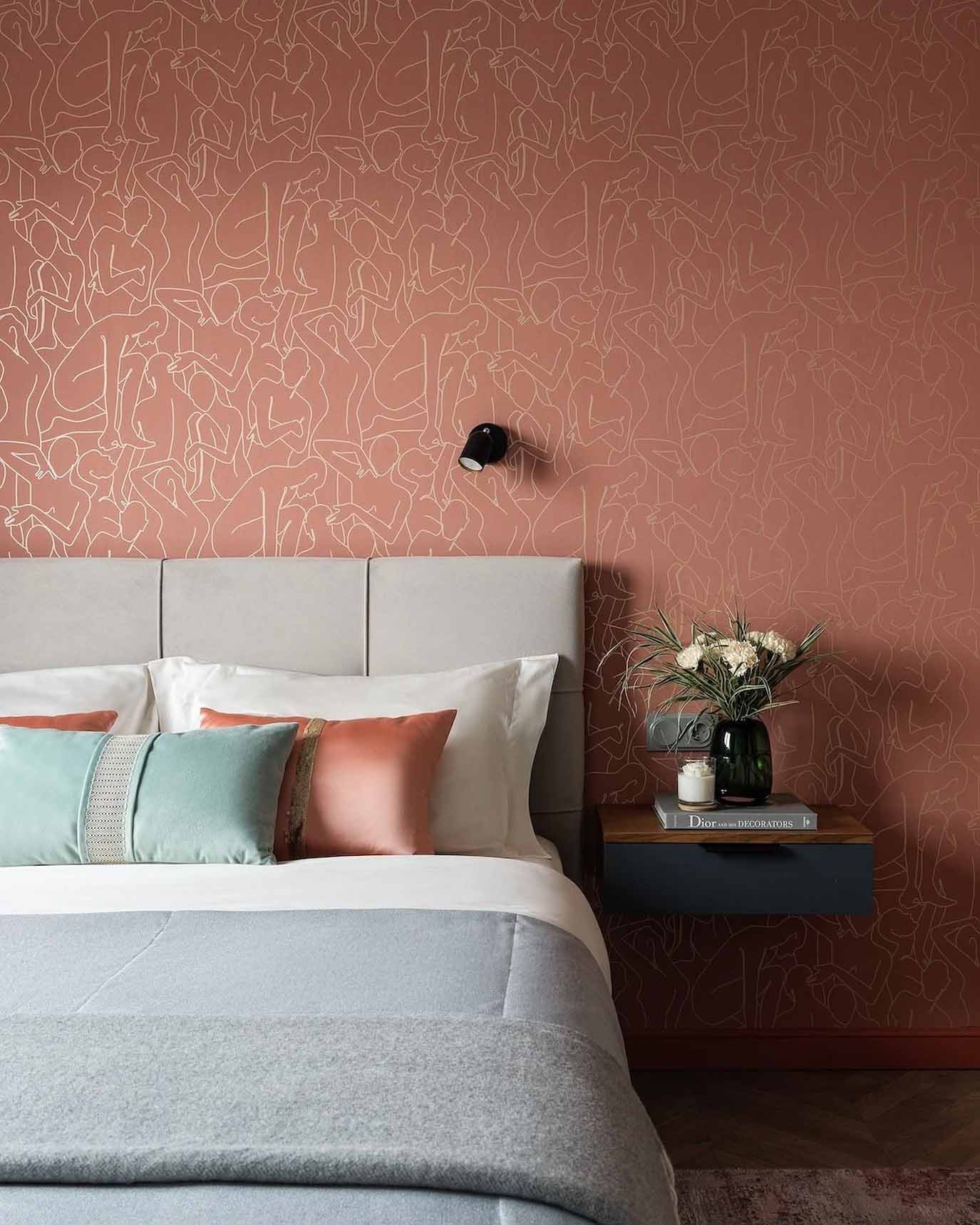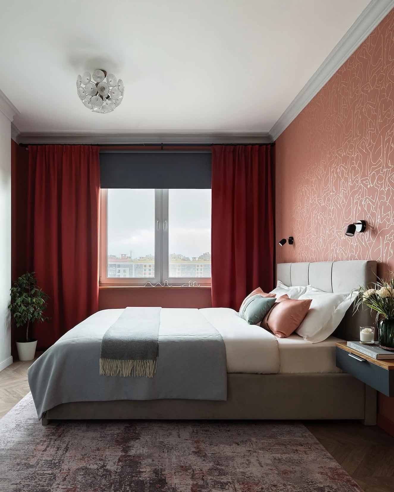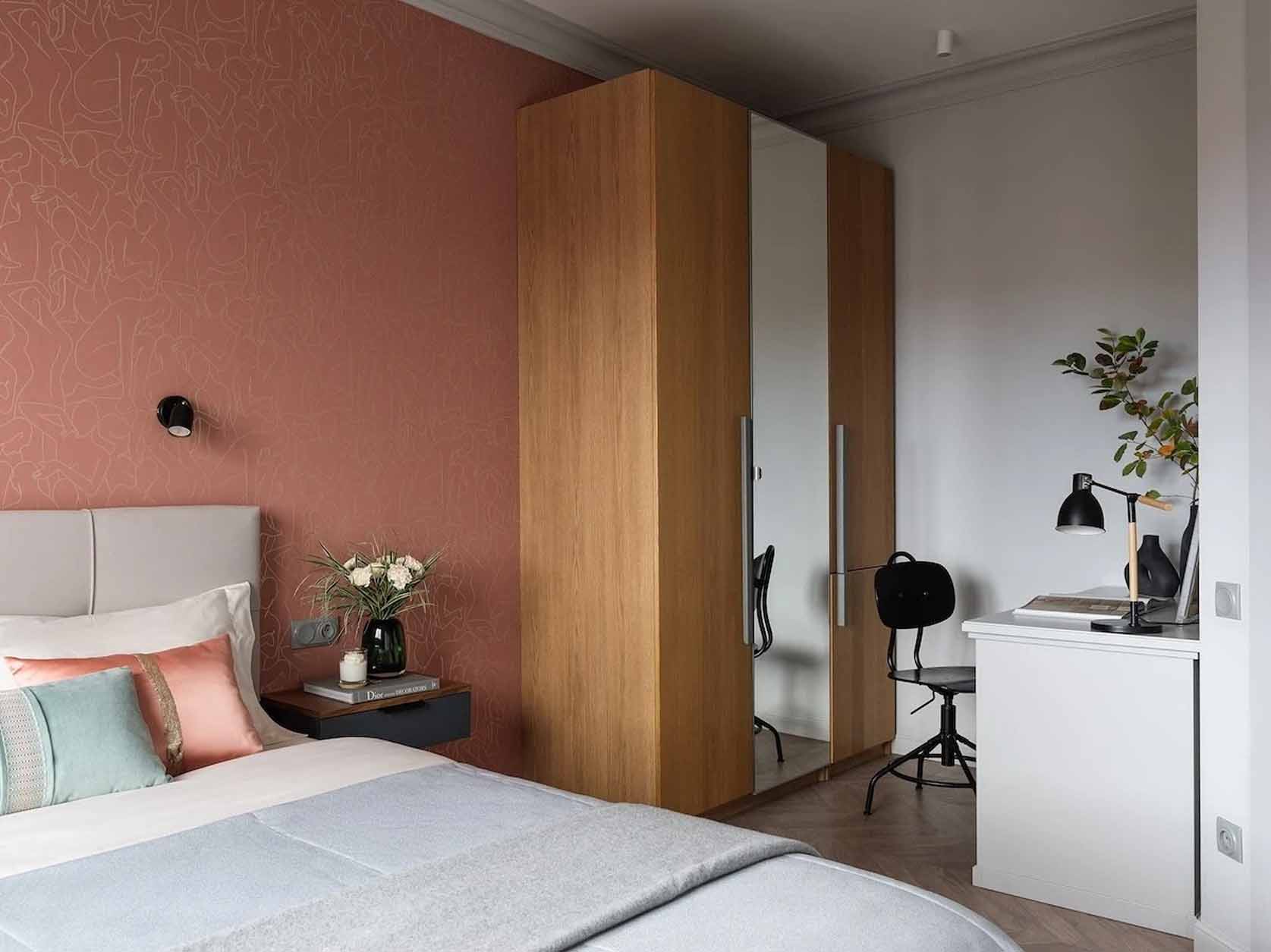 A hálószobában a tárolást egy háromajtós gardróbszekrény oldja meg, de elfért egy fiókos íróasztal is. A helytakarékosság jegyében a hagyományos éjjeliszekrényeket kis méretű, falra szerelt lebegő konzolok helyettesítik. A dekorációban itt is visszaköszön a terrakotta árnyalat az ágy mögötti tapétán, melegséget víve a szürke alaptónusok közé. A világításról egy karakteres, vintage stílusú, „pitypang” formájú csillár, valamint az ágy melletti falikarok gondoskodnak.