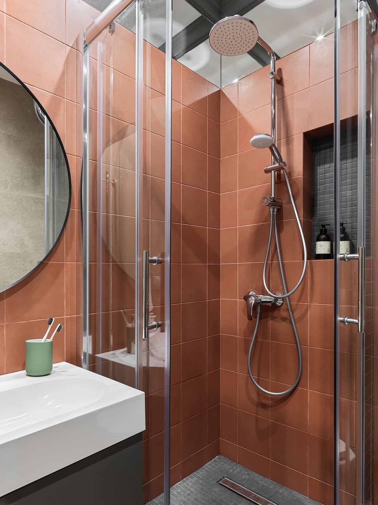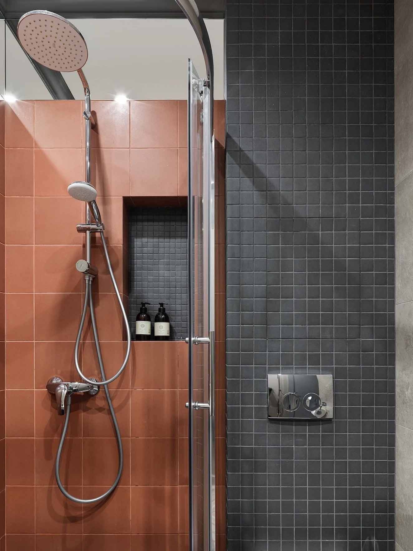 A vizesblokkban izgalmas vizuális játék érvényesül a burkolatokkal. A „vizes” zónák – a zuhanyzó és a mosdó feletti rész – terrakotta színű burkolatot kaptak, míg a WC beépített tartályát rejtő falat és a zuhanyfülke falfülkéjét sötétszürke mozaikkal emelték ki. A többi felületet festették. Különleges térnövelő trükk a falak felső sávjában, közvetlenül a mennyezet alatt elhelyezett tükörcsík, amely a „végtelen plafon” illúzióját kelti. A padlót olyan járólap borítja, amely a helyiségben használt összes színt – a terrakottát, a feketét és a szürkét – egyesíti magában. A világítást itt is beépített mennyezeti lámpák adják.