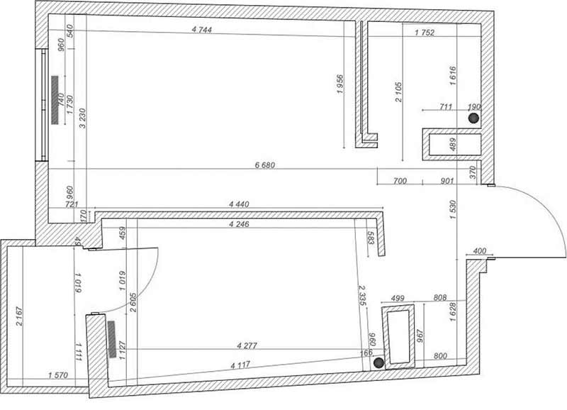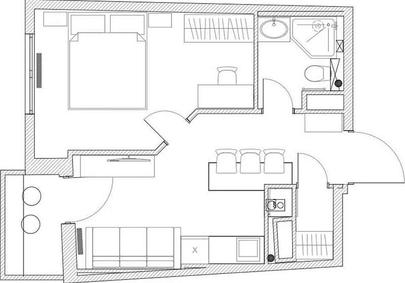 Az ingatlan alaprajza eredetileg meglehetősen bonyolult volt, a falak többsége nem zárt be derékszöget. A lakás eredeti felosztása különálló hálószobából, konyhából és fürdőszobából állt. A felújítás során a belső válaszfalak áthelyezésével a térszerkezet jelentősen megváltozott: a hálószoba és a közlekedő, valamint a konyha és a közlekedő közötti falak módosításával a hálót ugyan valamelyest csökkentették, de cserébe a konyhát összenyitották az előtérrel. Ez a megoldás szellősebb térérzetet eredményezett, és lehetővé tette, hogy a konyhában, közvetlenül az ablaknál egy kis nappali funkciót is kialakítsanak.