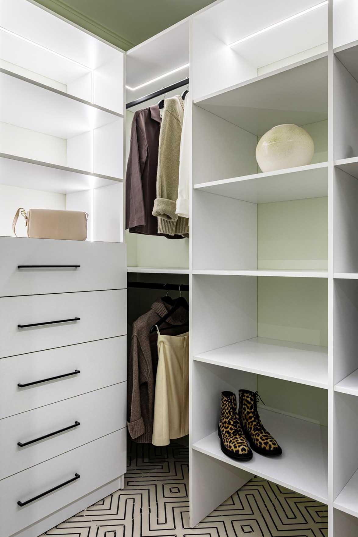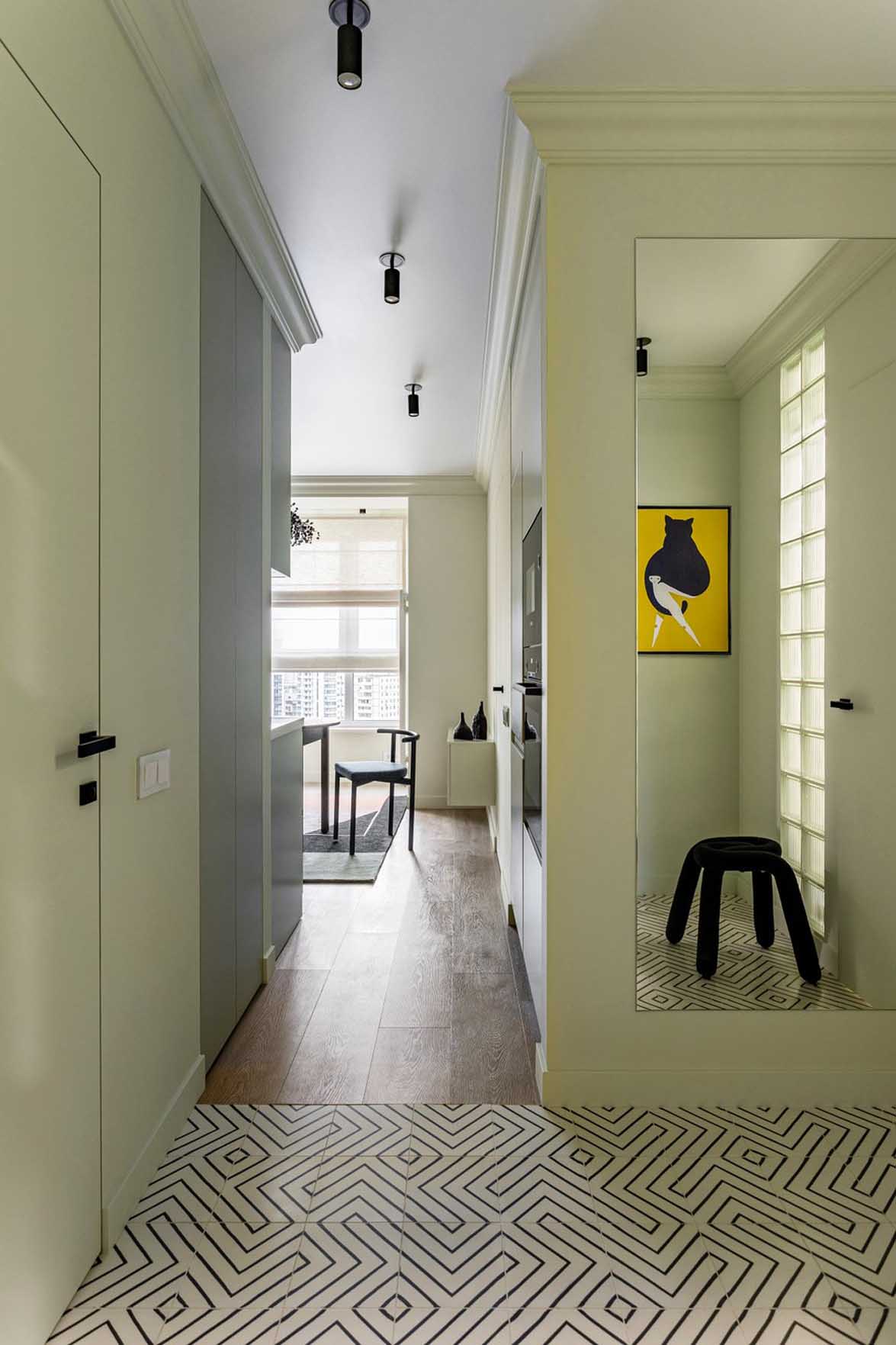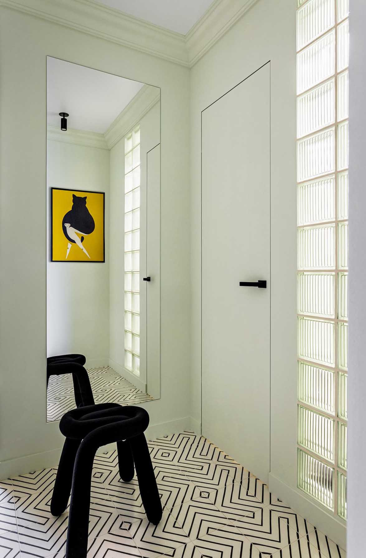 Az előszobában a beépített bútorokat a falakkal azonos színre festették, így azok szinte beleolvadnak a környezetükbe. Ebben a zónában nem helyeztek el hagyományos tárolókat, mivel a különálló gardróbszoba minden igényt kielégít. Az előszoba dísze egy japán stílusú, macskát ábrázoló festmény, amely a tulajdonos állatszeretetét jelképezi. Ez az alkotás egy nagyméretű tükörben verődik vissza, a megvilágításáról pedig a gardrób falába épített, 60-as éveket idéző üvegtéglákon átszűrődő fény gondoskodik. Az előszoba, a gardrób és a fürdőszoba padlóját egyedi, kézzel készült, geometrikus mintázatú hidegburkolat borítja, amely vizuális összekötő kapocsként szolgál a különböző zónák között. A gardrób belsejében a polcok rejtett világítást kaptak, ami segít a rendszerezésben és a rendezett összhatás fenntartásában.