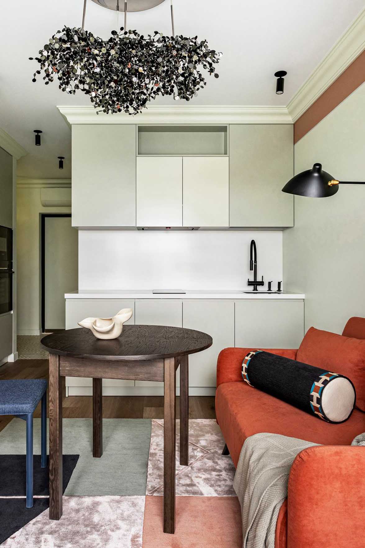 A konyhabútor fő része lineáris elrendezésű, az ablakkal szemközti fal mentén kapott helyet a mosogatóval és a főzőlappal. A hűtőszekrényt, a sütőt és a mikrohullámú sütőt az előszobai fülkébe telepítették, így a konyha megjelenése modern és letisztult maradt. A pihenőövezetben egy kompakt, mégis funkcionális kanapé áll, amely szükség esetén vendégággyá alakítható. A világítás központi eleme egy különleges, „antracit pitypangra” emlékeztető csillár, de a lakásban számos egyéb fényforrás is helyet kapott a különböző hangulatok megteremtéséhez.