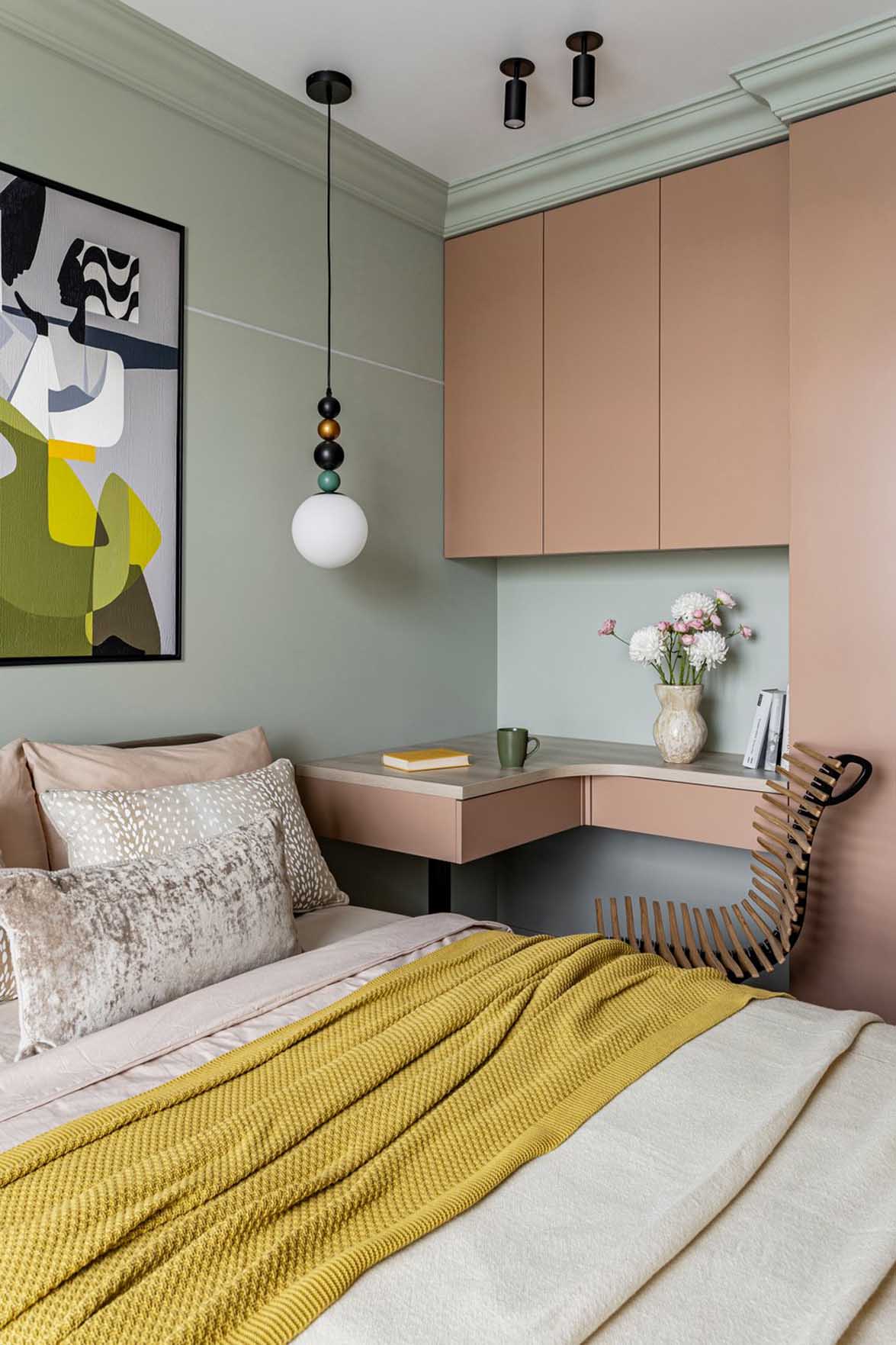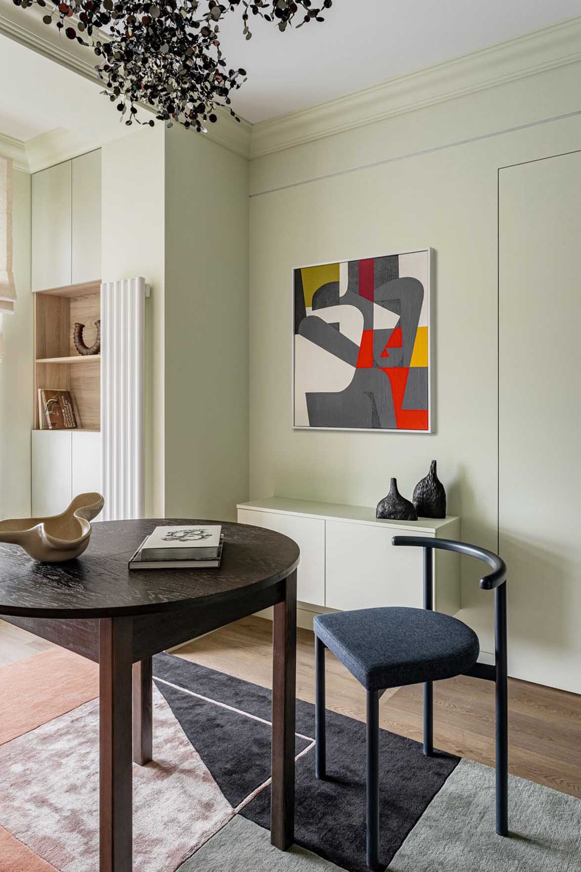 Ez a kislakás egy fiatal hölgy önálló életének és karrierjének fontos állomása. Lakójának karakteréhez illően a tervező egy olyan belső teret hozott létre, amely egyszerre lágy és érzelmes, de nem riad vissza a merészebb, formabontó megoldásoktól sem. Mivel a tulajdonos távmunkában dolgozik, a legfontosabb szempont a kényelmes munkaállomások kialakítása volt, amelyek videókonferenciákhoz is esztétikus hátteret biztosítanak. Kifejezett kérés volt a bőséges tárolókapacitás, egy külön gardróbszoba, valamint egy teljes értékű konyha kialakítása. A színvilágot tekintve a pasztell alapok dominálnak, amelyeket a művészeti alkotások és a dekorációs elemek élénk akcentusai keltenek életre.
