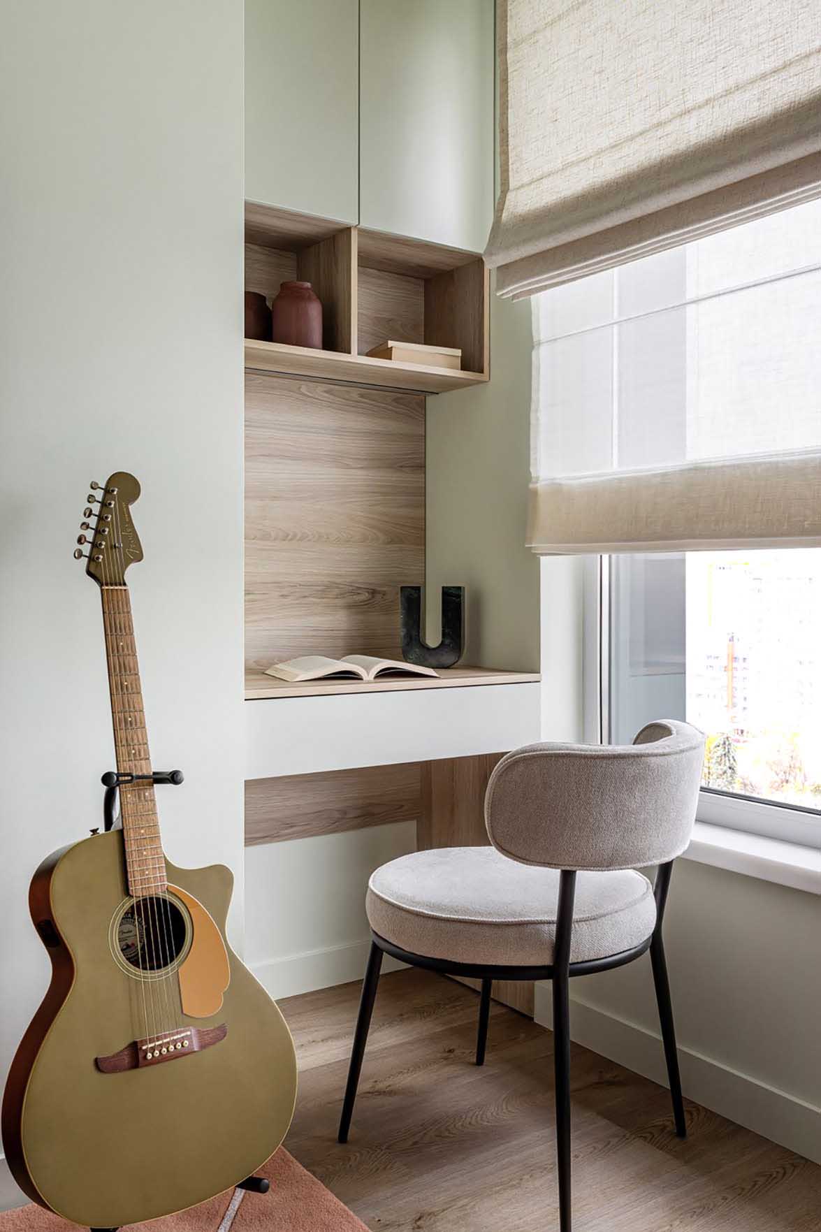 A nappaliban az ablak mellett kapott helyet az egyik munkaállomás. Mivel a lakás tulajdonosa grafikus és zenész is, a dekoráció részeként egy sötét olívazöld akusztikus gitár is helyet kapott egy tartón, amely színében és stílusában is tökéletesen illeszkedik az enteriőrbe, mintha csak egy értékes műtárgy lenne.