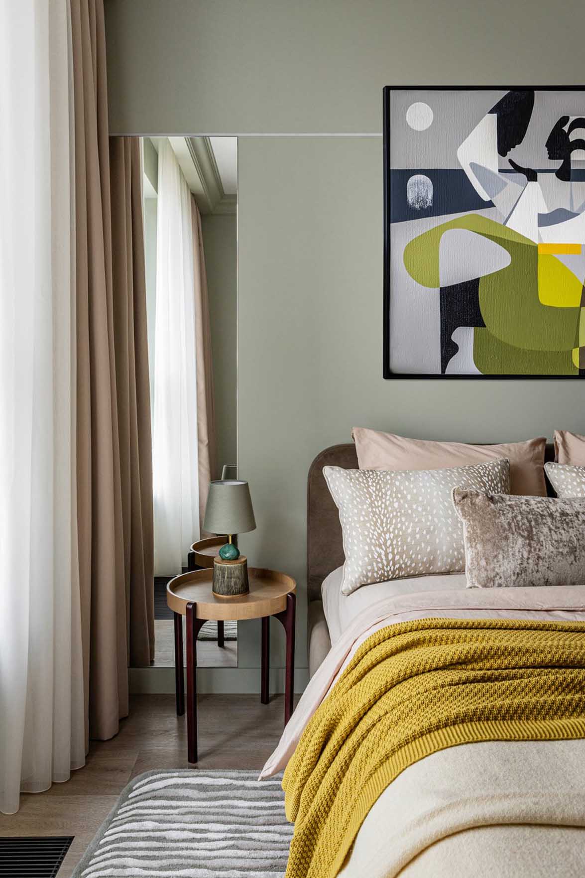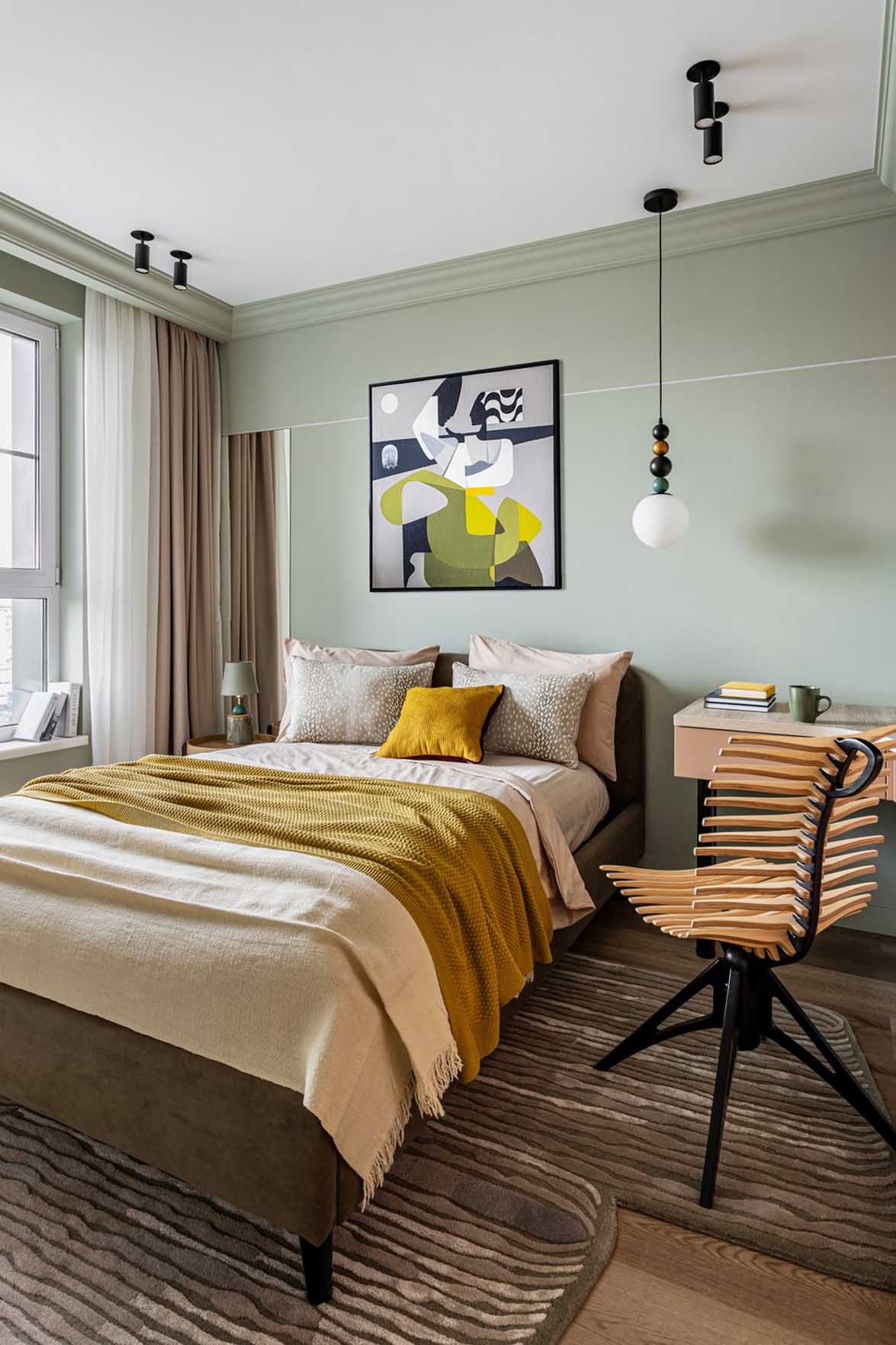 A hálószoba berendezésénél a tervező szándékosan különböző stílusú és formájú tárgyakat válogatott össze, tükrözve a tulajdonos egyéni ízlését: különleges darab például a fekete vázas, csontvázszerű szék. Itt található a második munkahely is, amelyet praktikusan a ruhásszekrénnyel kombináltak, így a tér nappal irodaként, éjjel pedig nyugodt hálóként funkcionál.