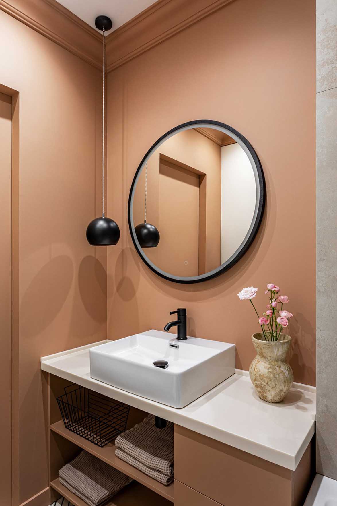 Az előszobából nyíló fürdőszobát az őszibarack és a bézs tónusai uralják. A kialakításnál a letisztult formák és a maximális funkcionalitás volt az irányadó. A tulajdonos a hosszú távú tervezés jegyében a zuhanykabin helyett a kádat választotta. A tárolást intelligens módon oldották meg: a piperetárgyak a mosdó alatti szekrényben vagy a falba süllyesztett, csempézett fülkékben kaptak helyet. Ez a megoldás segít elkerülni a vizuális zajt és a felesleges akasztók, polcok használatát, tiszta és biztonságos környezetet teremtve.