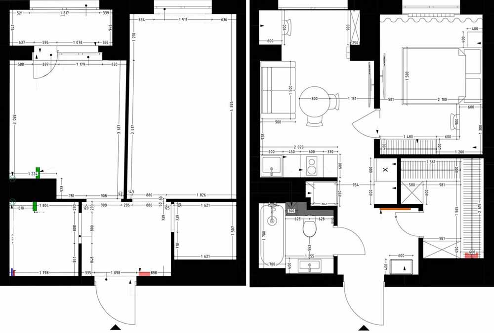 A kétszobás (konyha/nappali + hálószoba) elosztású lakást a hatékonyabb helykihasználás érdekében némileg módosították. Az alaprajzi átalakítás legfontosabb eleme a gardróbszoba bővítése volt a hálószoba rovására, így egy valóban tágas tárolóegység jött létre, amely tehermentesíti a többi helyiséget. Emellett az előszobában egy speciális falfülkét alakítottak ki, amelybe a konyhai gépeket rejtő toronyszekrények kerültek, felszabadítva ezzel a nappali életterét és letisztultabbá téve a közösségi zónát.