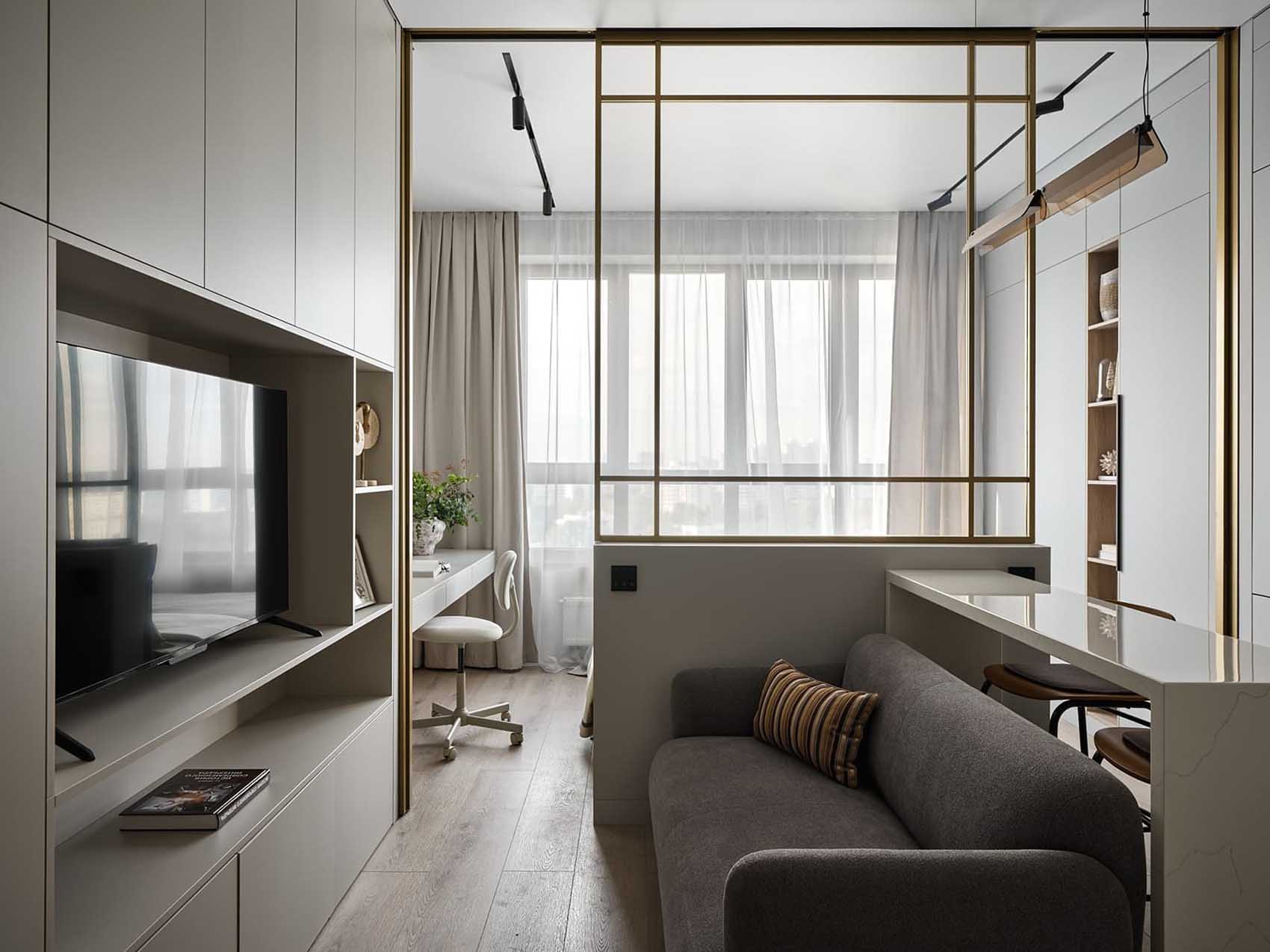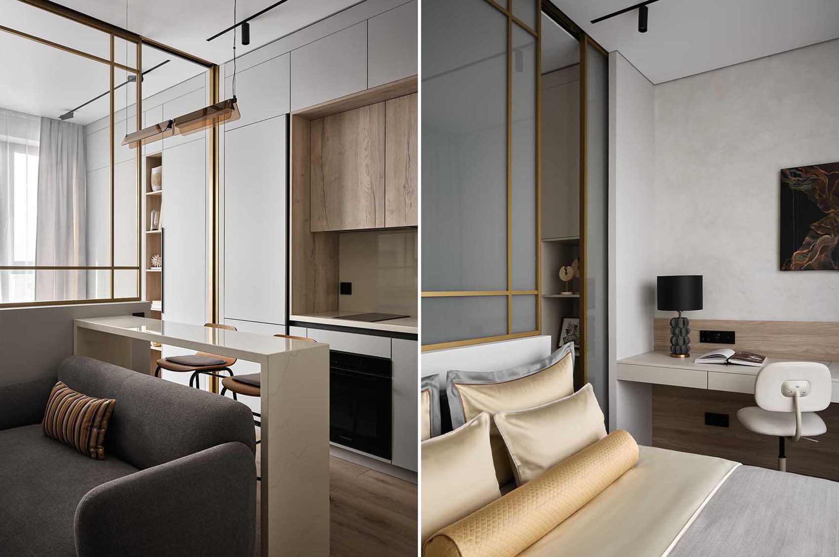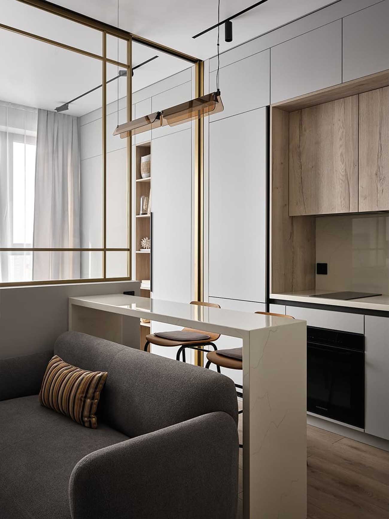 Egy mindössze 30 m²-es kislakás berendezését bízta lakberendezőre a tulajdonos. Az elképzelés szerint egy meghitt butikhotel szobájának hangulatát kellett megidézni a szerény alapterületen, ahol a nyugodt, szürkés-bézs színpalettát arany részletek és finom textíliák egészítik ki. A legfőbb kihívást az ingatlan szerény alapterülete jelentette, amelyen egy szeparált hálószobát, valamint egy kényelmes amerikai konyhás nappalit kellett kialakítani.