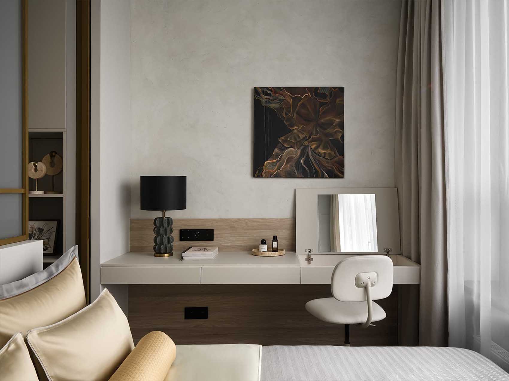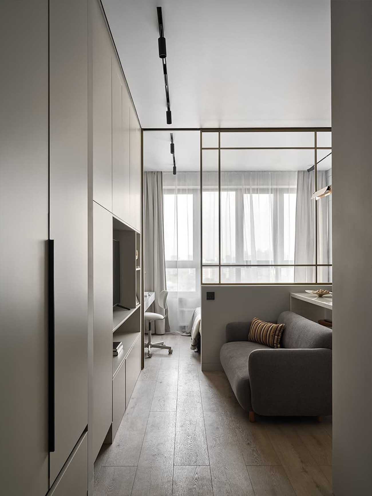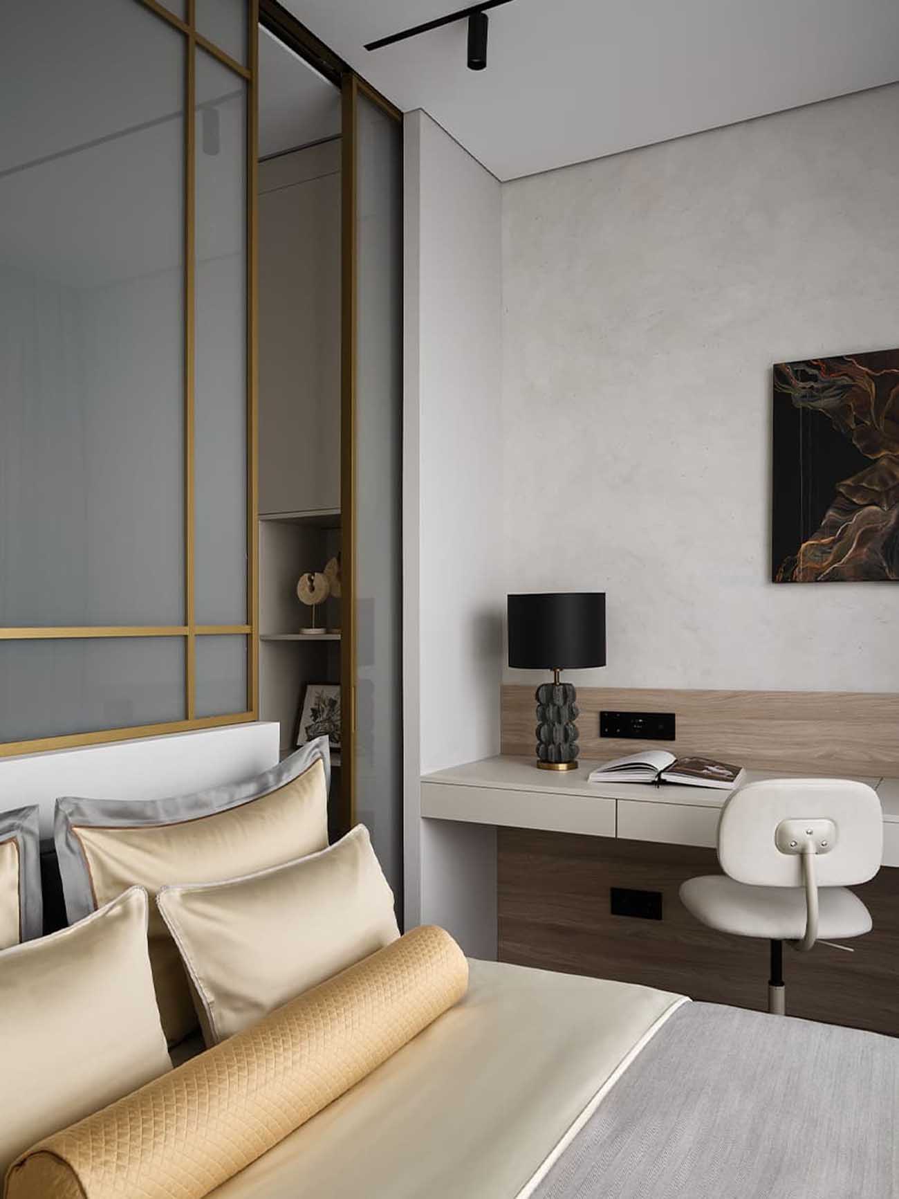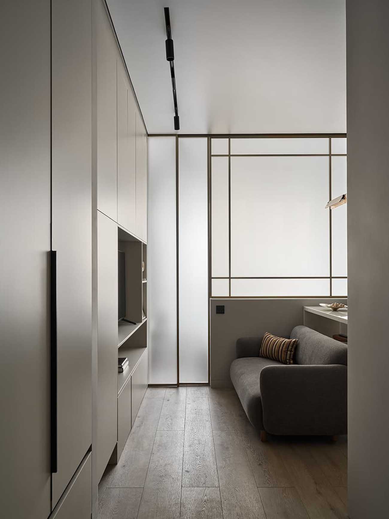 Az adottságok alapos tanulmányozása után a lakberendező a tér kettéosztása mellett döntött. Annak érdekében, hogy a helyiség letisztult geometriája és a könnyedség érzet megmaradjon, a tervező a lehető legvékonyabb megoldást kereste. Egy elegáns, arany színű keretben intelligens üveg (smart glass) panelek kaptak helyet, amelyek a megrendelők igénye szerint gombnyomásra opálossá, átlátszatlanná tehetők.
