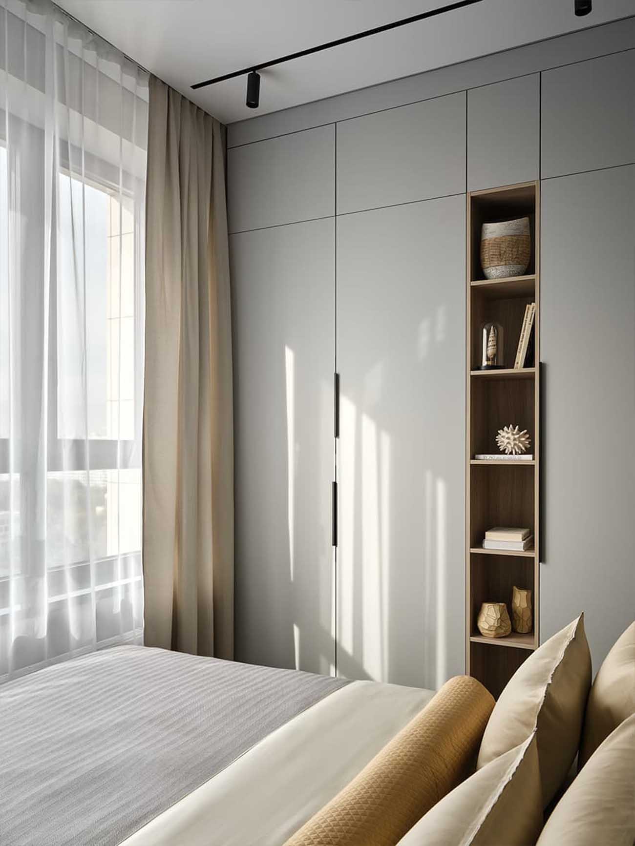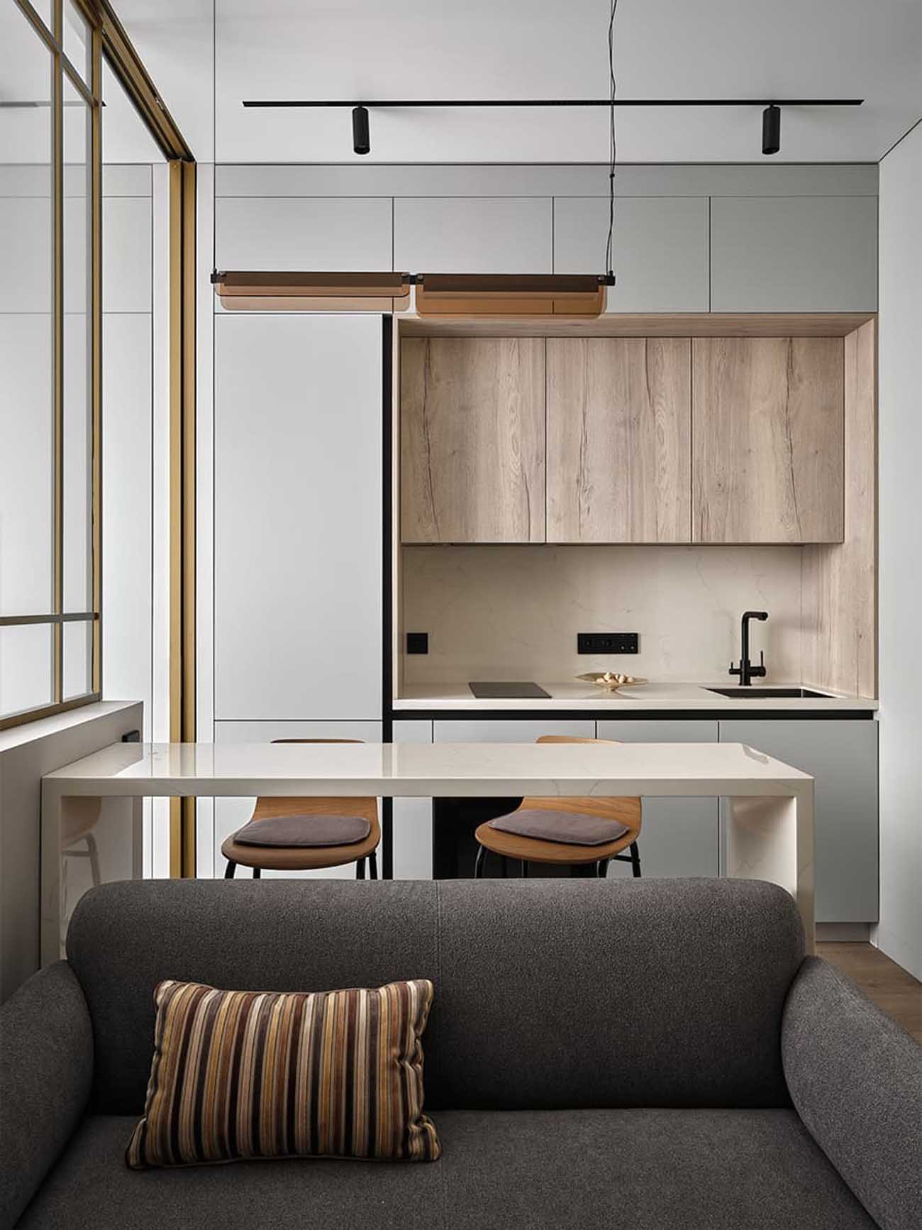A kompakt konyhabútor minden szükséges funkcióval rendelkezik, ugyanakkor vizuálisan nem nehezíti el a teret. A háztartási gépeket matt szürke frontok mögé rejtették, míg a középső szekciókhoz a tervezőcsapat világos fahatású ajtókat választott. A beépített bútorok nagy száma ellenére az enteriőr egyáltalán nem hat zsúfoltnak.