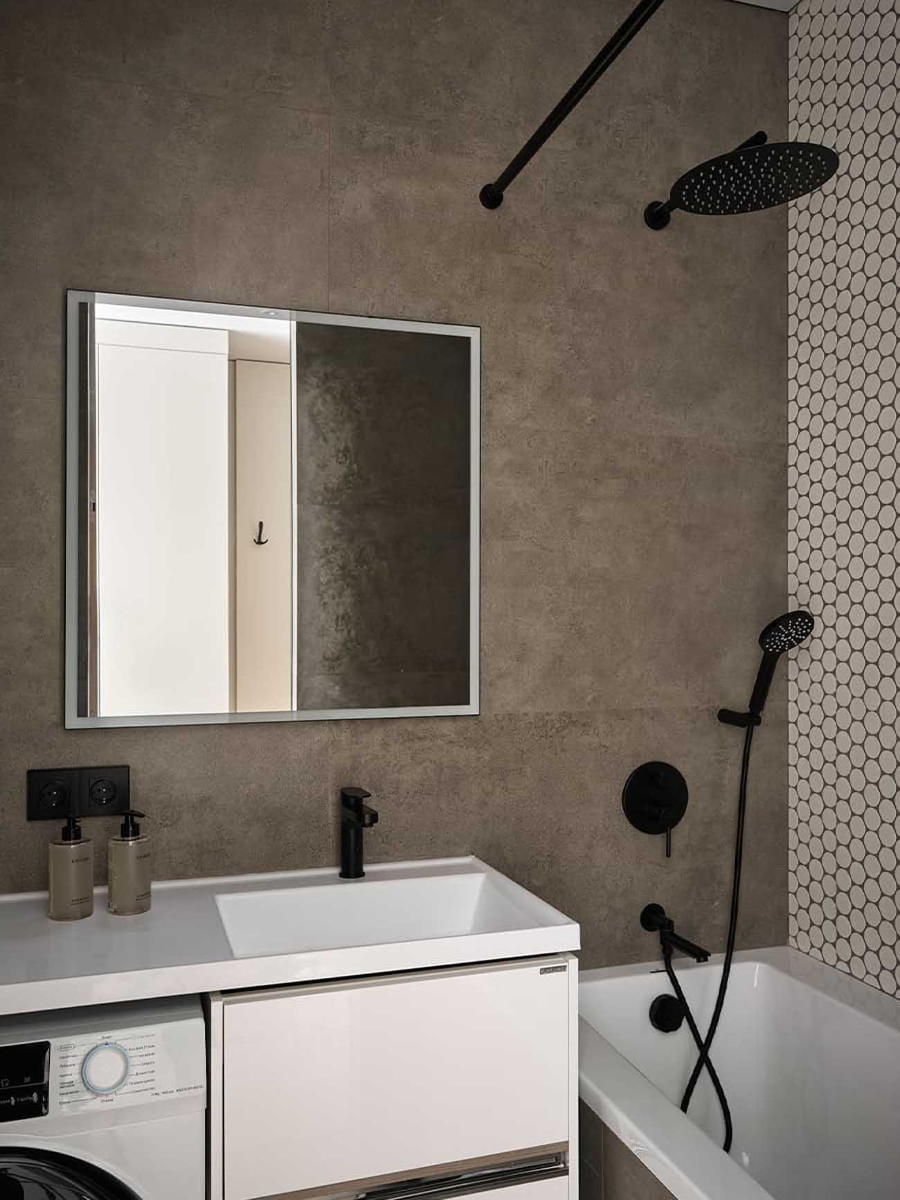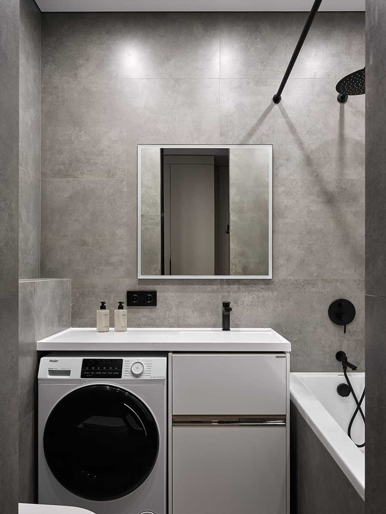 A fürdőszoba falait szürke greslapokkal burkolták, amely tökéletes hátteret biztosít a fókuszpontként szolgáló, fehér, kör alakú mozaikcsempének. A letisztult, egyenes vonalvezetésű mosdókagyló alatt pedig praktikusan a mosógép bújik meg.