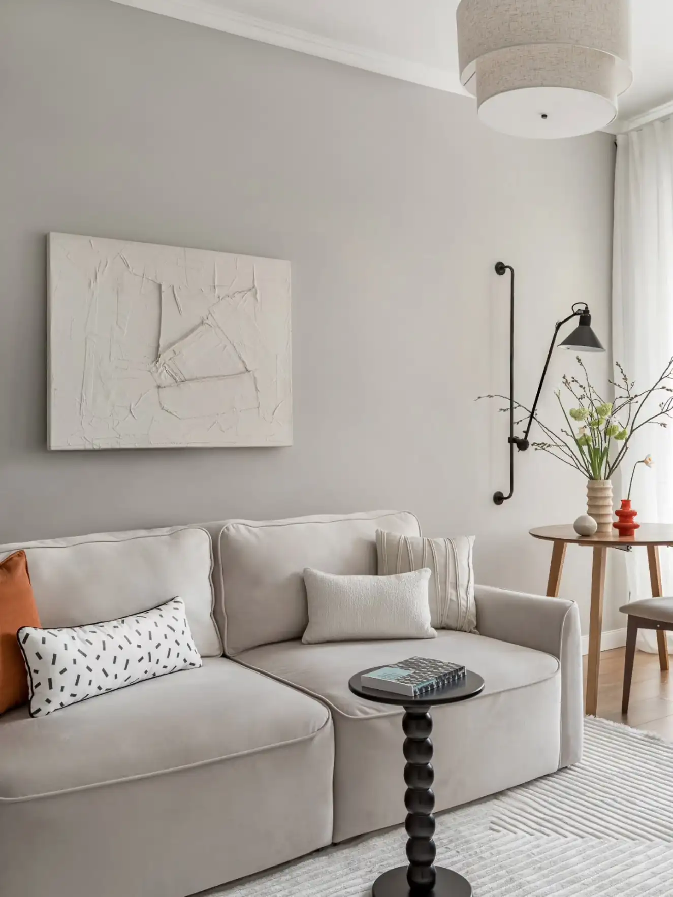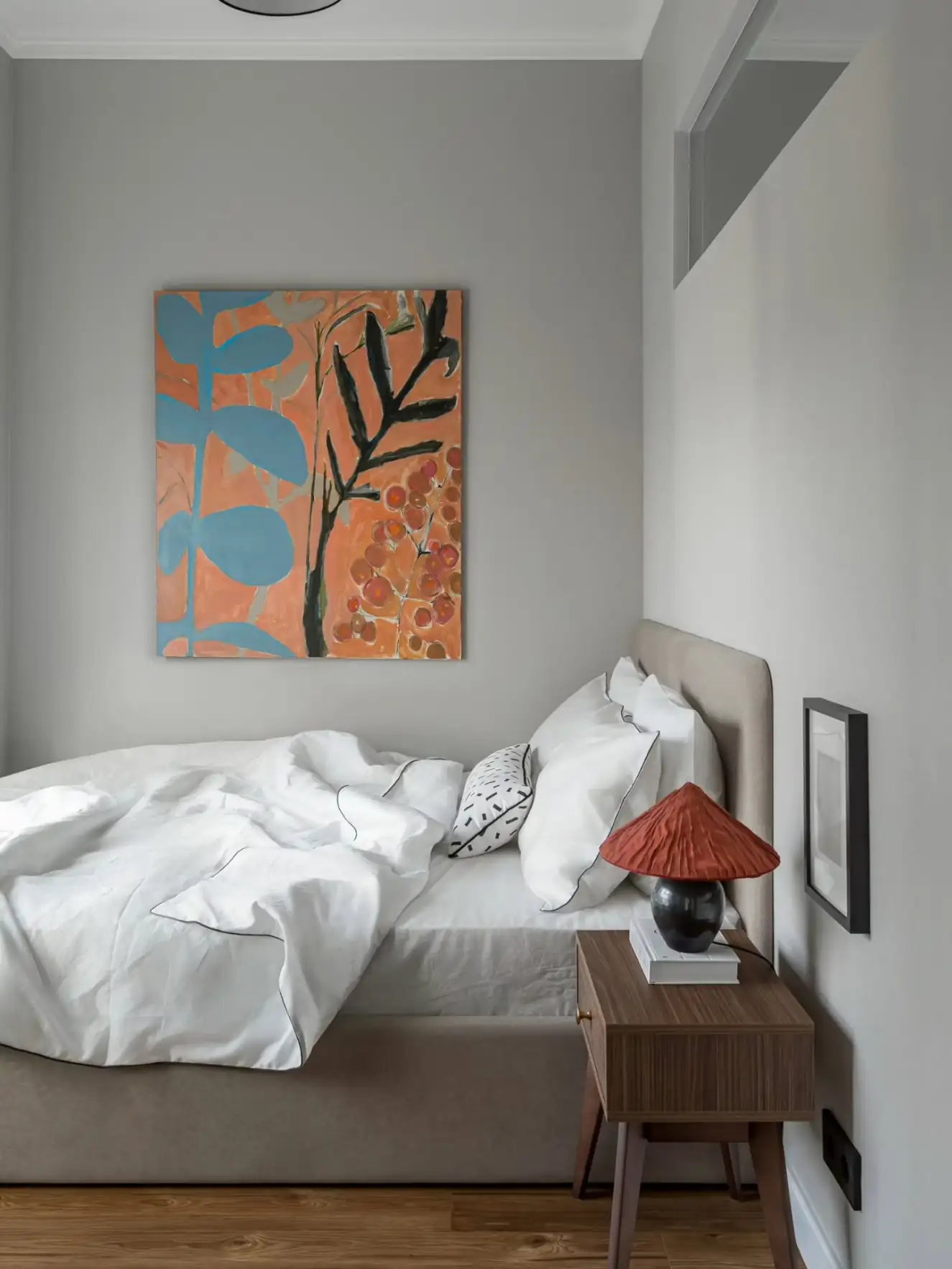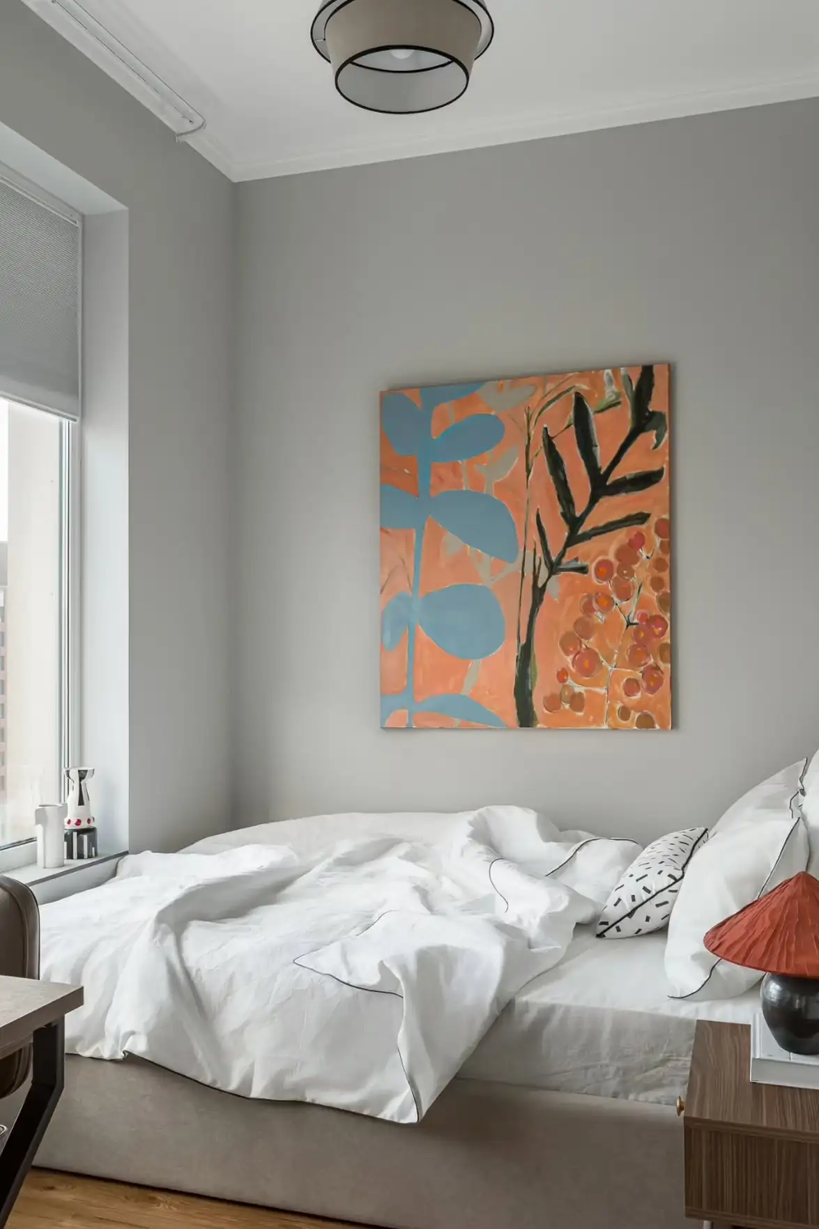 A dekoráció kimondottan visszafogott. A tervező a csendes, nyugodt hangulat megteremtésére fókuszált, és ennek szellemében a semleges szürke árnyalataira alapozta a színpalettát. Az esetleges egyhangúságot néhány jól elhelyezett, élénkebb színfolttal törte meg, míg az otthonos, természetes hatást a meleg tónusú, fahatású laminált padló és a puha textíliák használata erősíti.