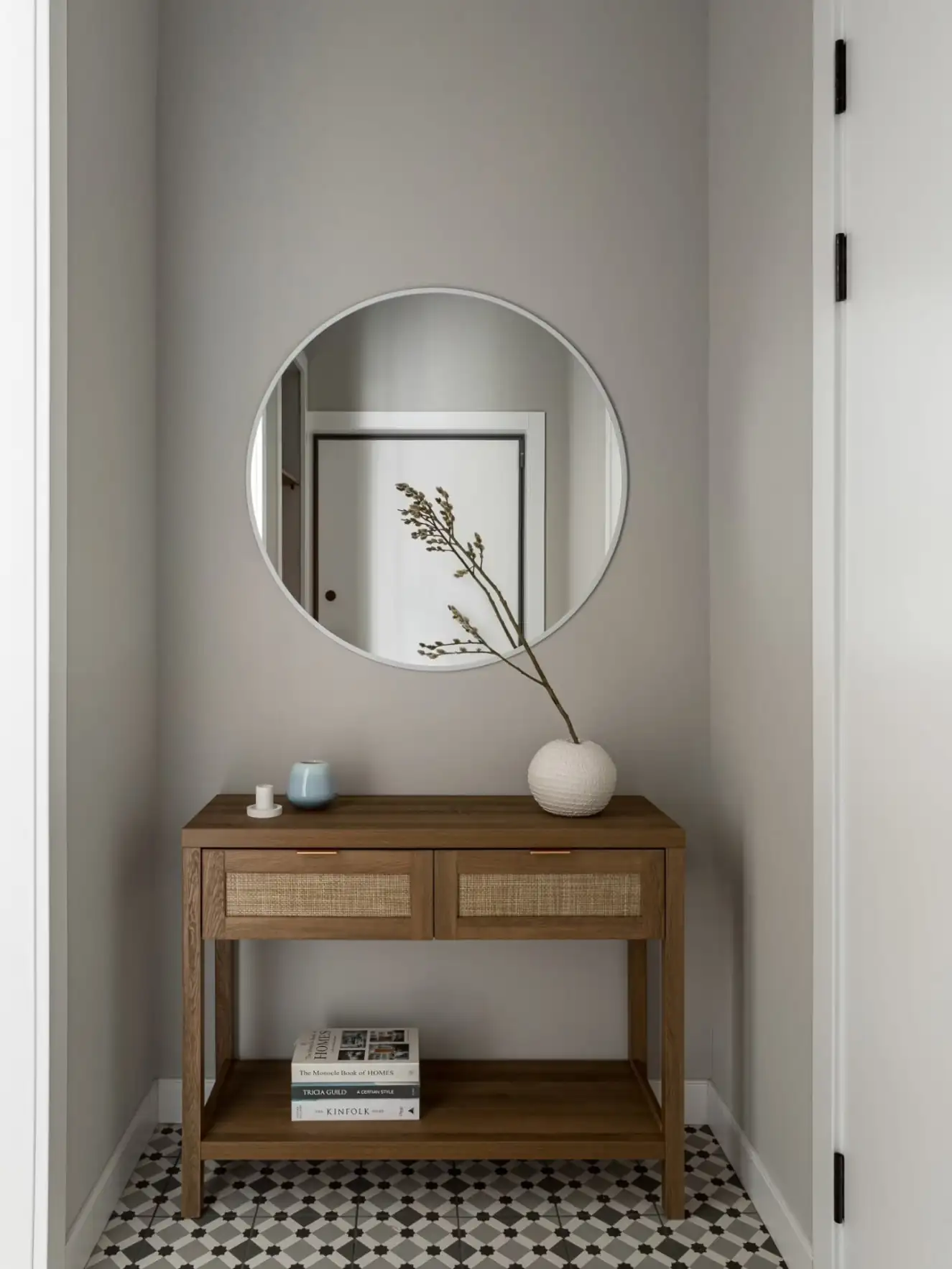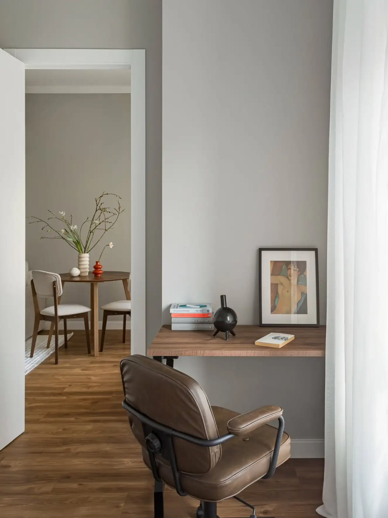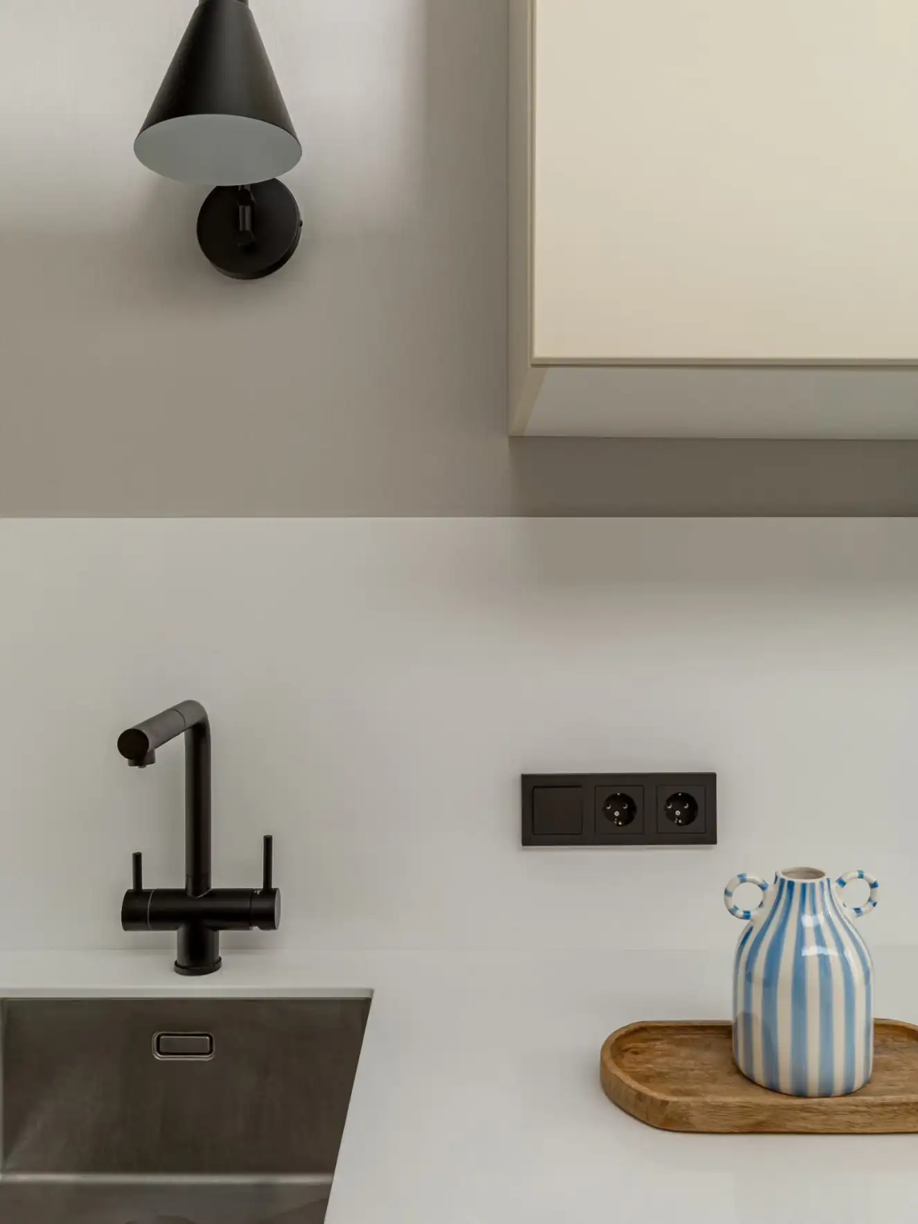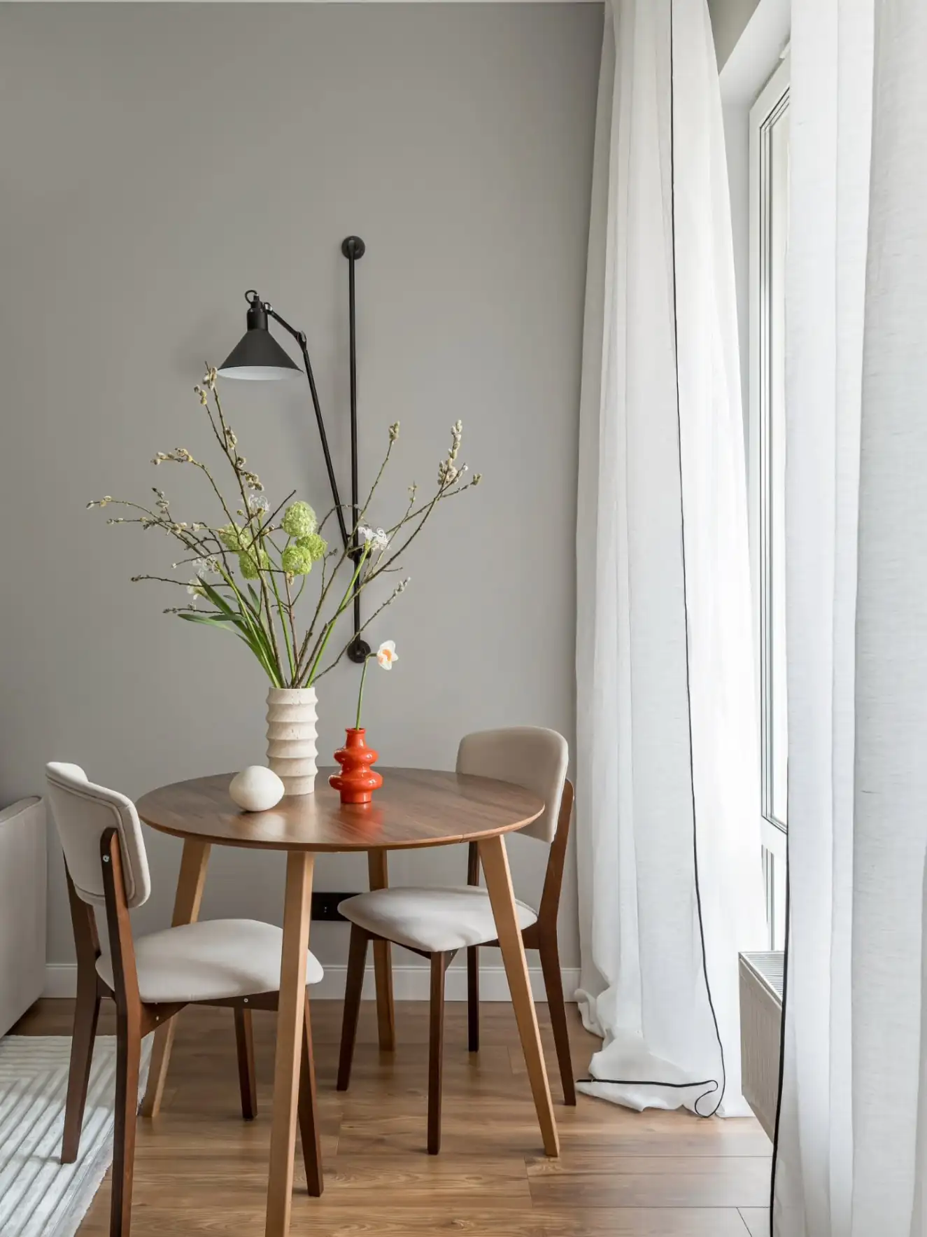 A dekoráció kimondottan visszafogott. A tervező a csendes, nyugodt hangulat megteremtésére fókuszált, és ennek szellemében a semleges szürke árnyalataira alapozta a színpalettát. Az esetleges egyhangúságot néhány jól elhelyezett, élénkebb színfolttal törte meg, míg az otthonos, természetes hatást a meleg tónusú, fahatású laminált padló és a puha textíliák használata erősíti.