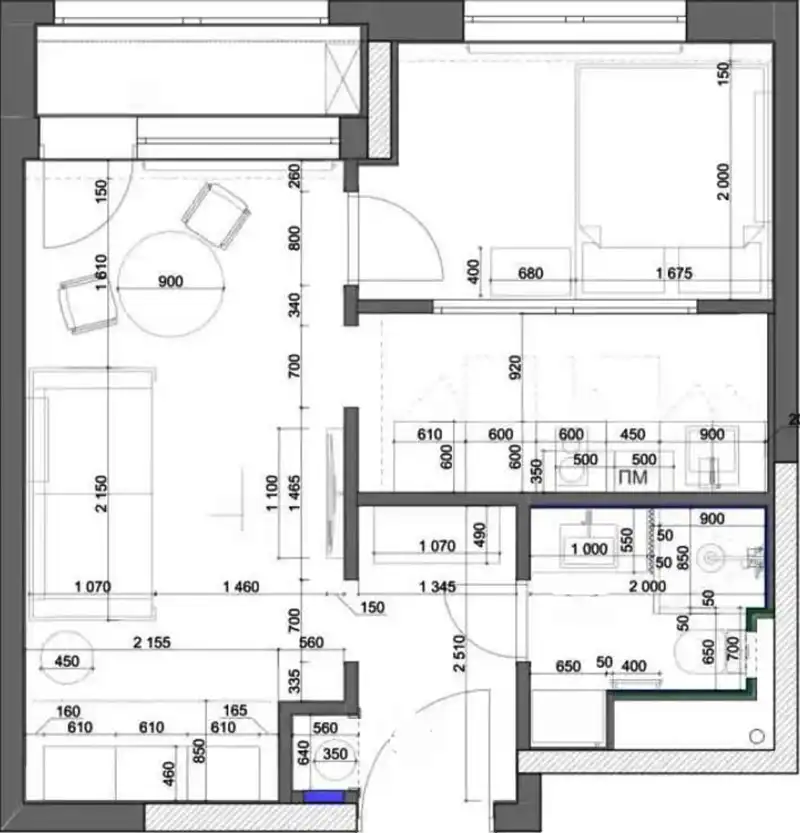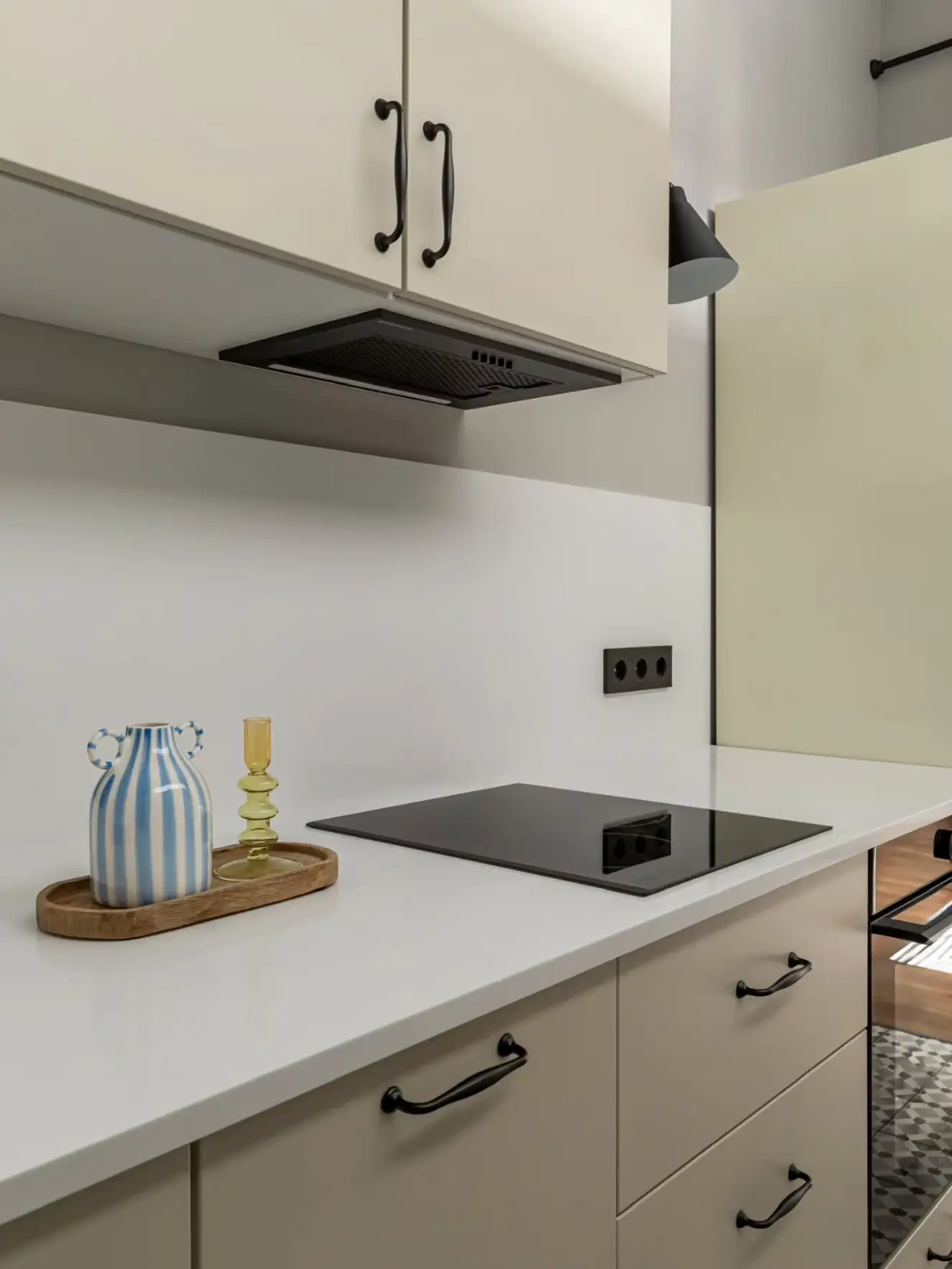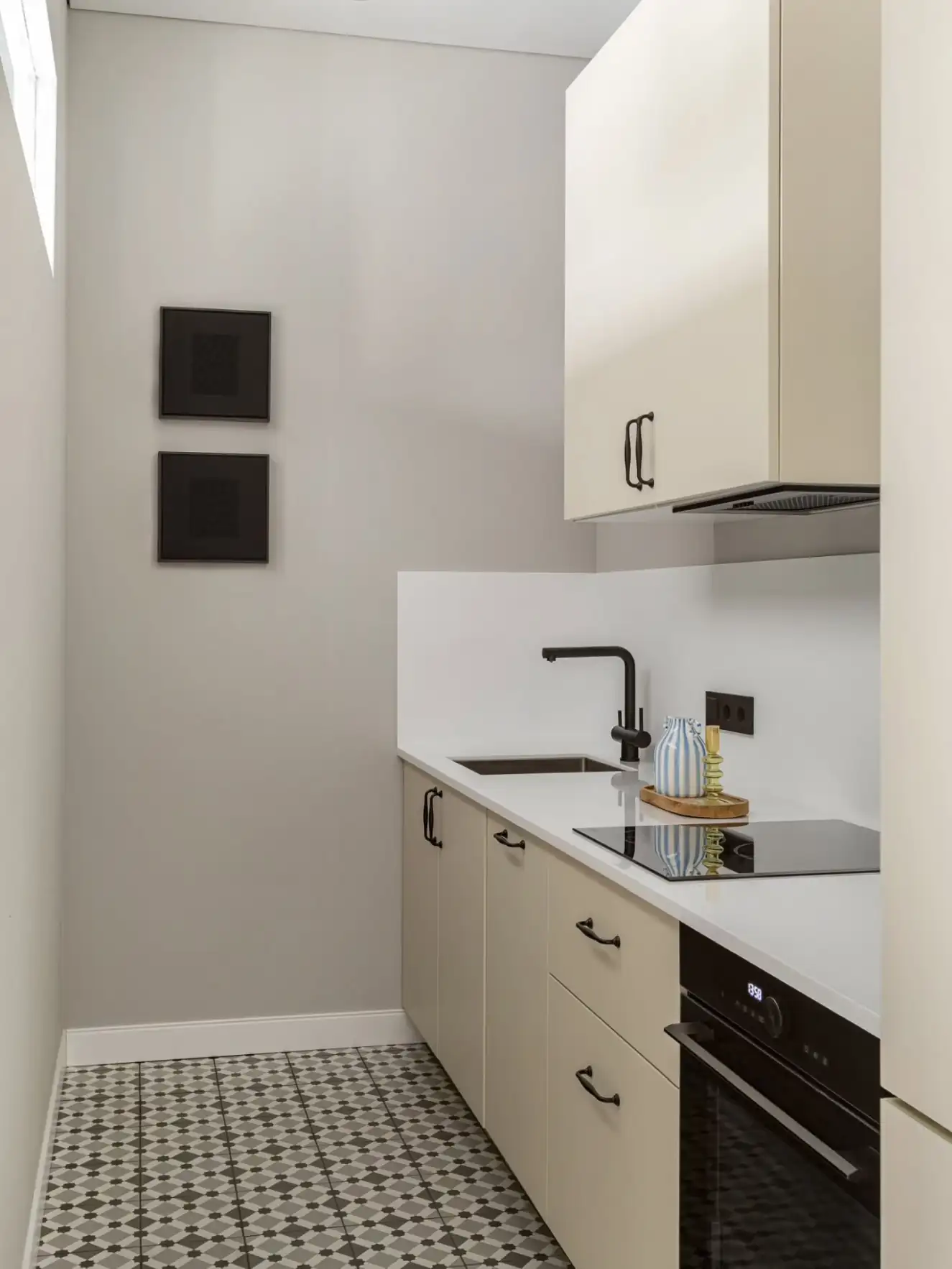 A térszervezés során egy rendhagyó elosztás mellett döntöttek: a konyha nem a nappalival egybenyitva kapott helyet – ezt a területet a már említett, függönnyel rejtett gardrób foglalja el –, hanem a hálószoba mögött alakítottak ki a funkció számára egy ablaktalan, keskeny helyiséget. Hogy a főzőzóna mégse maradjon természetes fény nélkül, a hálószobával közös fal felső részébe egy belső ablakot építettek be.