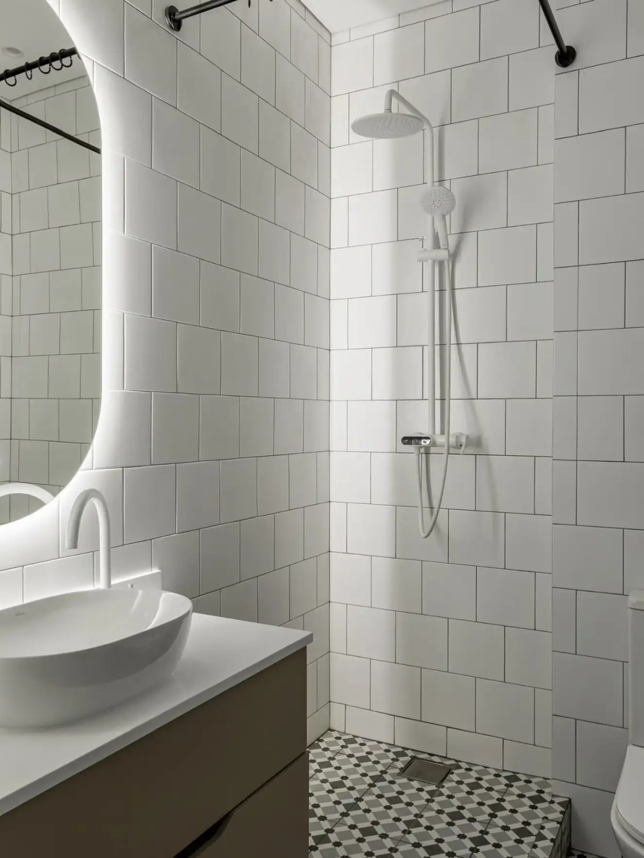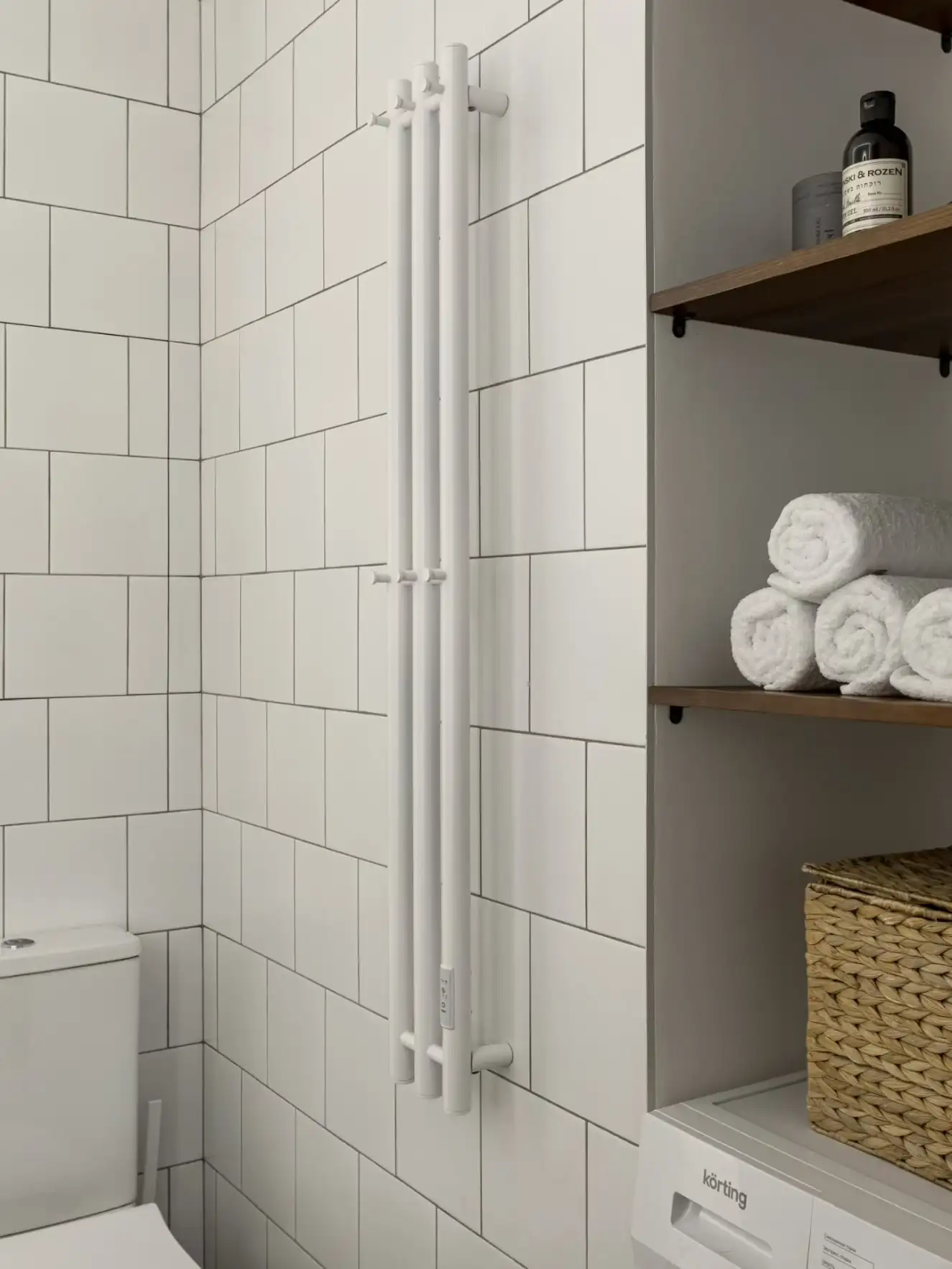 Egy szerkezetkészen átvett új építésű lakást rendezett be a belsőépítész. A szűkös költségkeret miatt egyszerűen megvalósítható megoldásokban gondolkodtak, mint a nappaliban függönnyel leválasztott gardrób, vagy a fehér, négyzet alakú csempével burkolt fürdőszoba.
