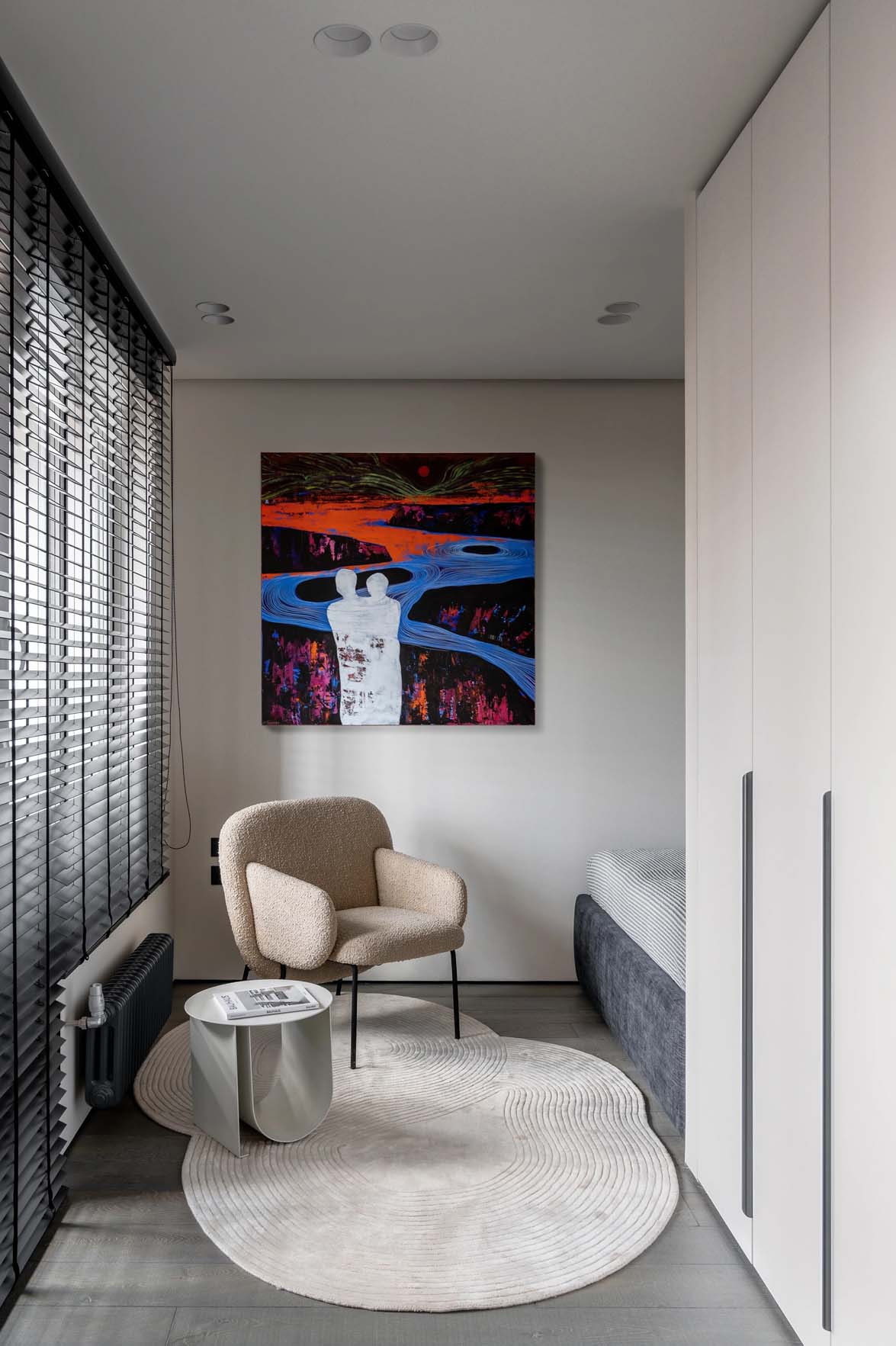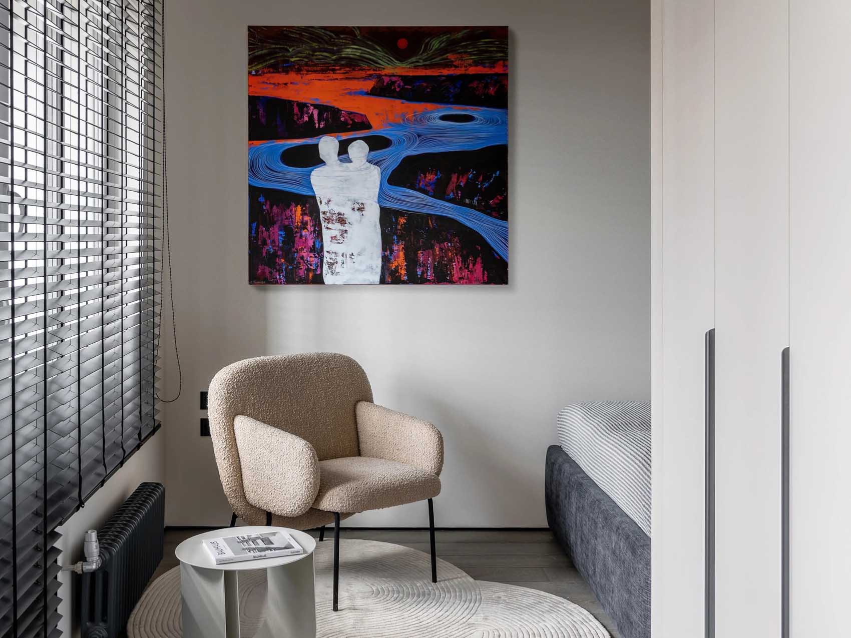 „Mivel a lakás kicsi, és a jövőben a bérbeadás is szemponttá válhat, a burkolatokat és a bútorokat az optimális ár-érték arányt szem előtt tartva, a közép-árkategóriából választottuk. Szeretnék kiemelni néhány jól sikerült részletet: az egyedi formavilágú fotelt és az ágy fejvég mögött kialakított praktikus fülkét. Ez ideális hely egy könyvnek vagy a töltés alatt lévő kütyüknek, így azok nincsenek szem előtt, és nem foglalják feleslegesen a helyet.” – osztja meg a tervező.