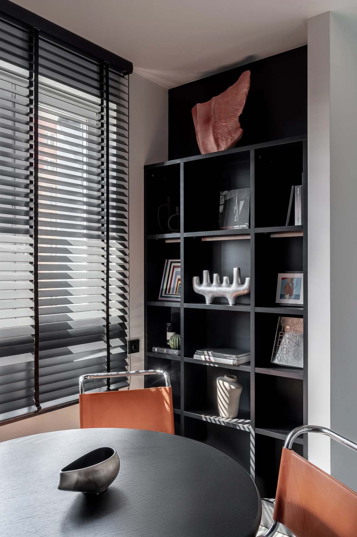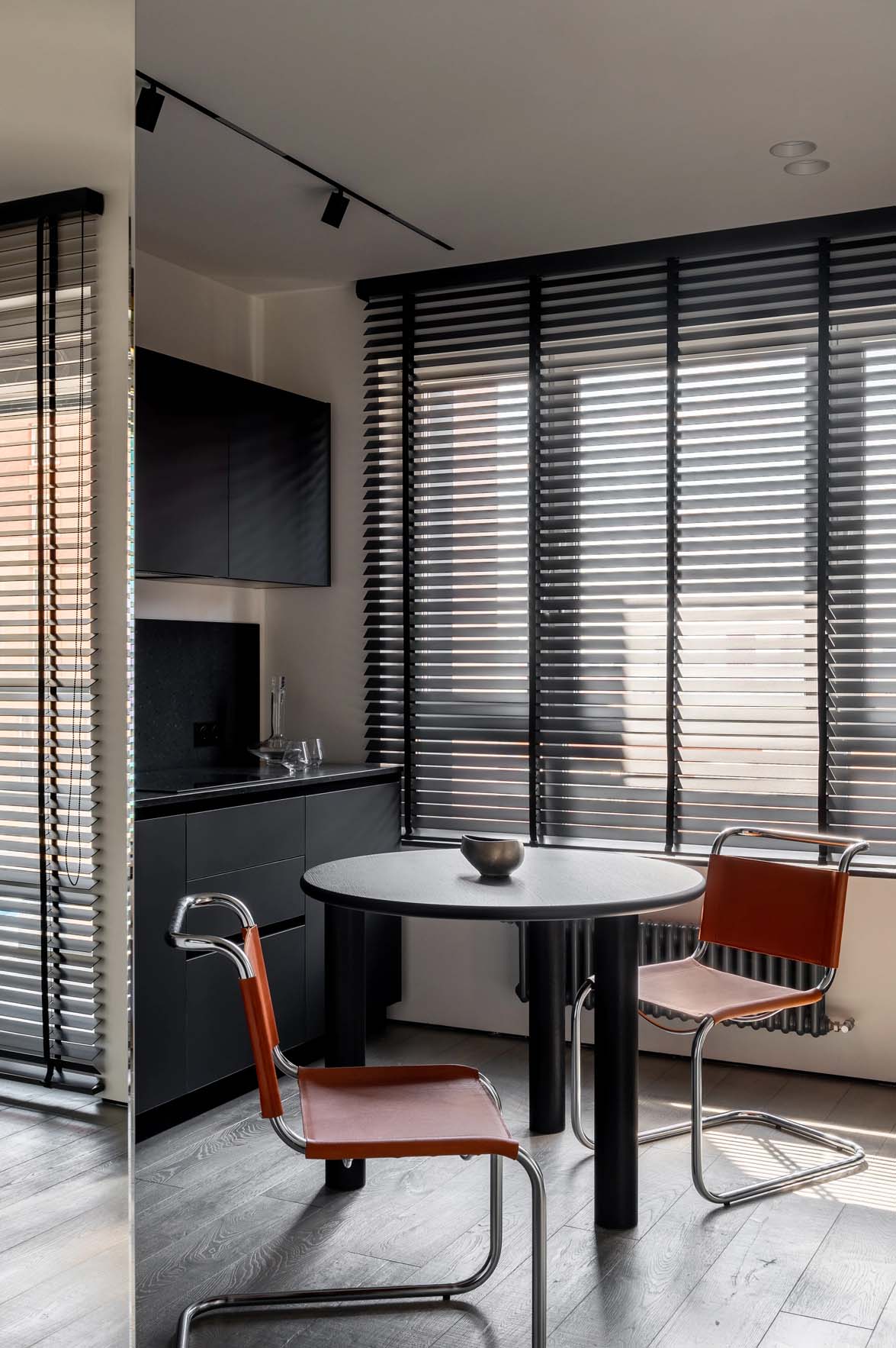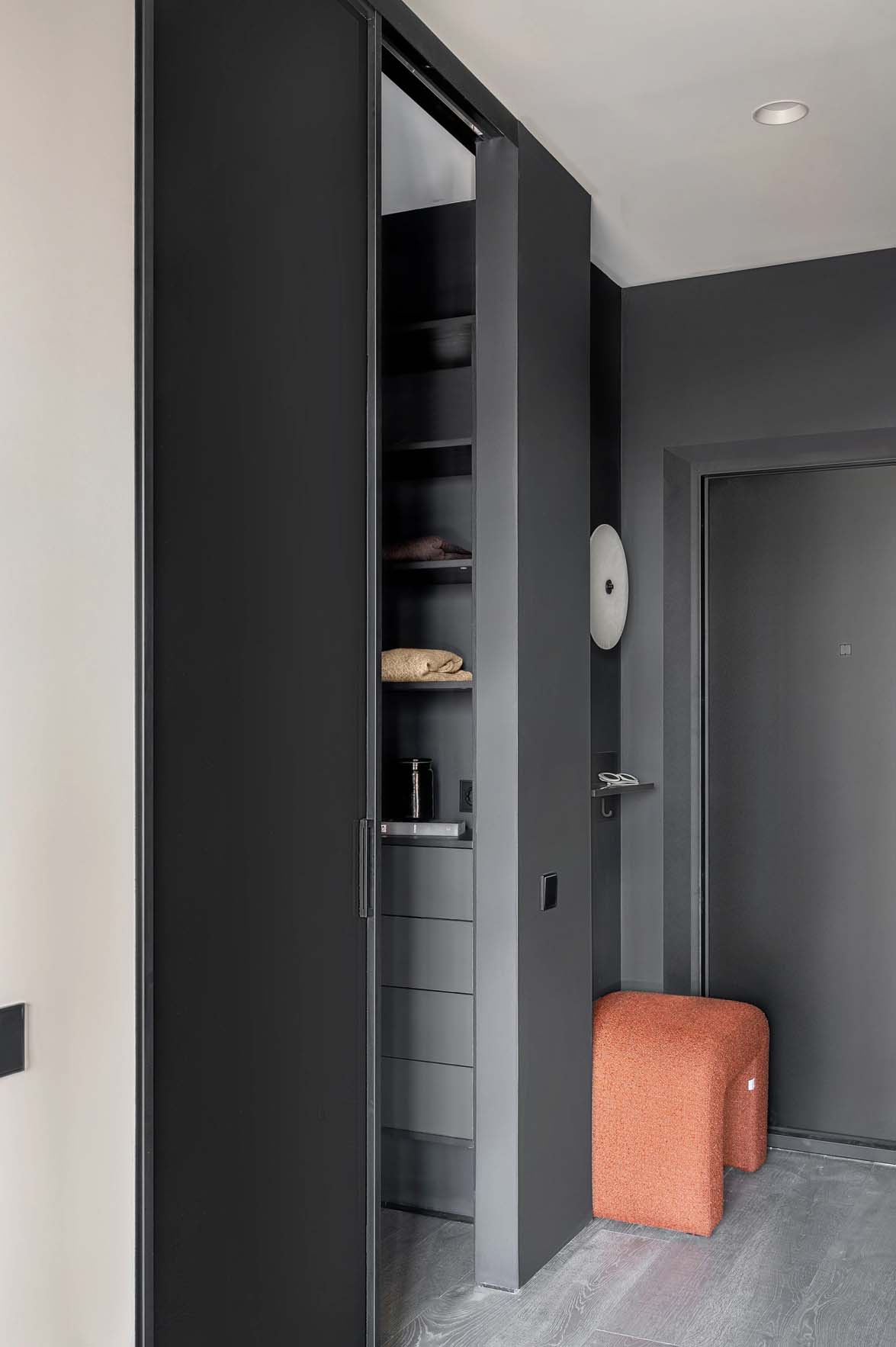 A legfőbb kihívás az volt, hogy az egyszobás lakást olyan stílusos és funkcionális térré formálják, amely passzol a képregénygyűjtő tulajdonos személyiségéhez is. Ehhez egy merész tervezői eszközt vetettek be: a falak és bútorok esetében a terek vizuális tagolására, a zónák kijelölésére a fekete színt használták.