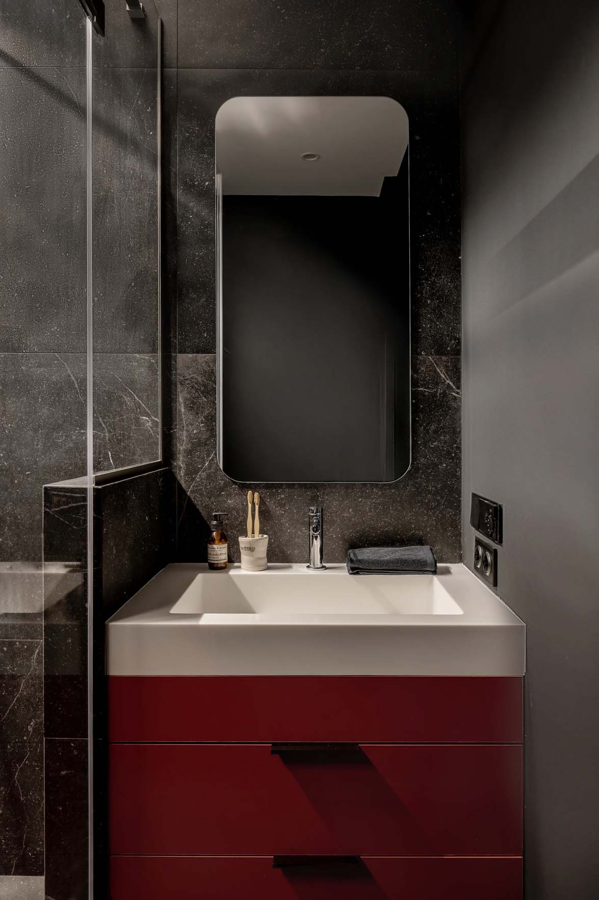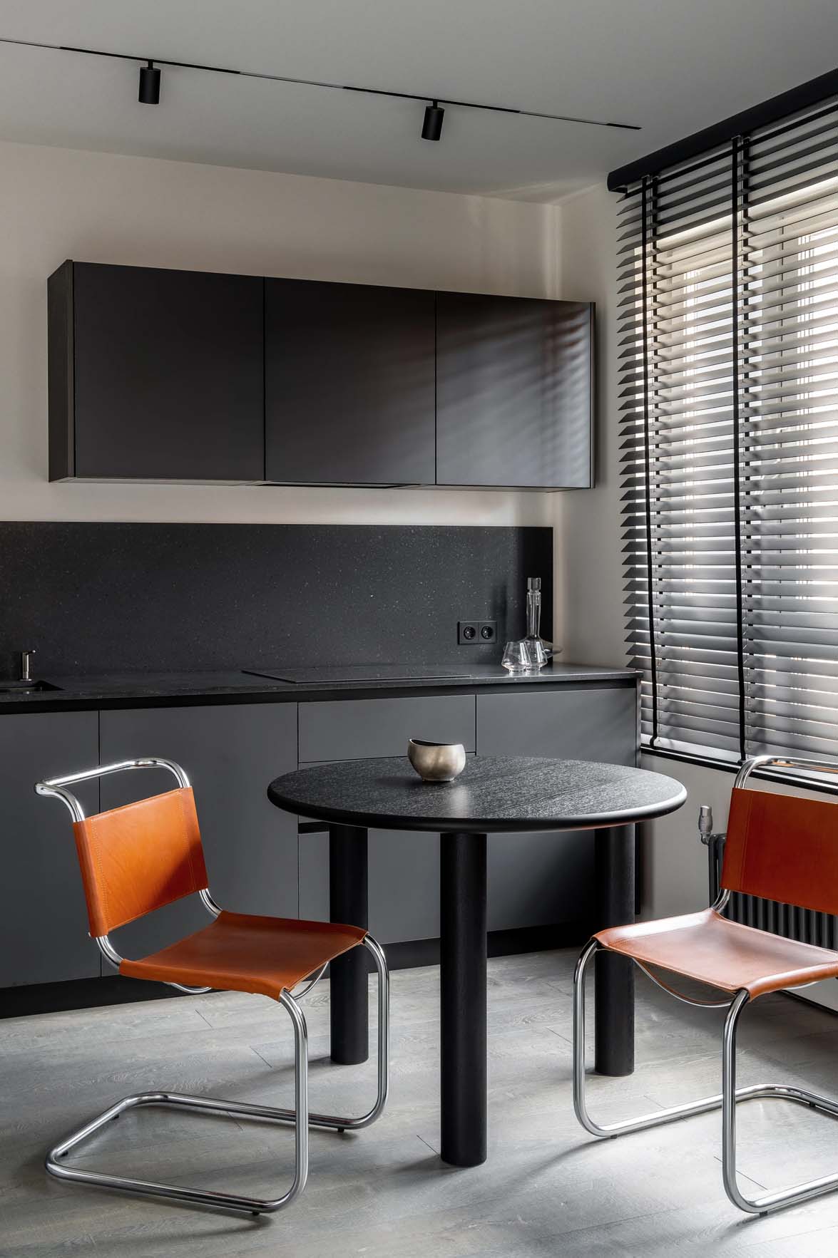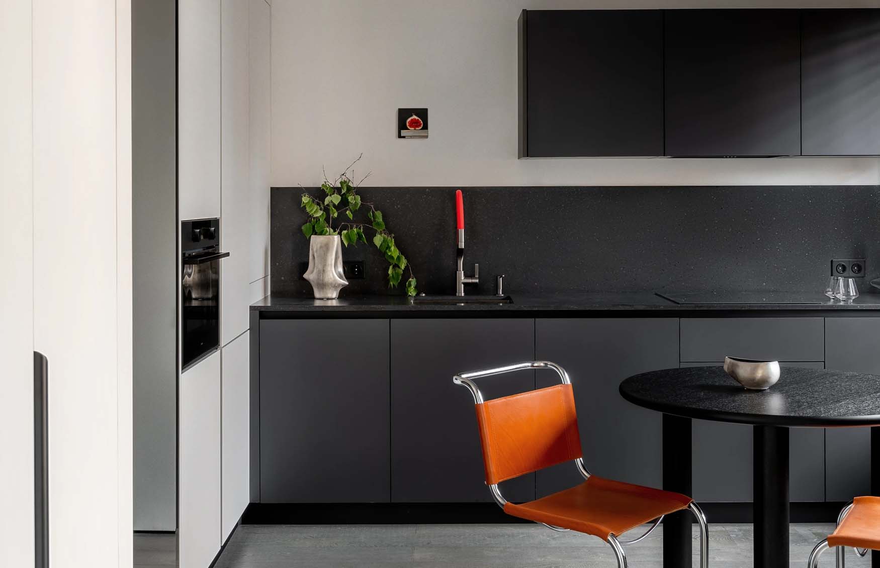 „Különösen jó választásnak bizonyultak a bútorfrontok. Az alapanyagot a férfi szülei ajánlották, akik egy kisebb bútorgyártó vállalkozás tulajdonosai. A kellemes tapintású, ujjlenyomatmentes felület látványos kontrasztot alkot a matt, terrazzo mintázatú kvárckompozit munkalappal. A karakteres, vörösesbarna bőrkárpitozású étkezőszékek finom retro hangulattal gazdagítják az enteriőrt. A színpaletta – a fekete és a karakteres vörösesbarna párosa – már a koncepcióterv fázisában véglegessé vált. Így elhagyhattuk az időigényes 3D-látványtervezést, amivel időt és energiát spóroltunk, és azonnal belekezdhettünk a megvalósításba. A feketével a kiegyensúlyozott arányokat teremtettük meg, míg a vörösesbarna az izgalmas vizuális hangsúlyokért felel.” – meséli a lakberendező.