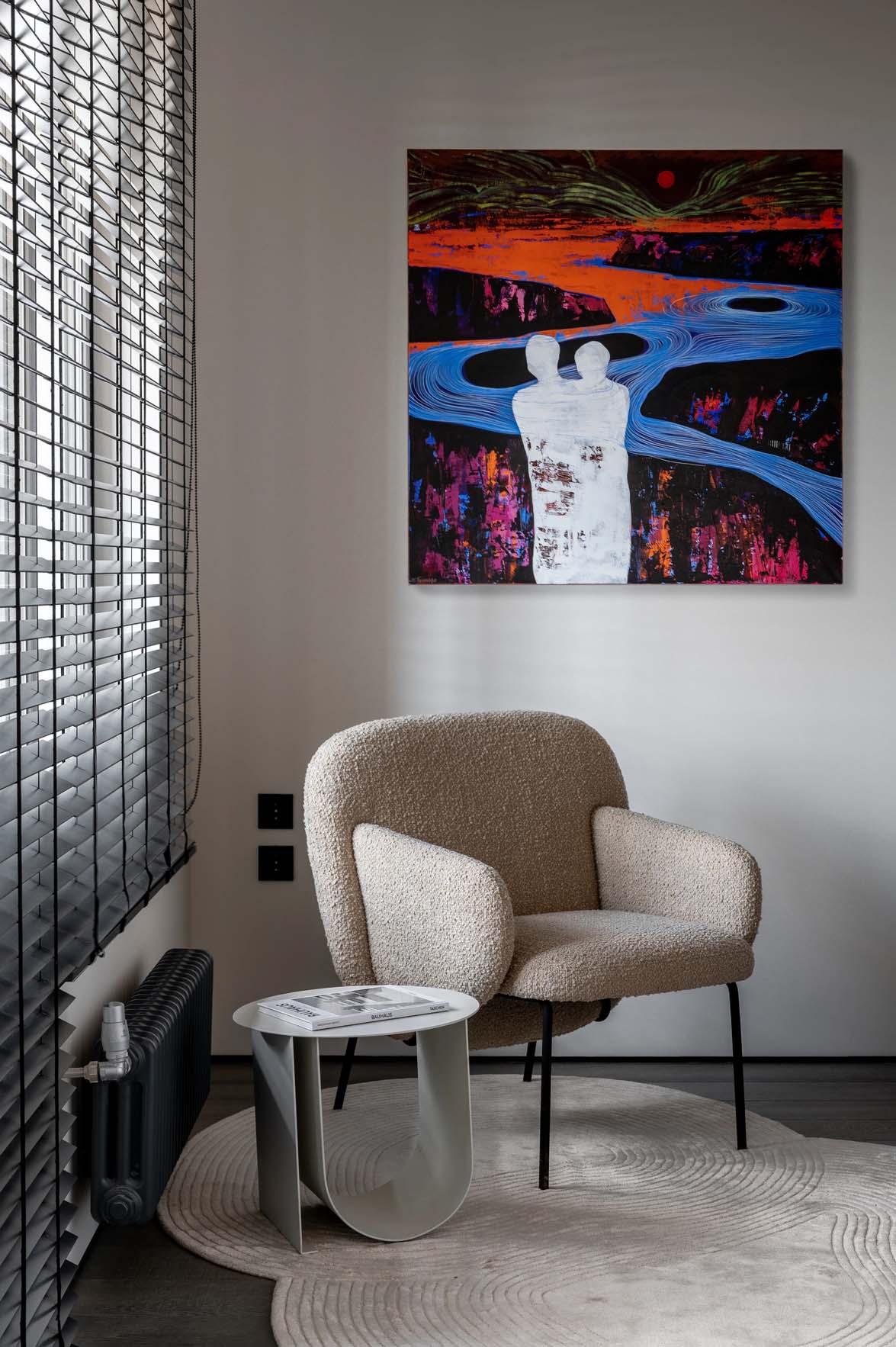 Az egyszobás kis lakást ismerősei fiának rendezte be a belsőépítész. A fiatalember sokszor tartja a kapcsolatot munkahelyével videós megbeszélések formájában, így a lakás kis alapterülete ellenére is kulcsfontosságú volt a közösségi tér és a háló zóna funkcionális elválasztása, valamint a hatékony hangszigetelés kialakítása.