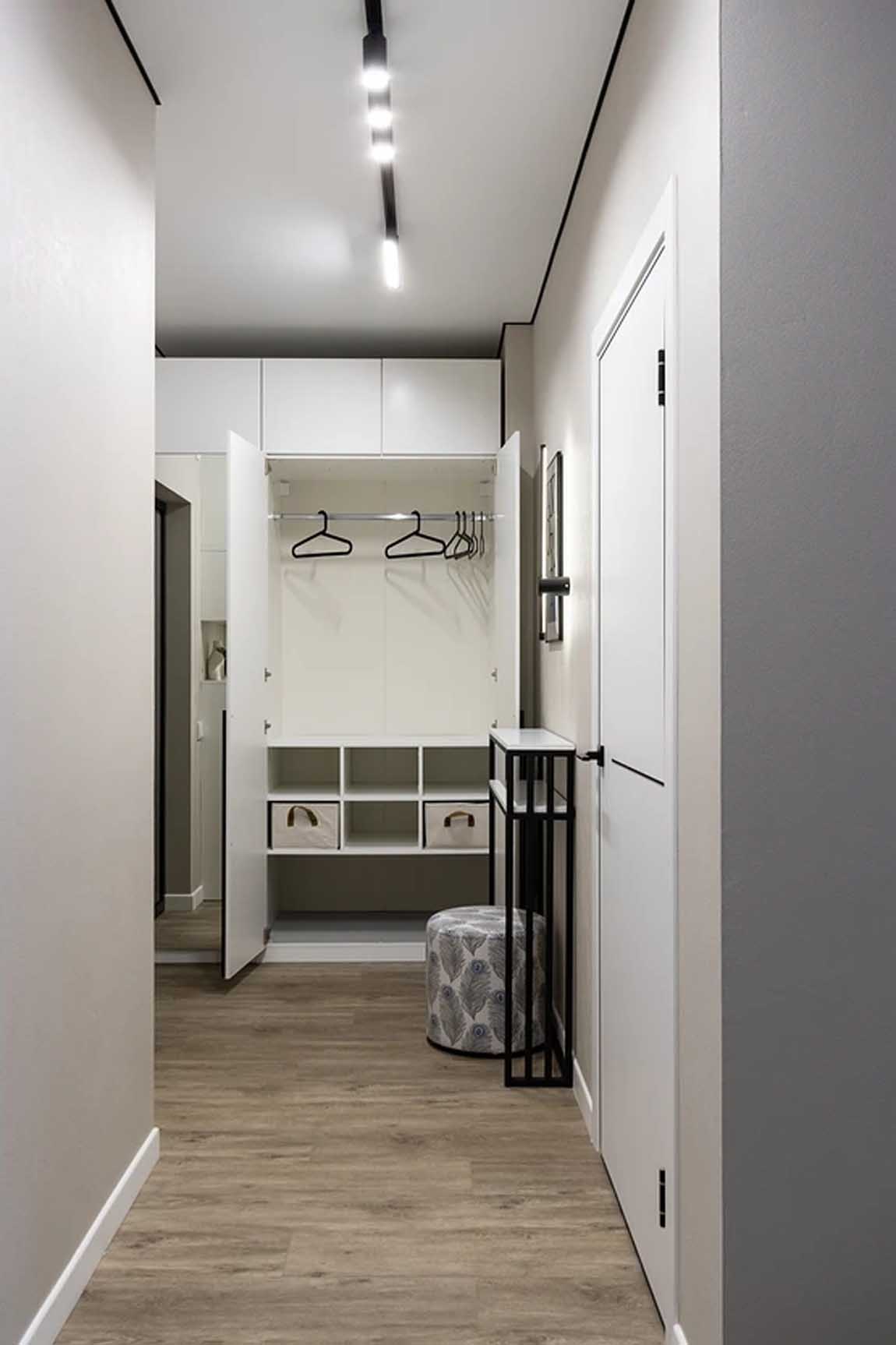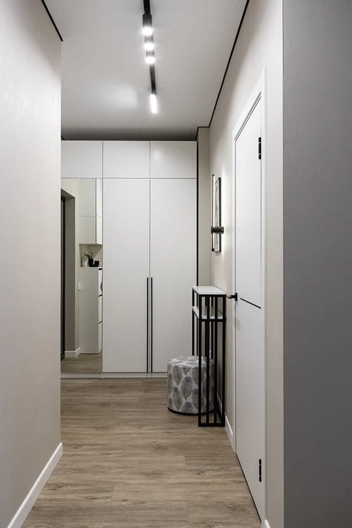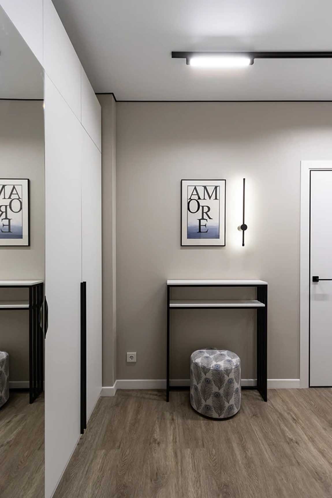 A bejárati zóna világos és funkcionális. Egy teljes falat elfoglaló, majdnem plafonig érő szekrény biztosítja a tárolást, melynek egyik ajtaja teljes alakos tükörként is funkcionál. A világos falak és a fa hatású padló tágítják a teret, míg a fekete sínlámpa és a vékony, fémvázas konzolasztal grafikus kontrasztot adnak.