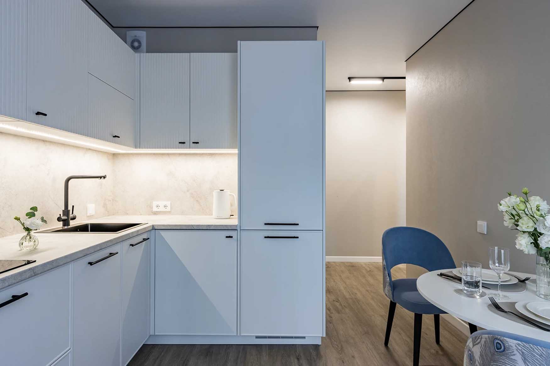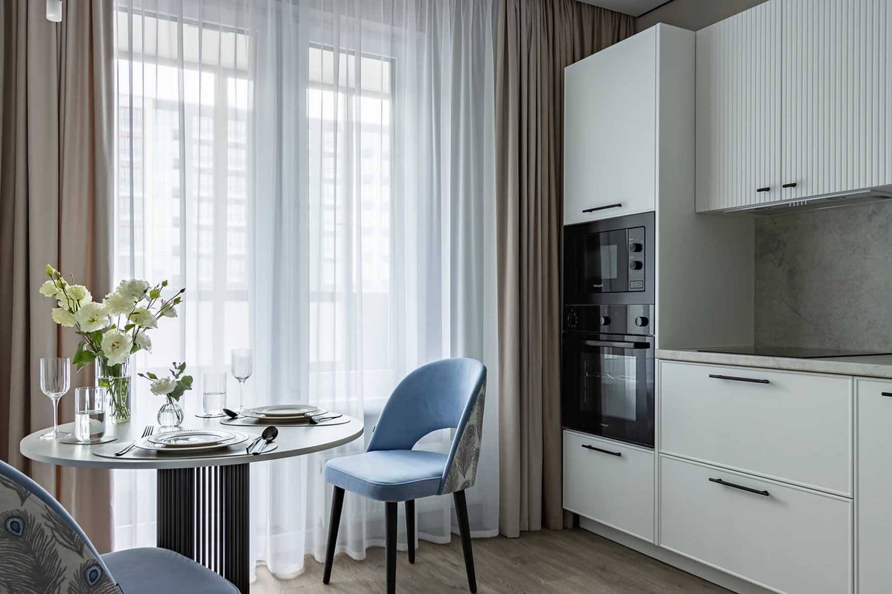 A korlátozott költségvetéshez igazodva kialakított konyha a minimalista vonalat követi: fehér frontok, melyek közül a felső szekrények texturált, bordázott felületet kaptak. A szürke, betonhatású hátfal és munkalap elegáns hátteret ad. Minden gép (sütő, mikró, mosogatógép, sőt a mosógép is) beépített, így a megjelenés egységes. A kis, kerek étkezőasztal és a kék kárpitos székek finom színfoltot visznek a térbe.