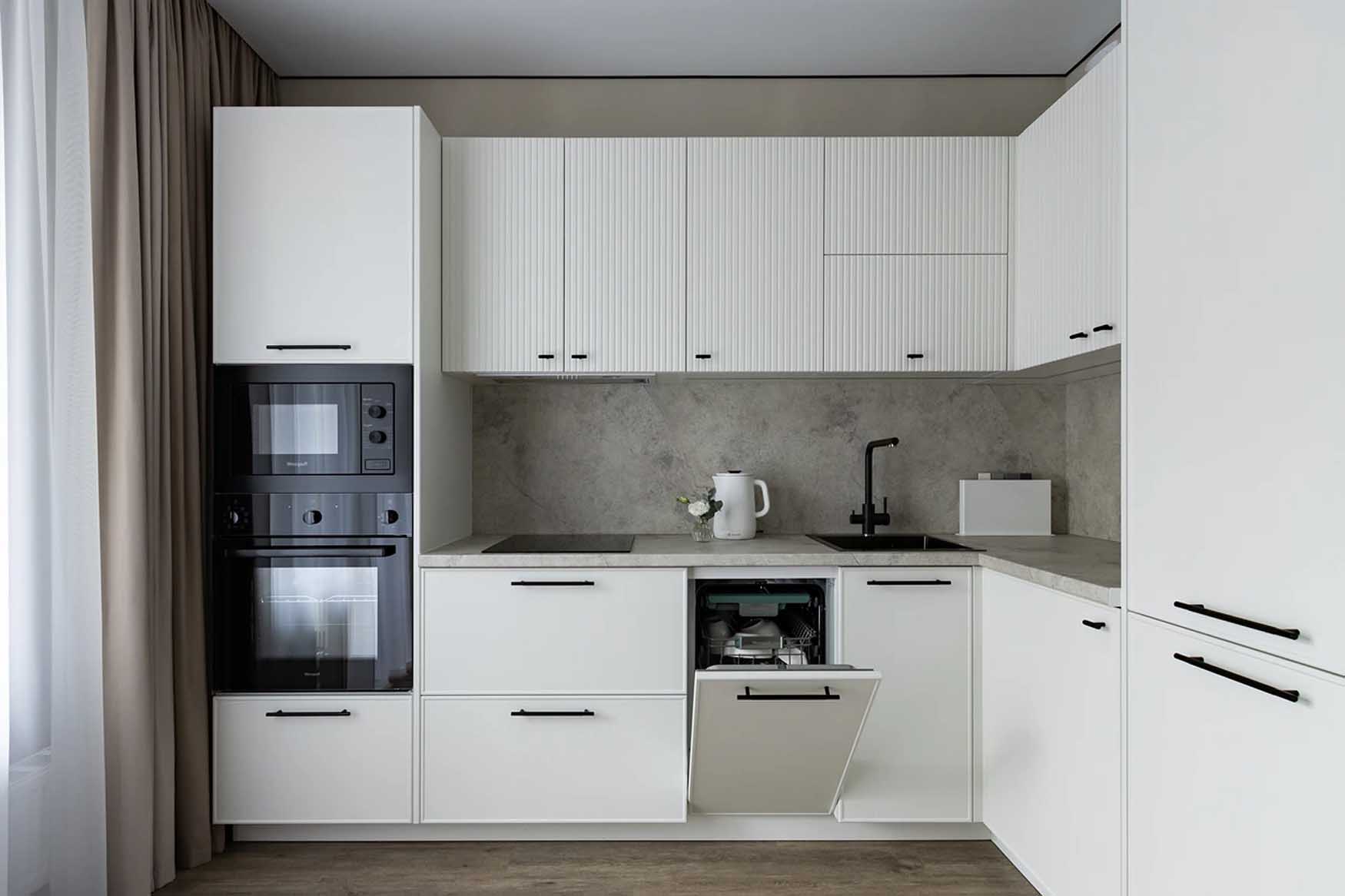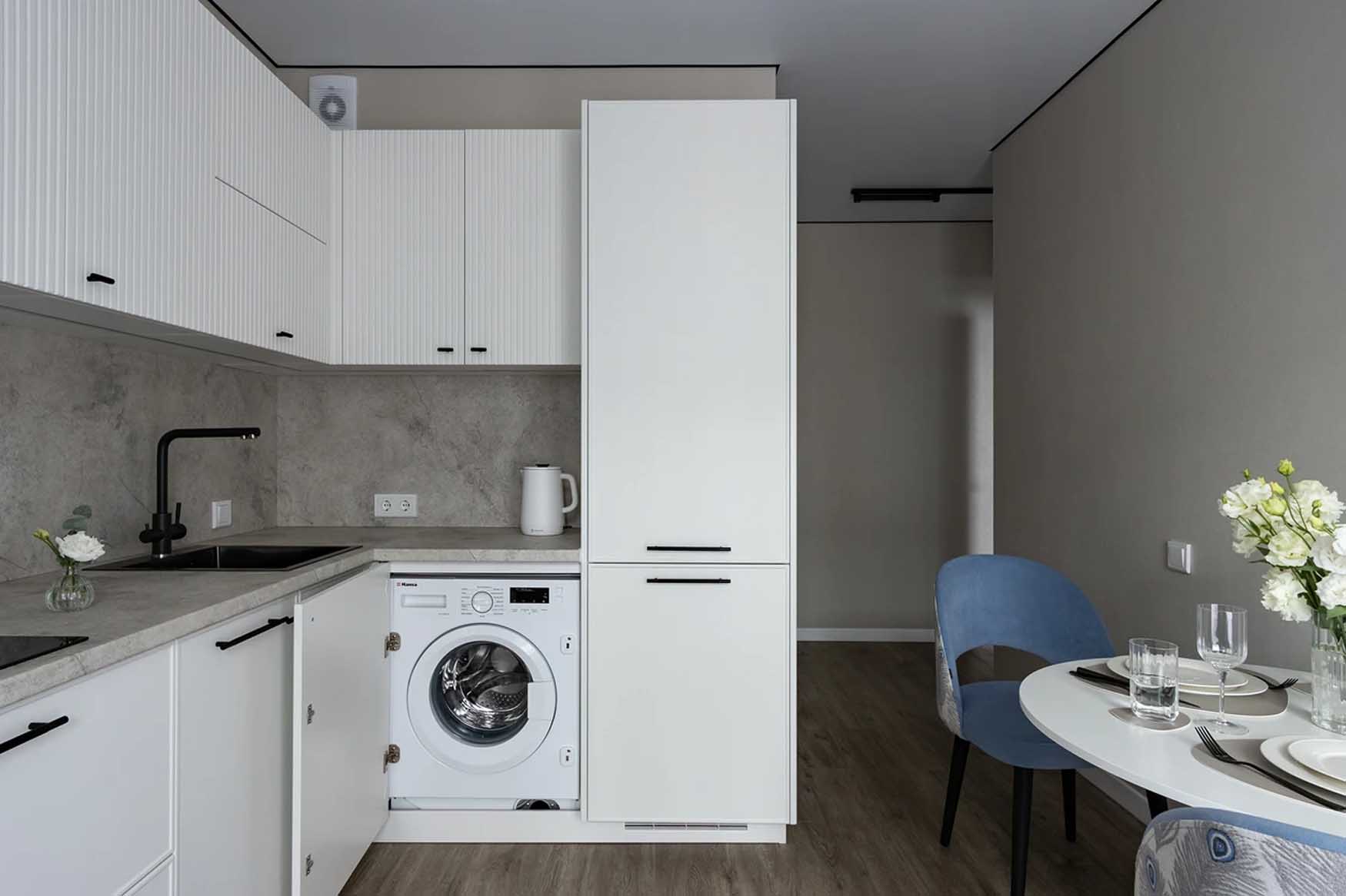 Profi Tipp: Kis alapterületű lakásokban, ahol nincs hely külön mosókonyhának, kézenfekvő és praktikus megoldás a mosógép elhelyezése a konyhapult alá – ezzel sok helyet spórolhatunk meg. Válasszunk beépíthető modellt, vagy egyező bútorfronttal takarjuk el, így a konyha megjelenése egységes és rendezett marad.