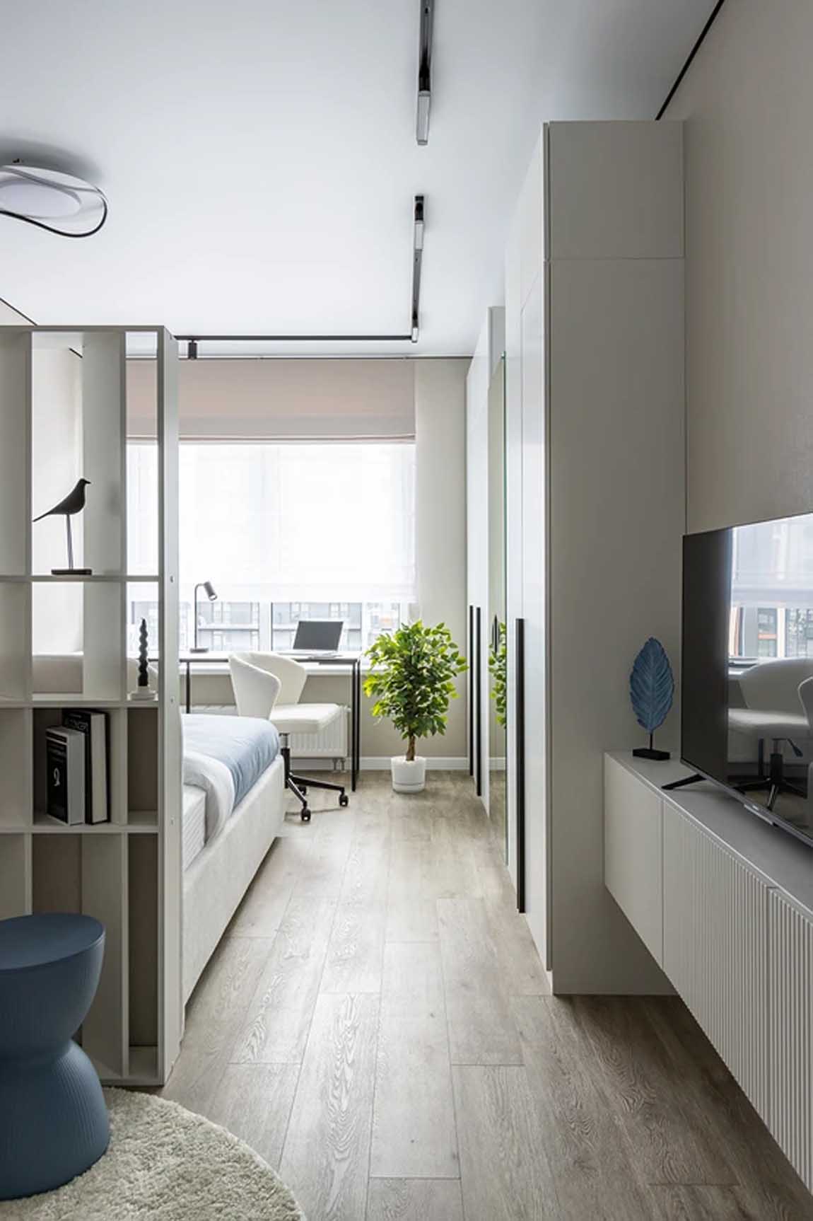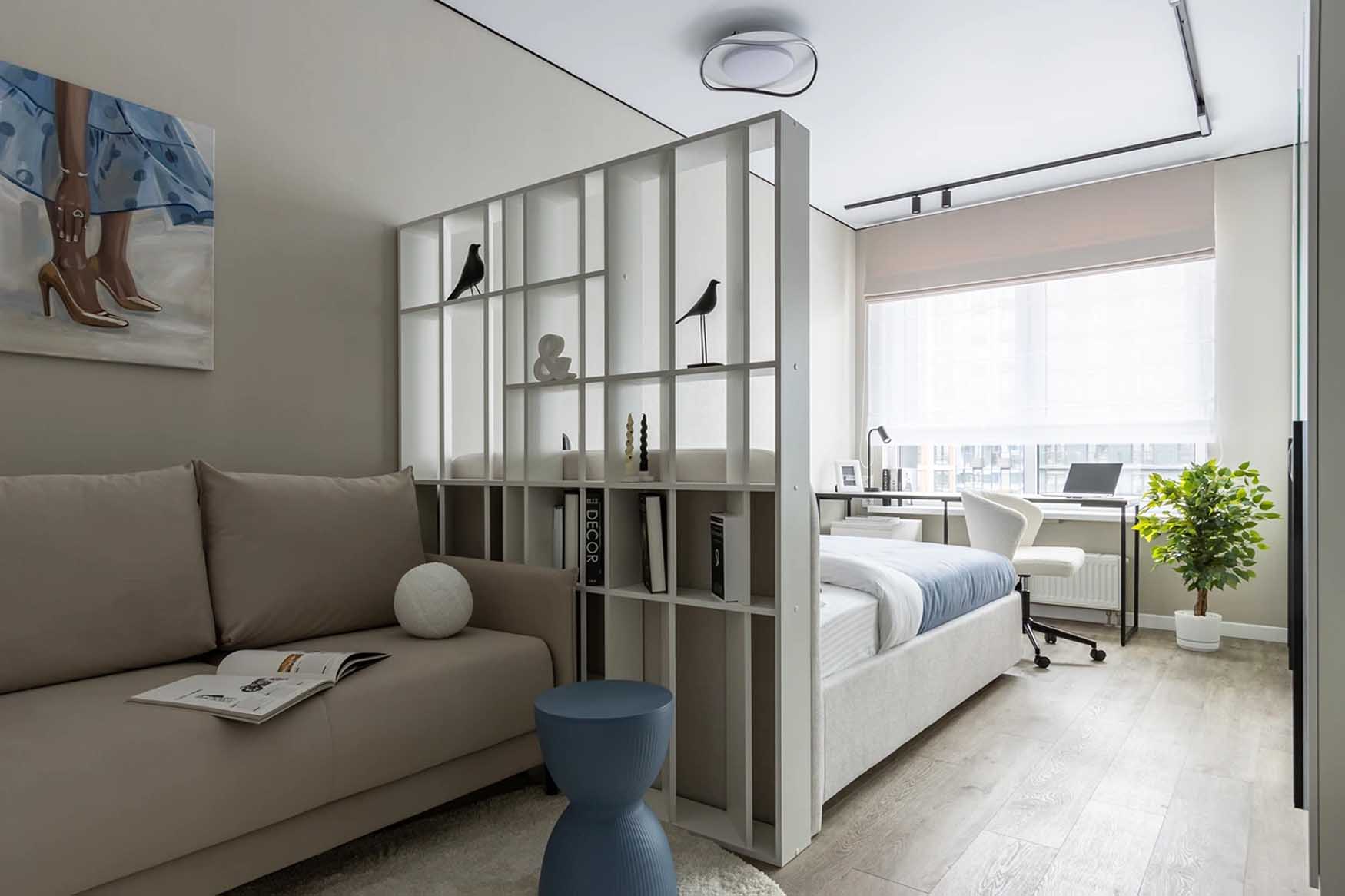 Profi Tipp: Egyszobás lakásokban a funkciók elválasztására egy tömör fal helyett használjunk nyitott polcrendszert. Ez a megoldás vizuálisan tagolja a teret (pl. elválasztja az alvó- és a nappali zónát), mégis átengedi a természetes fényt és szellős marad, ráadásul értékes tárolóhelyet is nyerünk vele.