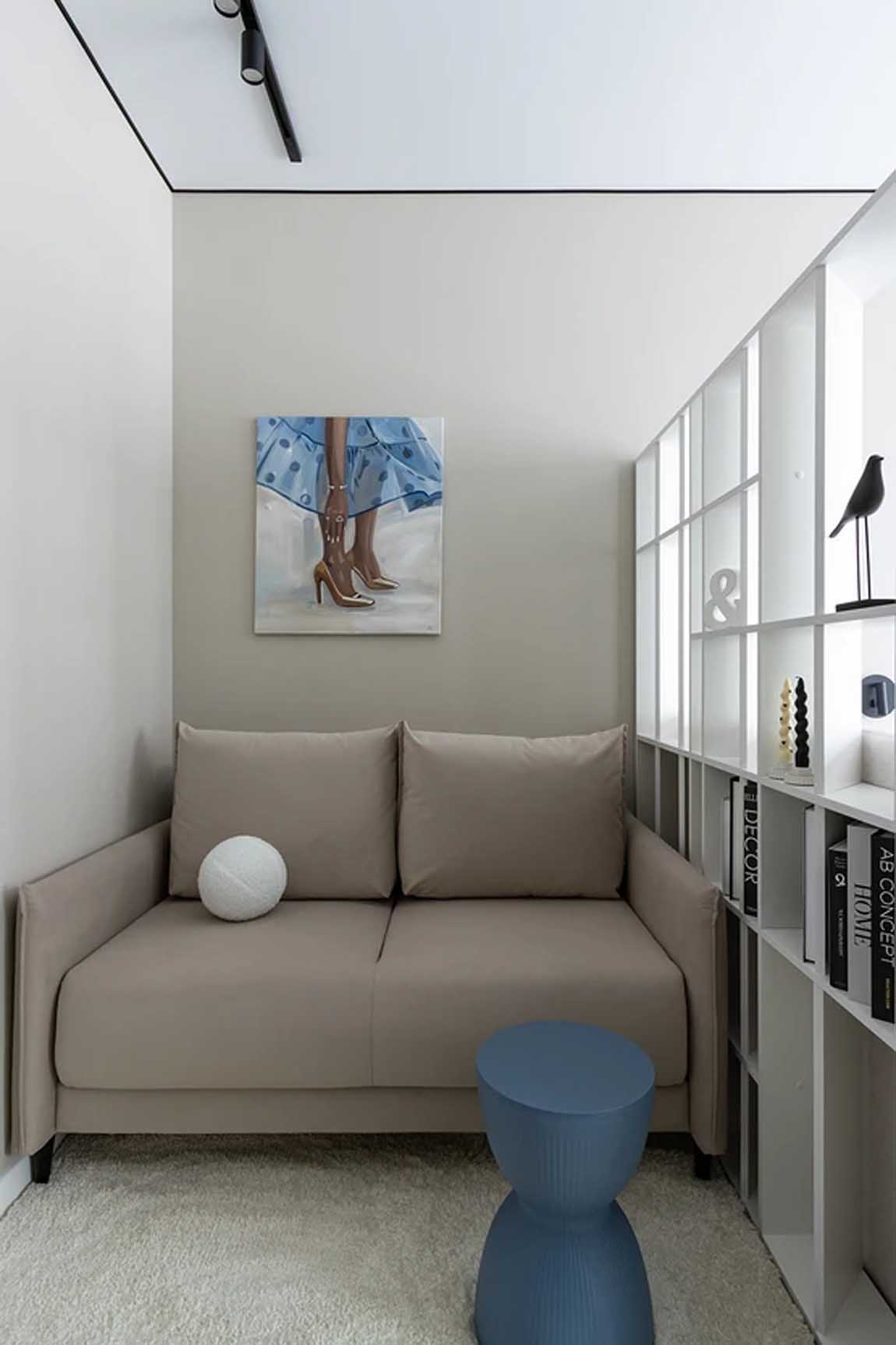 A nappali funkciót egy kompakt, de kényelmes kanapé és egy kisméretű, figyelemfelkeltő formájú dohányzóasztal látja el. A falon lévő festmény és a nyitott polcrendszeren elhelyezett dekorációk adják a tér személyes jellegét. A semleges bézs és szürke színeket egy-egy élénkebb kék kiegészítő dobja fel.