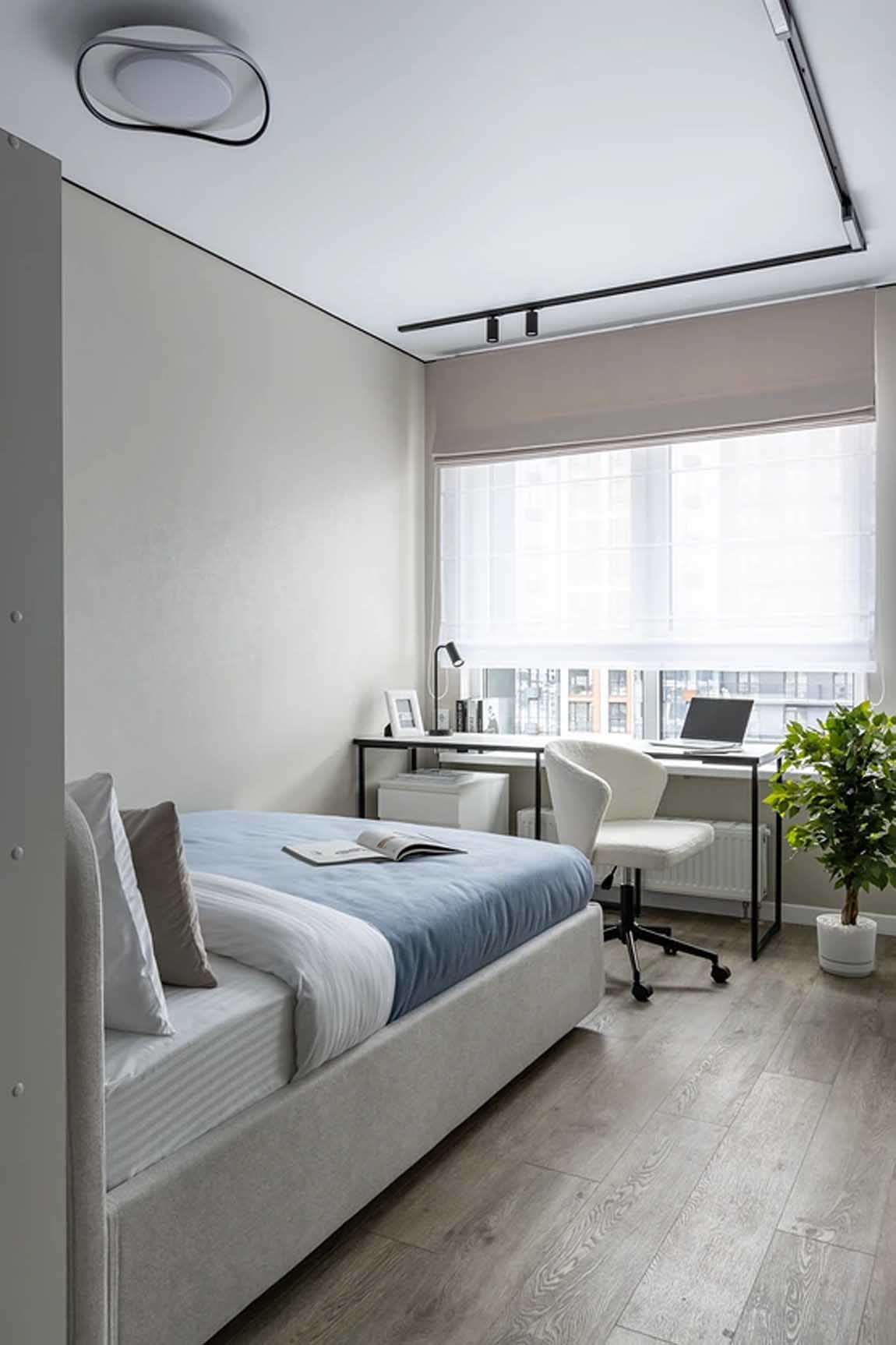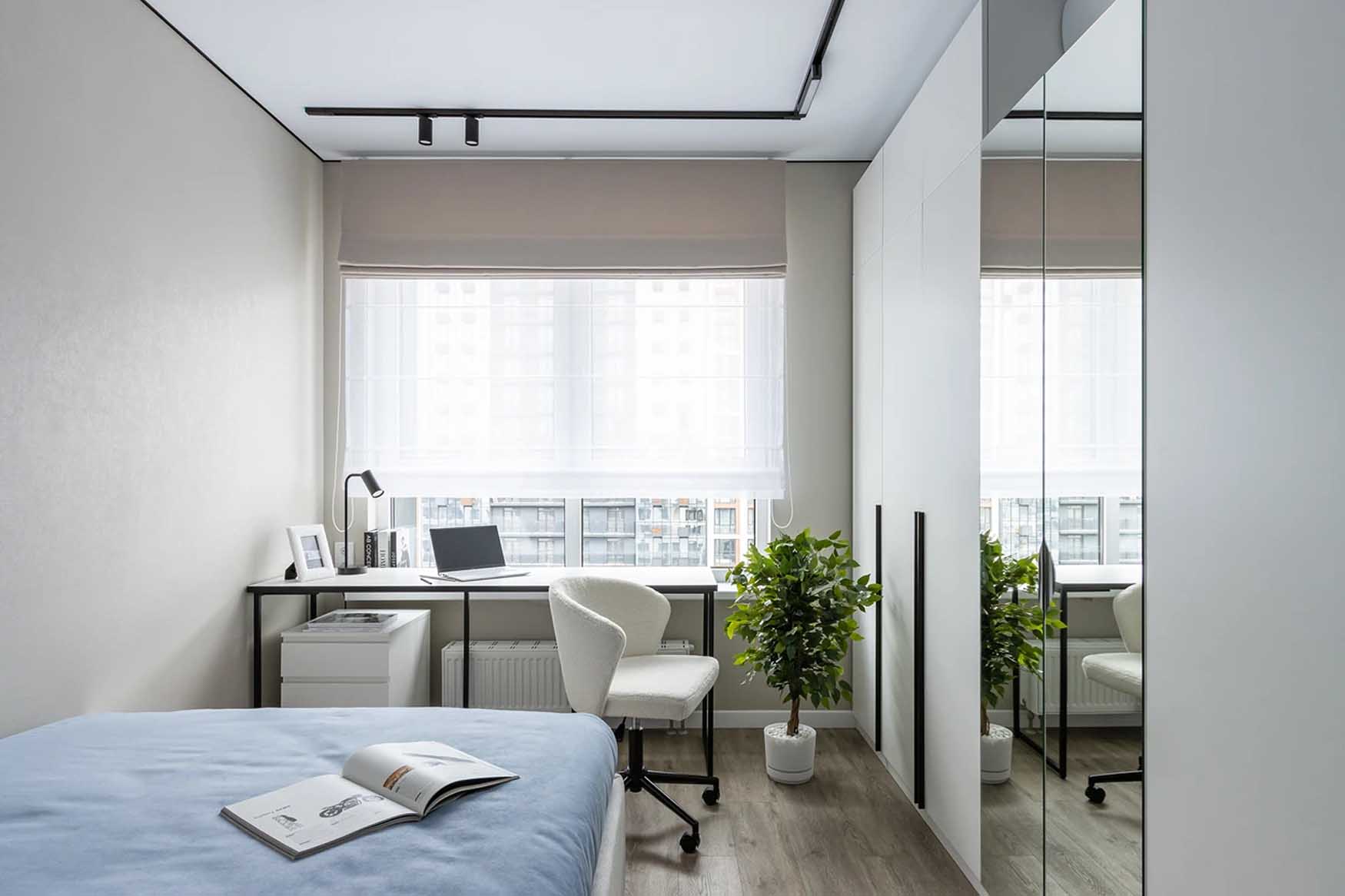 A lakótér másik felét a háló és a dolgozósarok foglalja el. A két funkciót egy nyitott polcrendszer választja el a nappalitól. Az ágy mellett, az ablak alatt egy vékony fémvázas íróasztal kapott helyet, amely otthoni tanuláshoz ideális. A tárolásról itt is egy nagyméretű, tükrös gardróbszekrény gondoskodik.