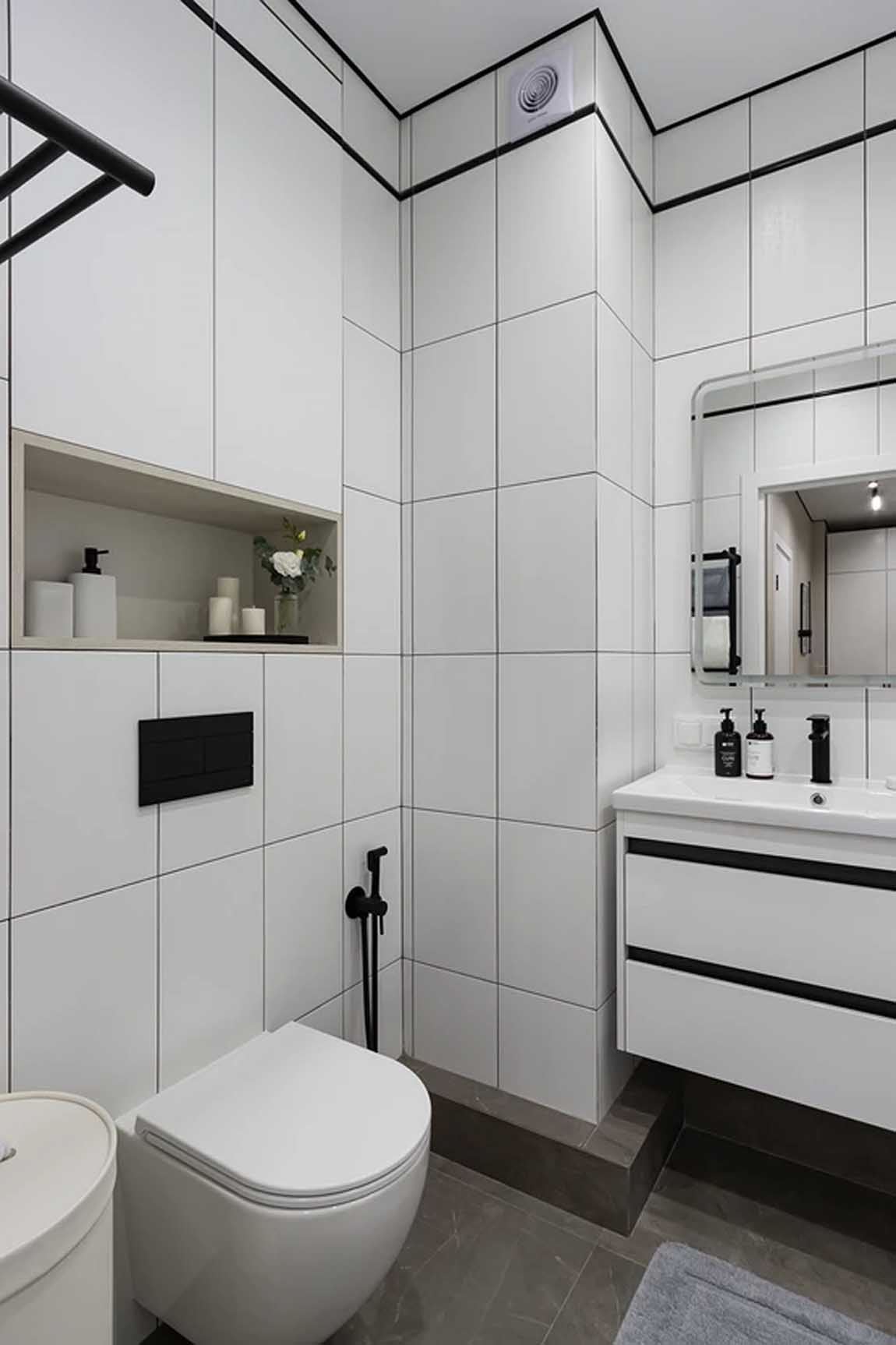 A fürdőszoba dizájnja a lakás többi részének grafikus jellegét visszhangozza. A falakon álló formátumú fehér csempe fut körbe, amelyet fekete élek és kiegészítők hangsúlyoznak. A fekete szín következetesen visszaköszön a csaptelepeken, a zuhanyrendszeren, a mosdó alatti szekrény fogantyúin és még a WC-nyomólapon is. A beépített öblítőtartály miatt kialakult mélyebb falba süllyesztett tárolófülke letisztult és praktikus megoldás.