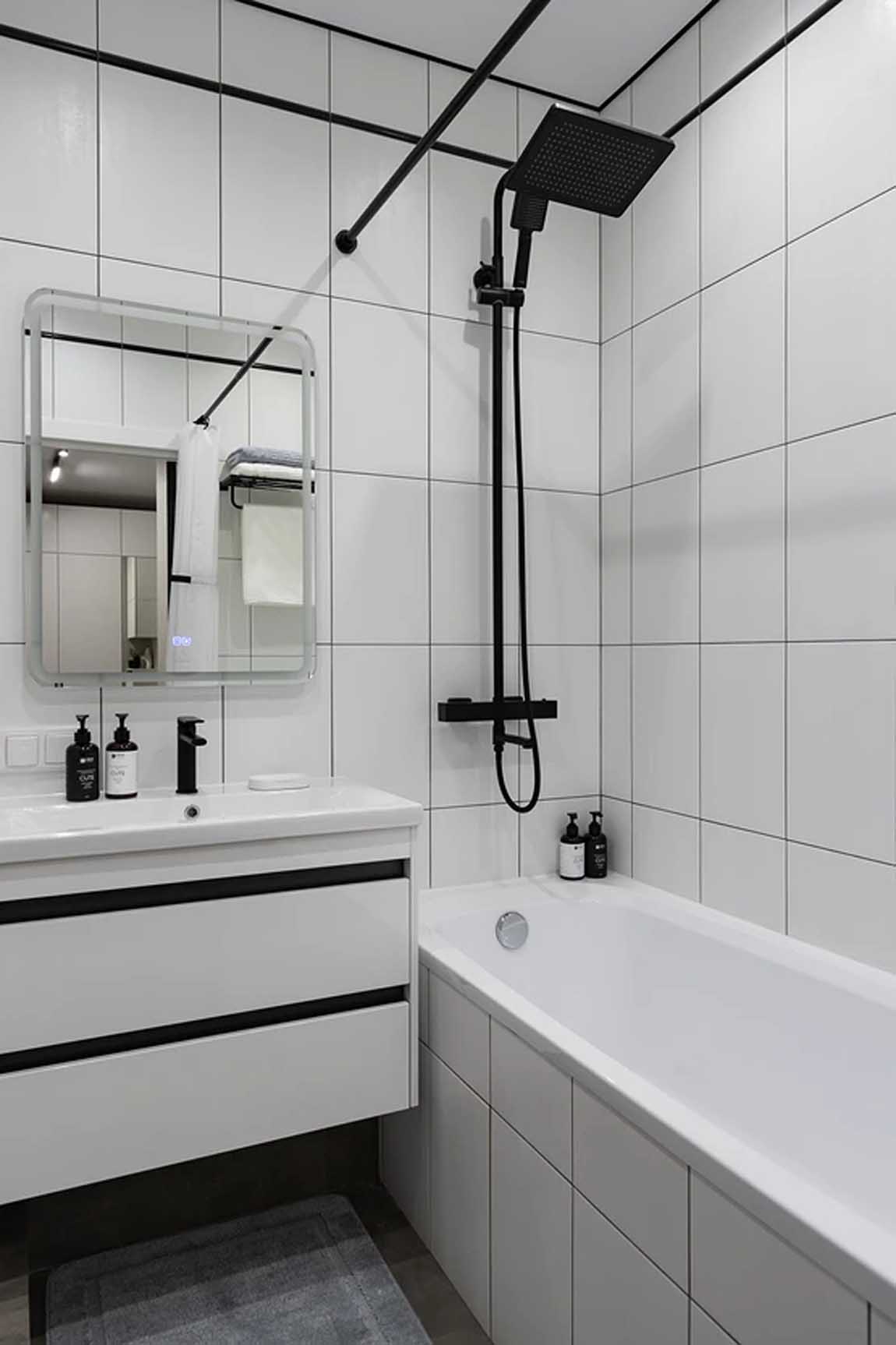 Profi Tipp: Egy egyszerű, költséghatékony fehér csempe is lehet látványos. A trükk a kiegészítőkben rejlik: egy alap fehér burkolatot fekete csaptelepekkel és kiegészítőkkel párosítva azonnali karakteres, grafikus, modern hatást érhetünk el anélkül, hogy drága dizájner burkolatot vásárolnánk.