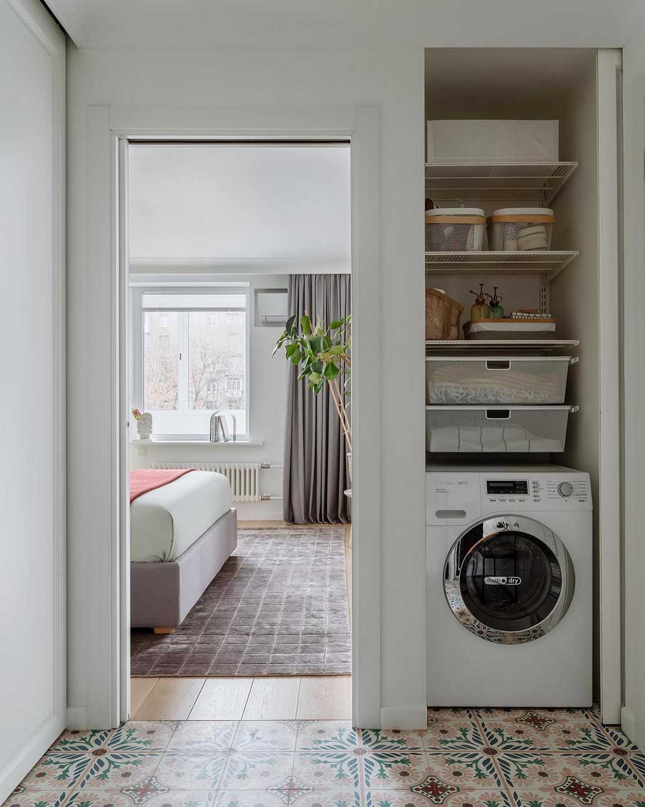 A térkihasználás remek példája a szoba és a fürdő bejárata közötti falmélyedésben kialakított technikai szekrény, amelyben diszkréten bújik meg a mosó- és szárítógép, valamint a takarítószerek tárolója.