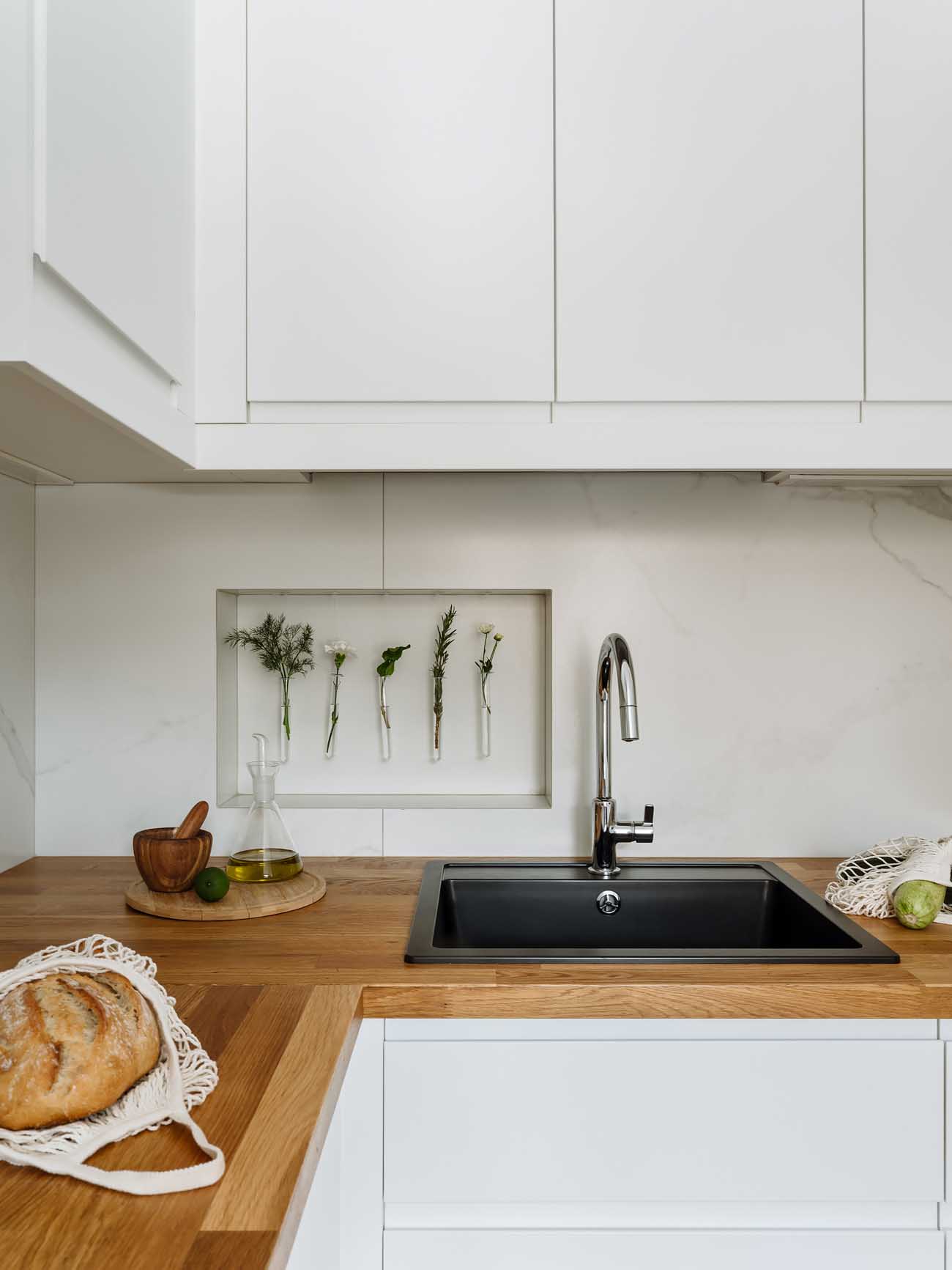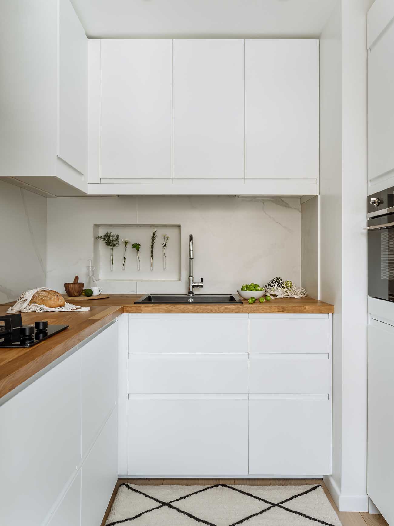 A konyha megközelítése jól záródó tolóajtón keresztül történik, ami megfelel a gázüzemű konyhákra vonatkozó előírásoknak. A teret falrészekkel tagolták, így az étkezősarok – ahol egy kényelmes kanapé, asztal és szék kapott helyet – és a főzőzóna is megőrzi intimitását. Ez a zónázás tette lehetővé a gázcső elrejtését is, amely így nem rontja az esztétikai összképet, de a tűzhely mellett hozzáférhető maradt. A munkaterület L-alakú elrendezést követ, a beépített hűtőszekrény, a mikrohullámú sütő és a mosogatógép a mennyezetig érő, nagy befogadóképességű szekrényekben rejtőzik. A kialakított falfülkében élő növények teszik teljessé a természetközeli összképet.