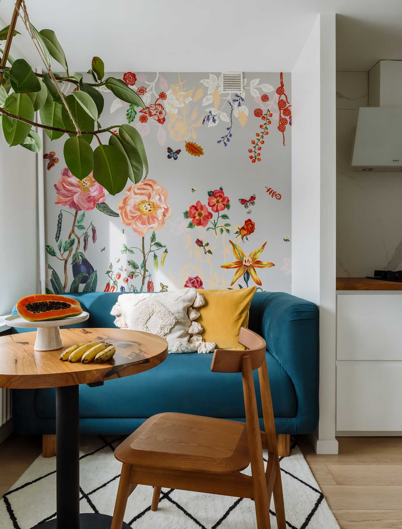 Az étkező / pihenő zónában a dekoráció hangsúlyos: a falat nagy mintás, virágos tapéta díszíti, amely rímel az előszoba burkolatának vidámságára,