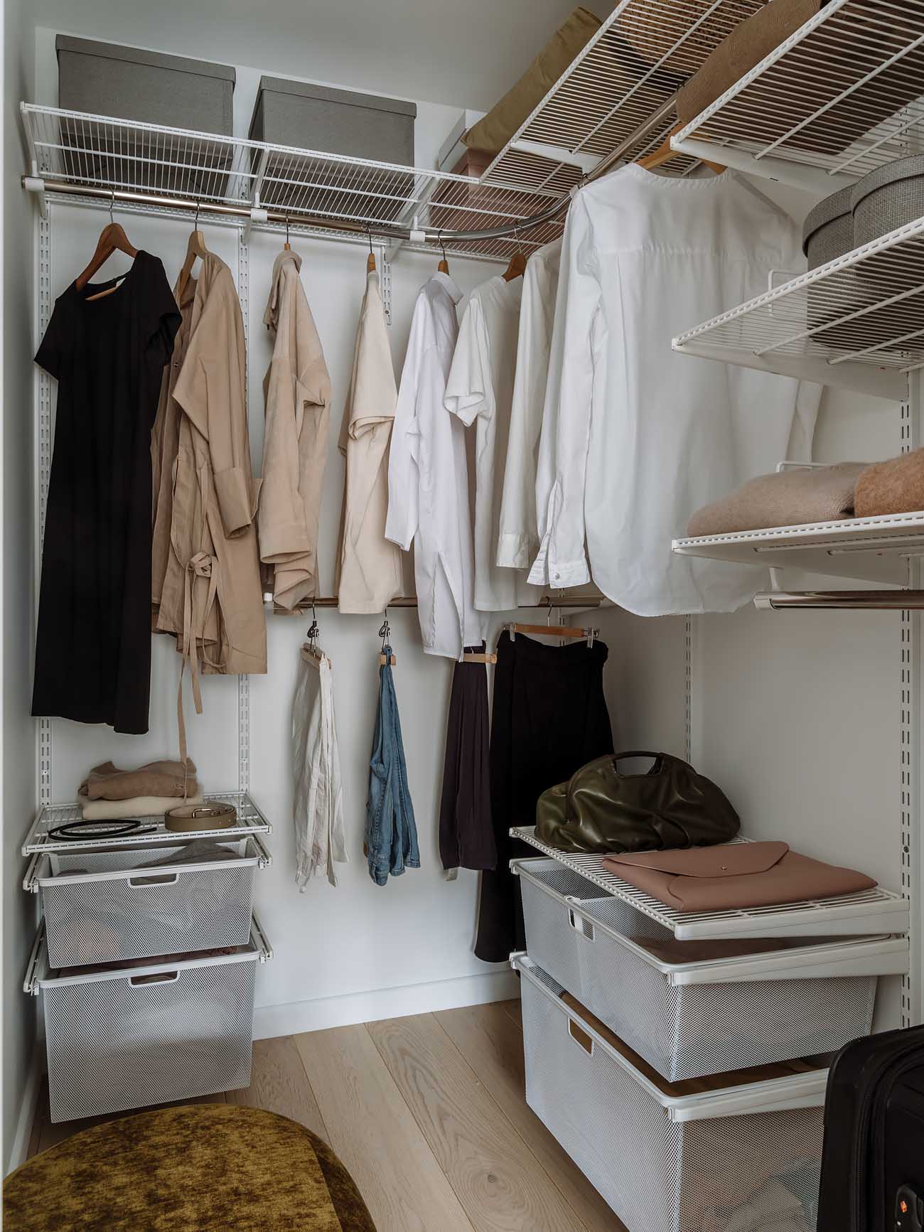 A lakás központi helyiségéből nyílik egy külön gardróbhelyiség a ruházat tárolására, így a fő lakótér mentesül a nagy, nyomasztó szekrényektől. A tér berendezése a világos alapoknak és a gondosan megválasztott textíliáknak köszönhetően szellős maradt, teljesítve a tulajdonos vágyát a könnyed, dél-franciaországi hangulat iránt.