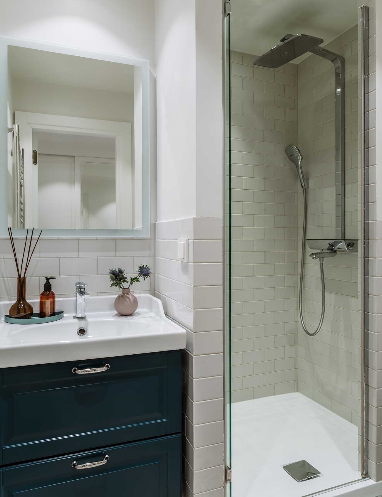A fürdőszobában a már említett, az előszobából átvezetett egységes padlóburkolat dominál. A világos falak és a minimálisra csökkentett anyaghassználati törések itt is azt a célt szolgálják, hogy a kis alapterület ellenére a tér tágasnak és egységesnek hasson.